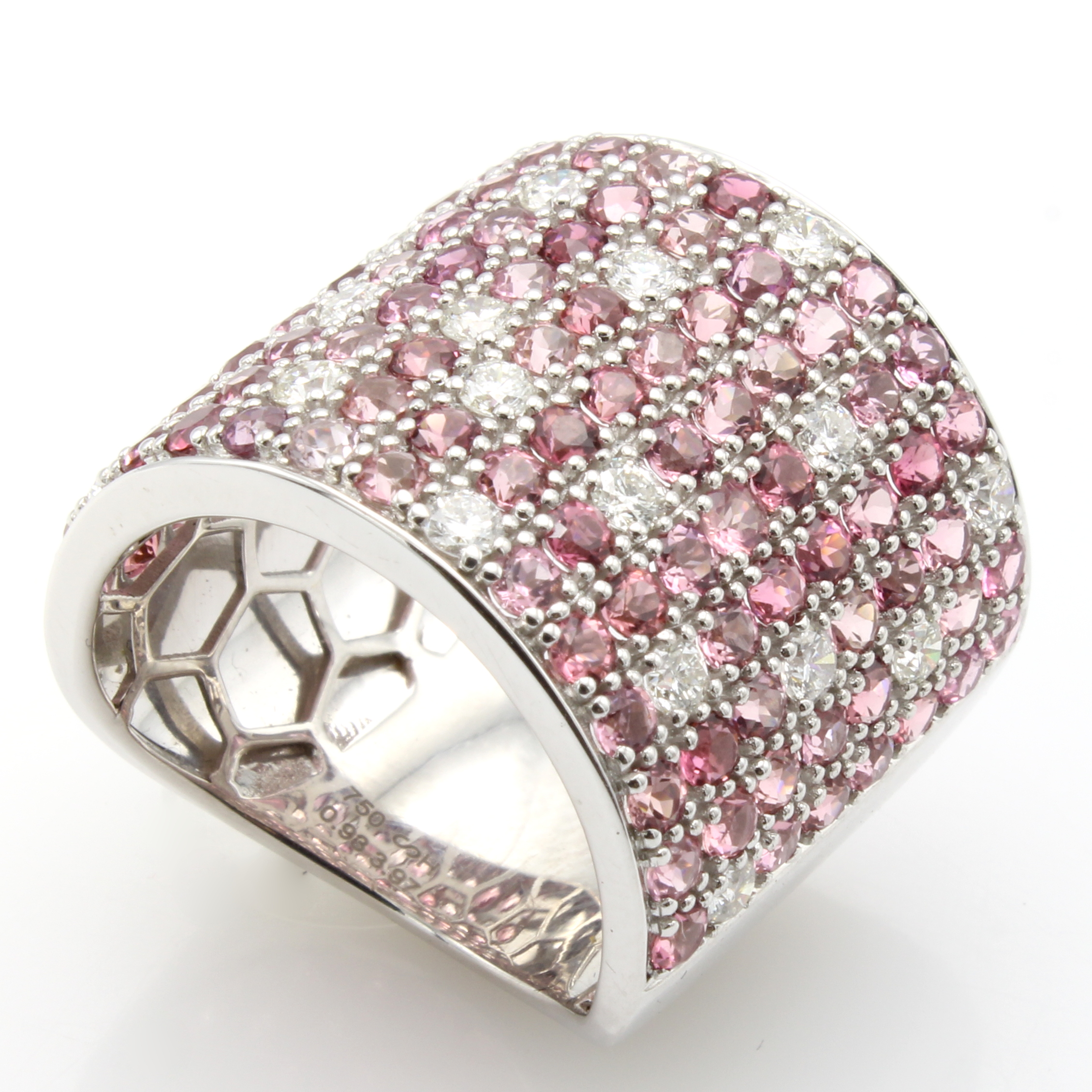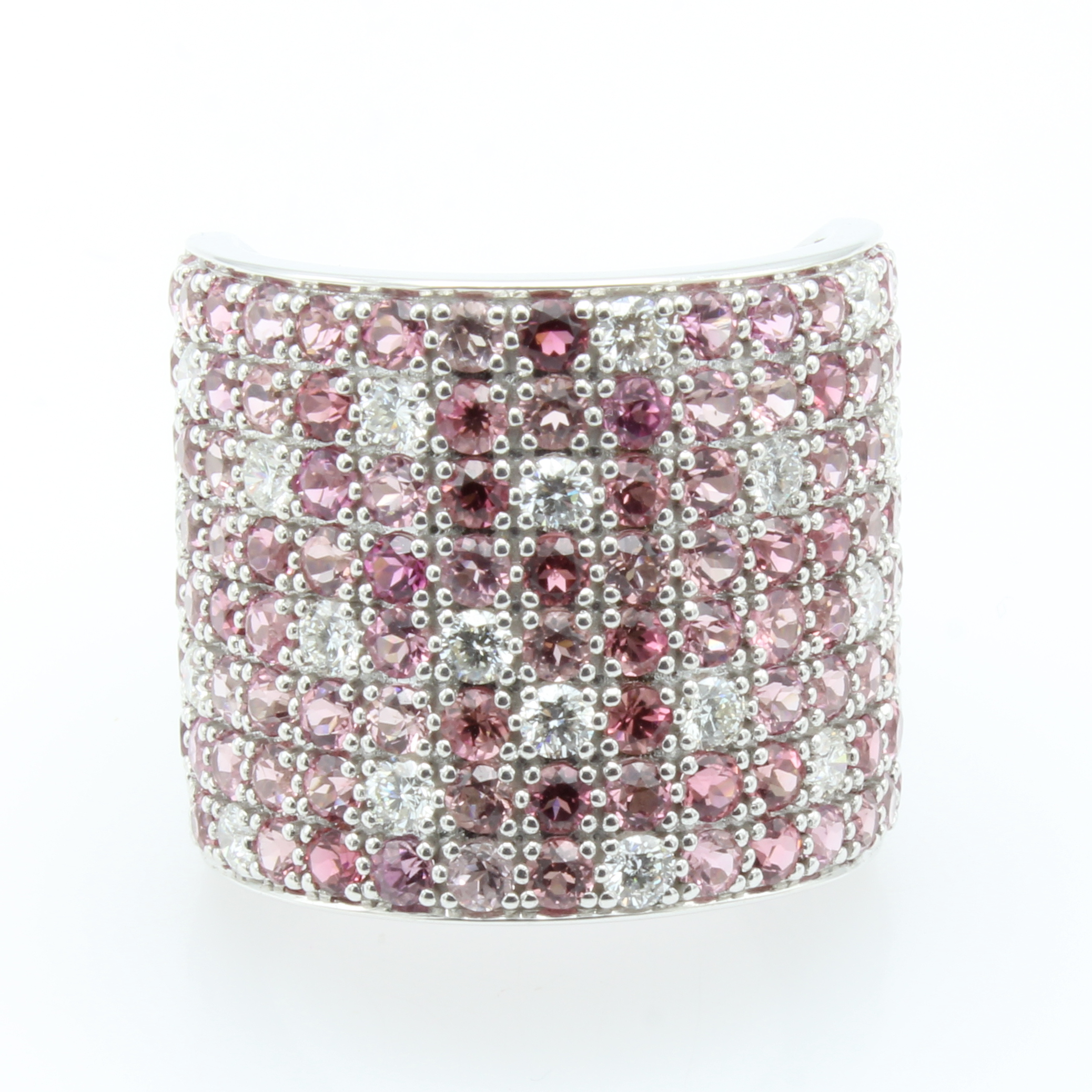 Ring mit Turmalinen und Brillanten, WG 750/ 000, 20 Brill. zus. ca. 0.93 ct feines Weiß/vs-p, 100 pinkfarb. Turmaline zus. ca. 3.97 ct, RW ca. 55+ Schätzpreis: 6100, - EUR
