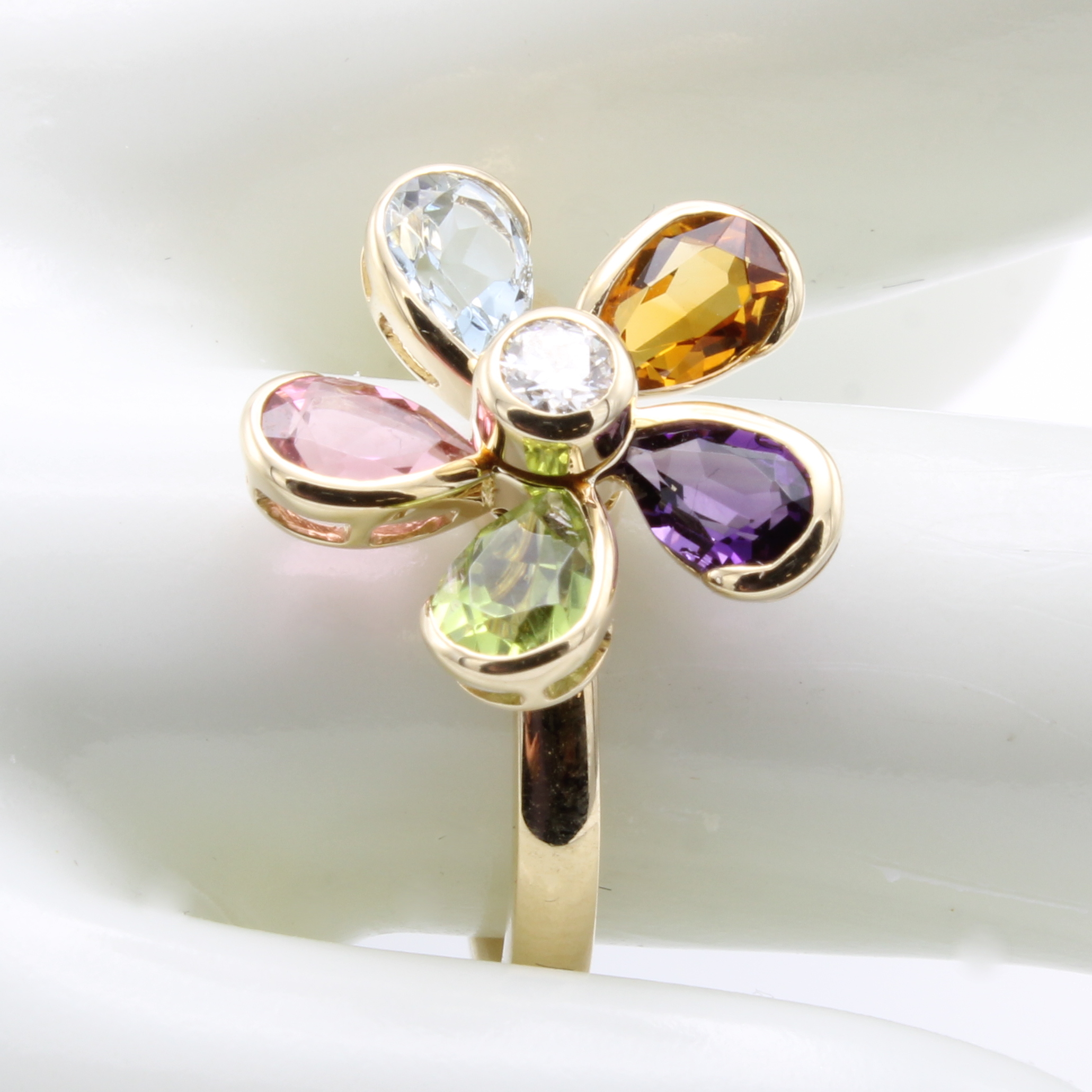 Ring "Blüte" mit Farbsteinen und Brillant, GG 585/000, Brill. ca. 0.11 ct Weiß/si-p, Farbsteine zus. ca. 2.53 ct, drehbar, RW ca. 55 Schätzpreis: 1850, - EUR