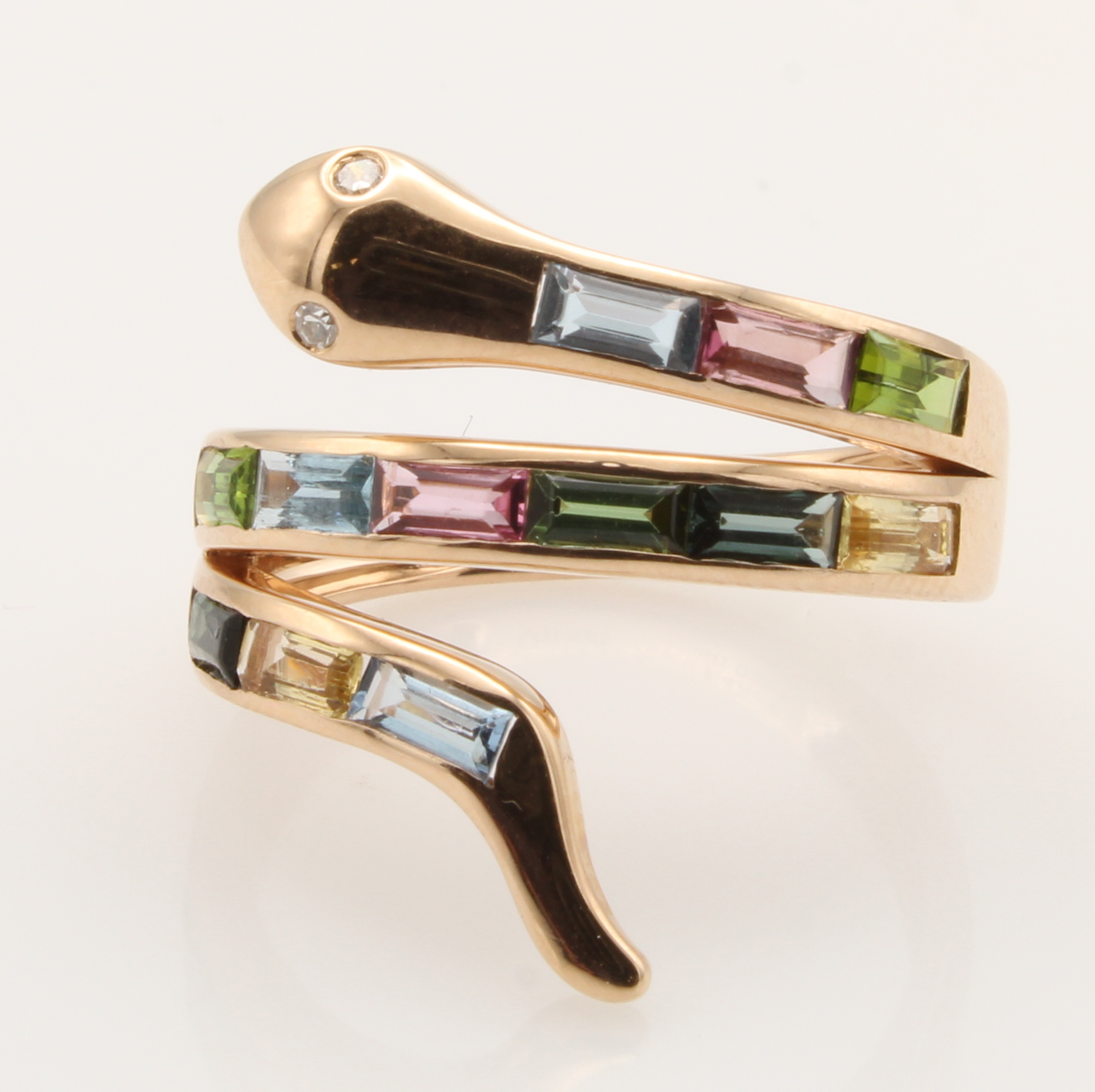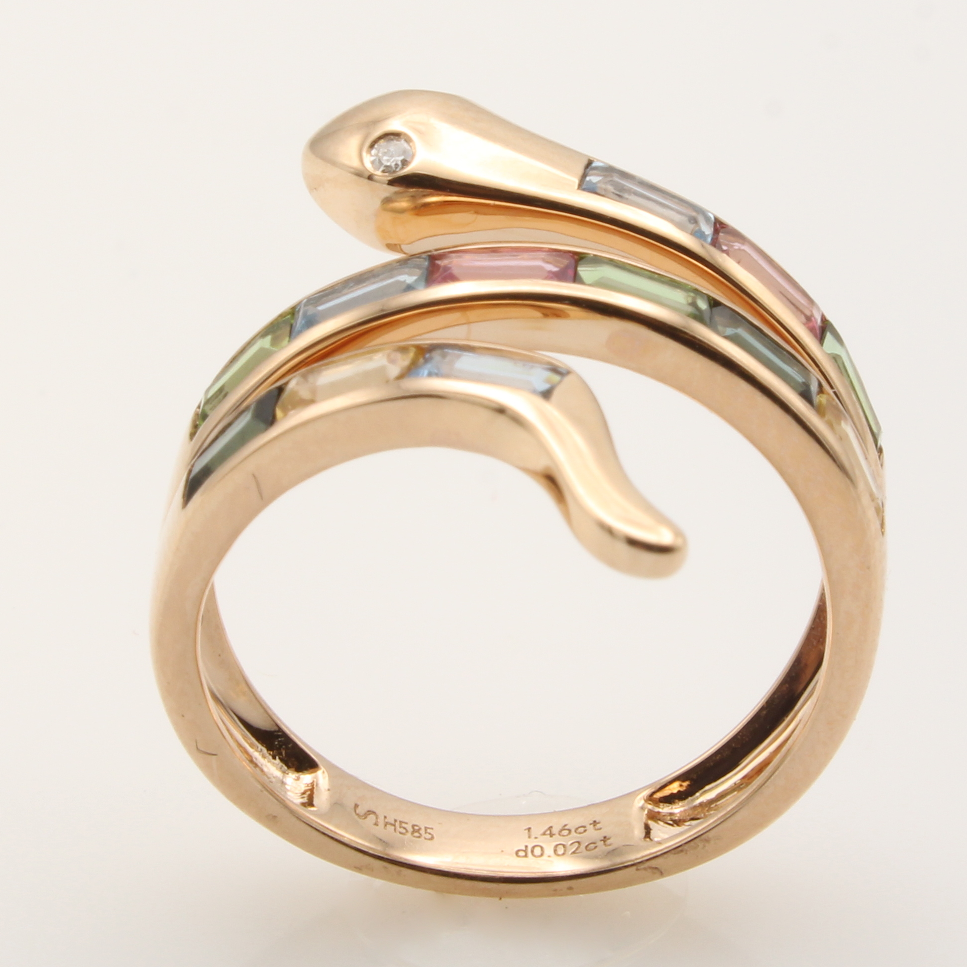 Ring "Schlange" mit Brillanten und Farbsteinen, RoséG 585/000, 2 Brill. als Augen gef. zus. ca. 0.02 ct Weiß/si-p, diverse Farbsteinezus. ca. 1.46 ct im Baguetteschliff, RW ca. 55 Schätzpreis: 1990, - EUR