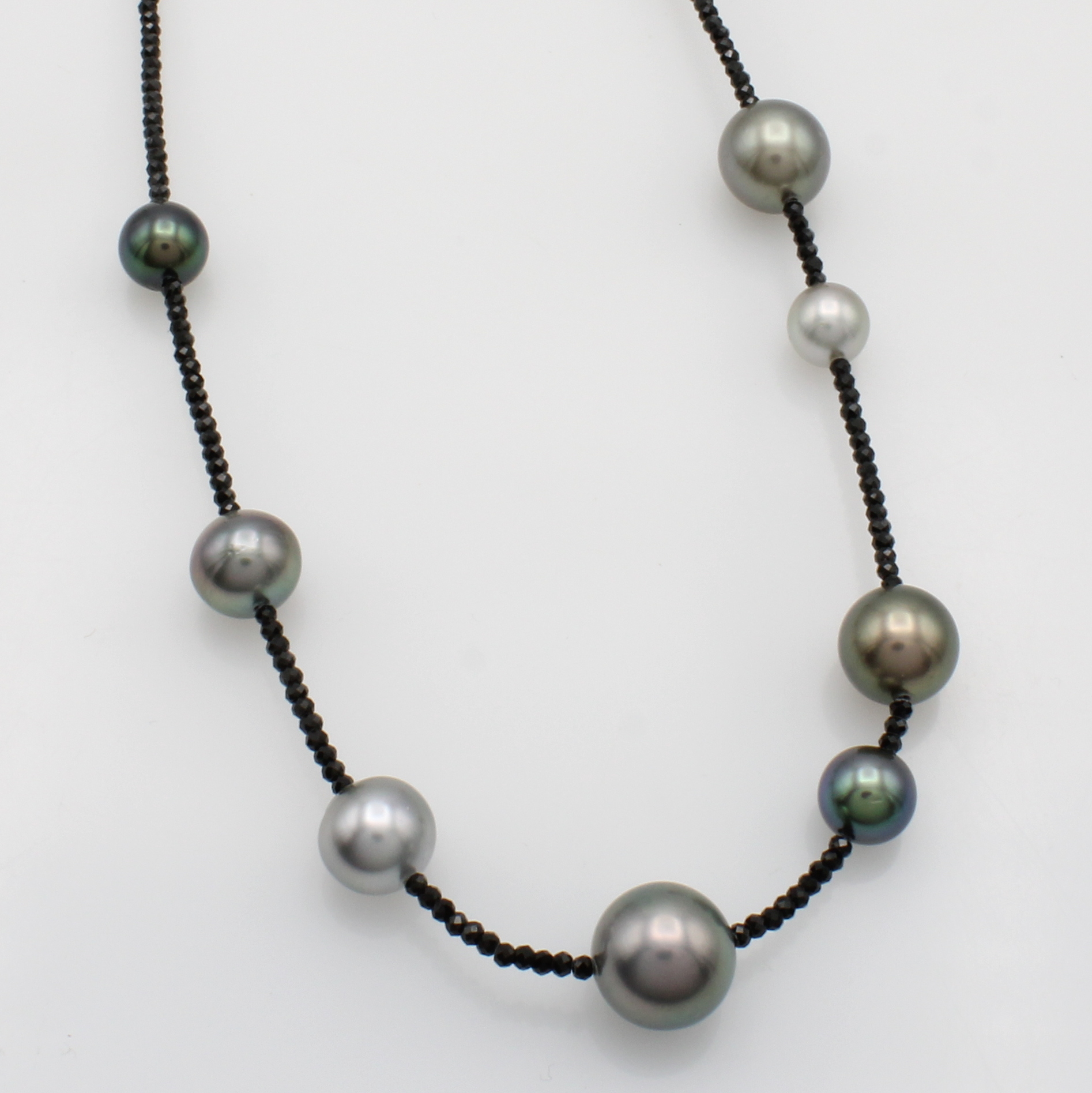 Collier aus Spinellen und Tahitizuchtperlen, Karabinerschl. Silber, 8 Tahitiperlen in versch. Farben ca. 8 - 11 mm, facett. Spinelleschwarz (beh.), L. ca. 48 cm Schätzpreis: 1200, - EUR