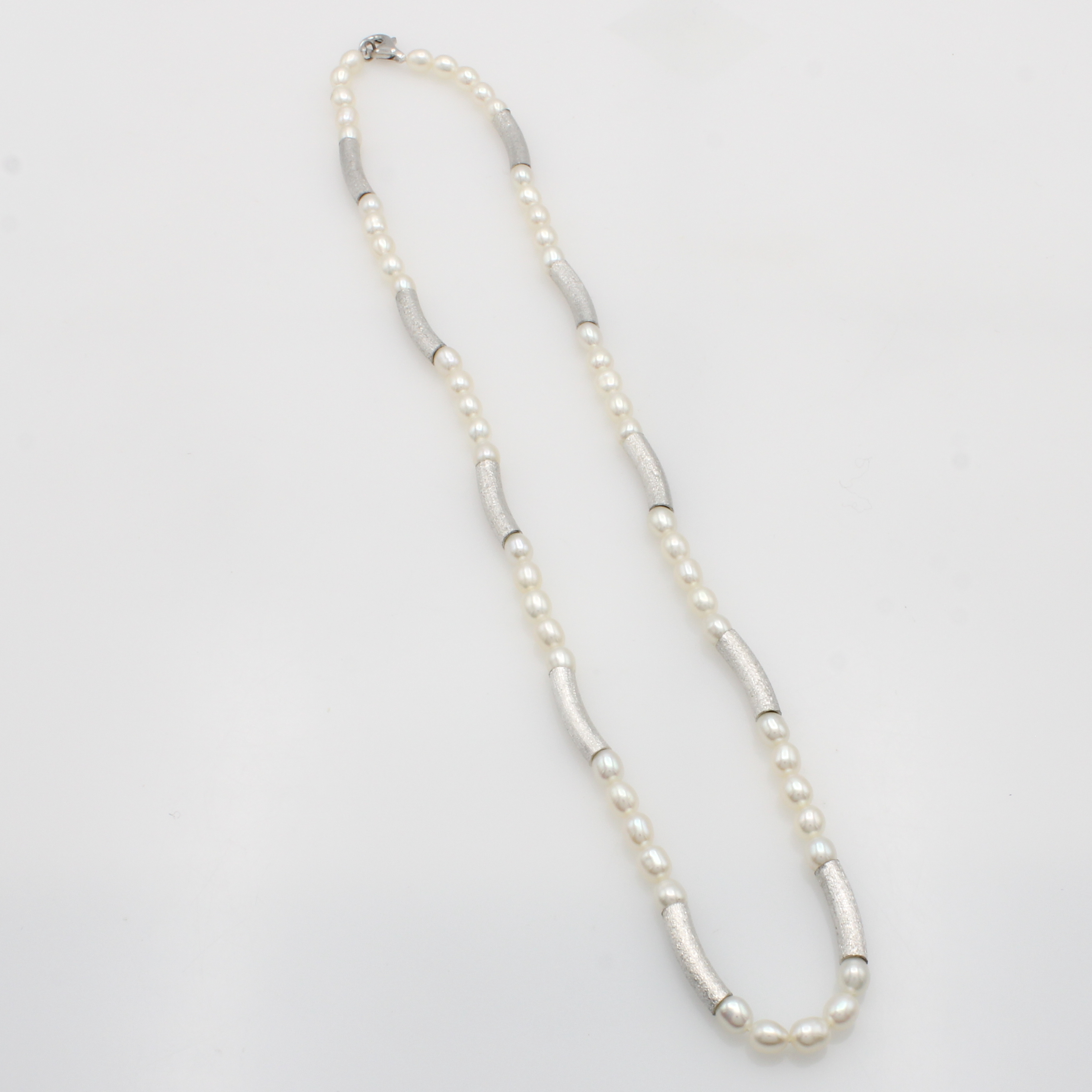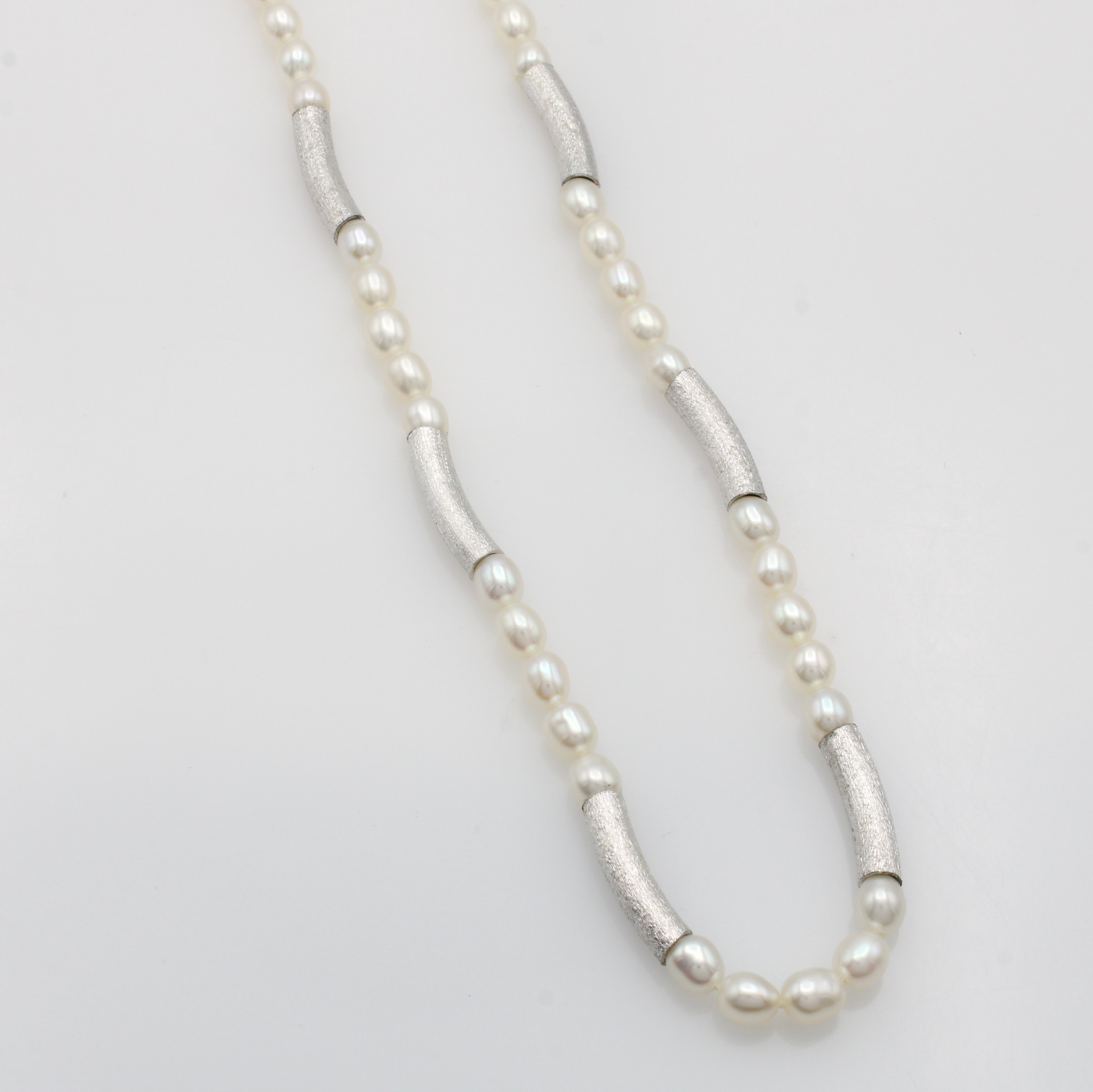 Kette aus Süßwasserzuchtperlen, Karabiner- schl. und Zwischenteile Silber, weiße Perlen ca. 4 - 5 mm, L. ca. 45 cm