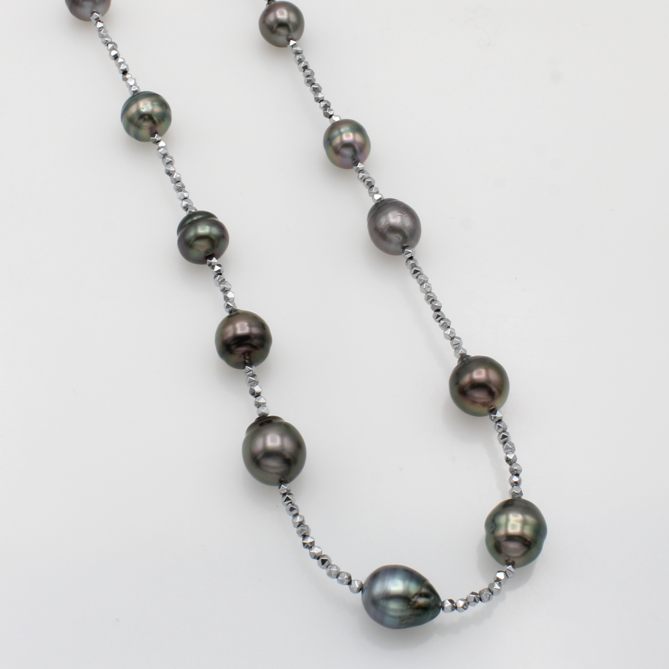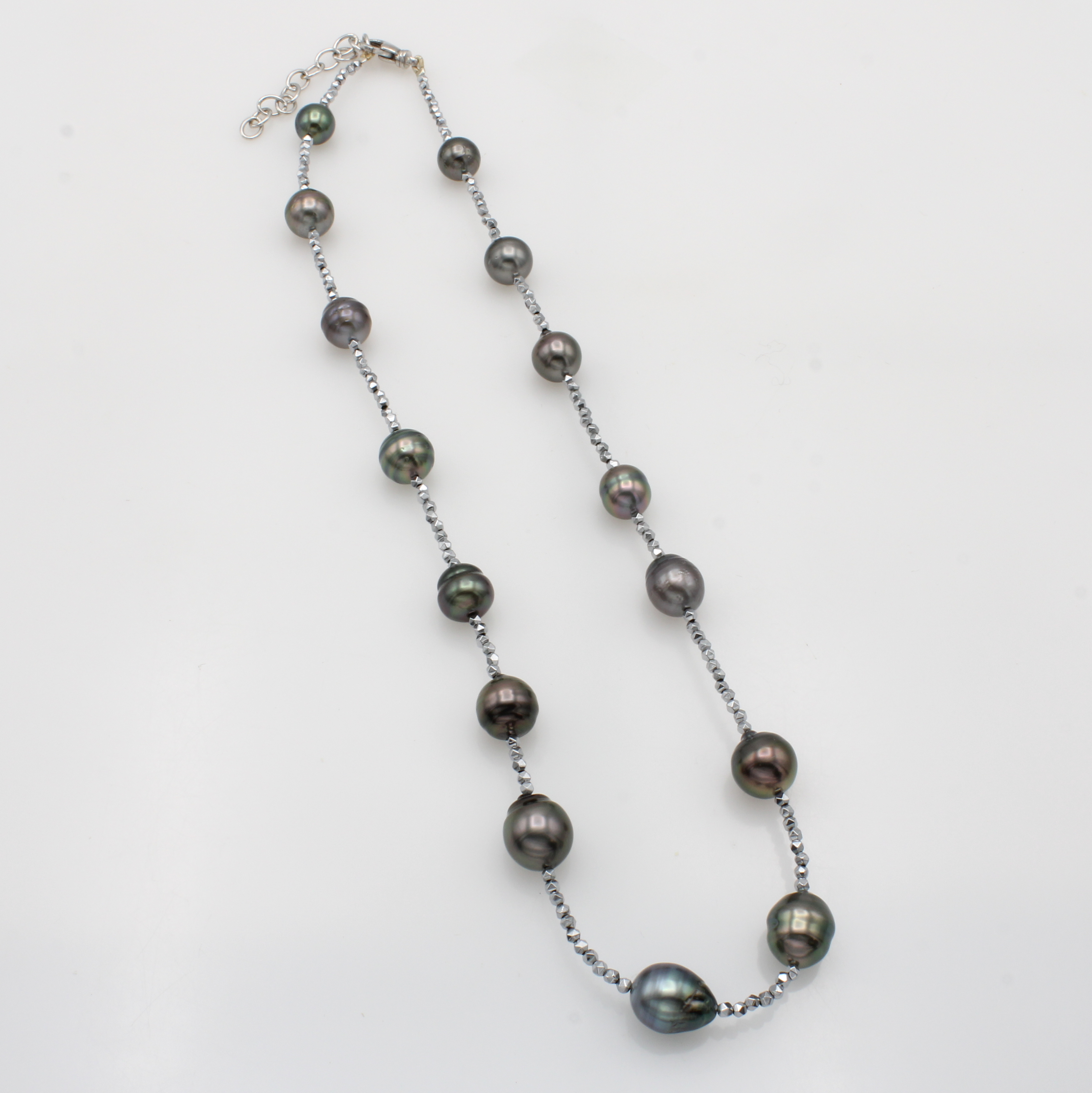 Kette aus Hämatiten und Tahitizuchtperlen, Karabinerschl. Silber, 15 barocke Perlen ca. 9 - 10 mm, L. ca. 46 - 50 cm