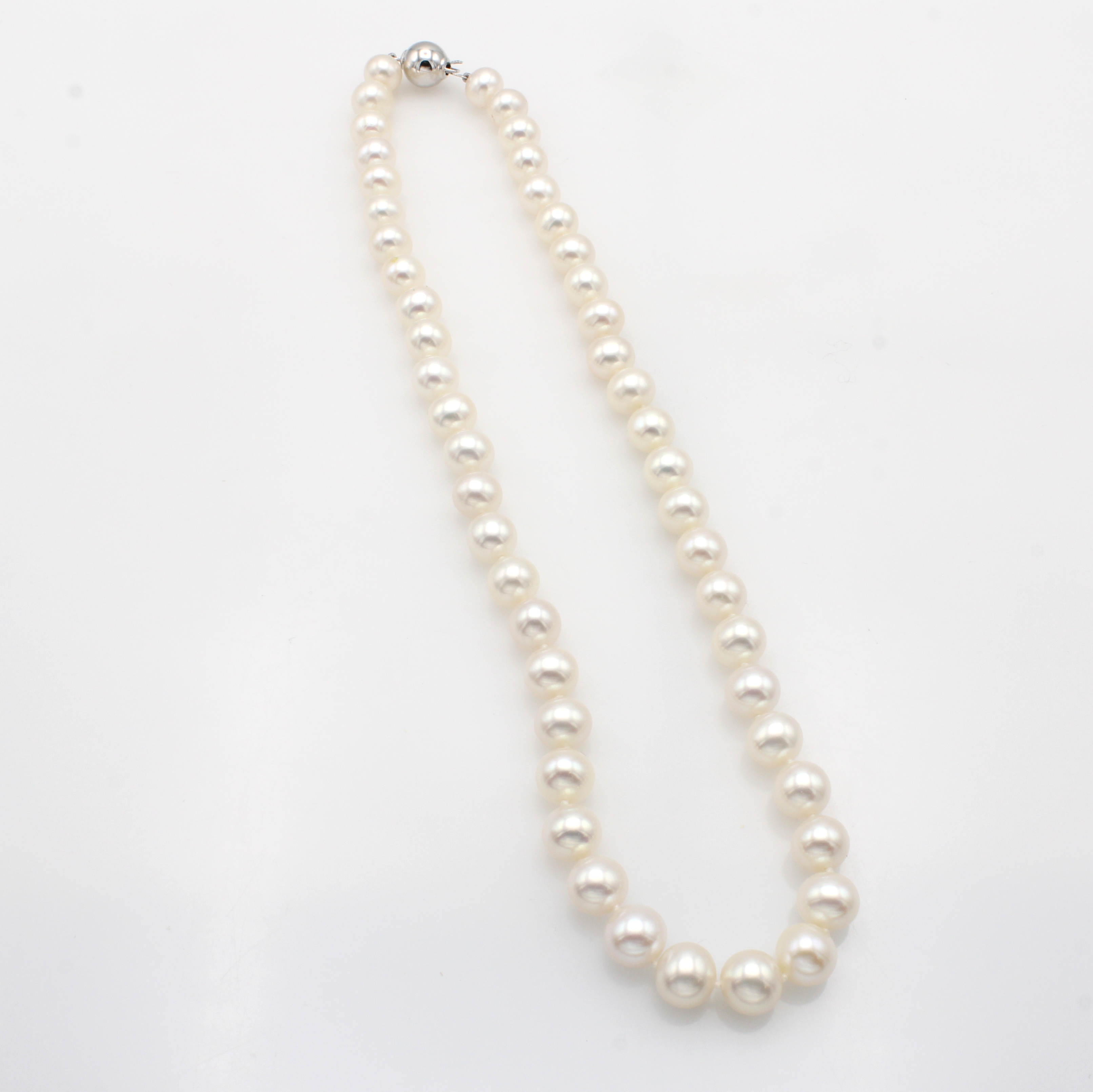 Kette aus Süßwasserzuchtperlen, Kugelschl. Silber, weiße Perlen ca. 9 - 10 mm, L. ca. 46 cm
