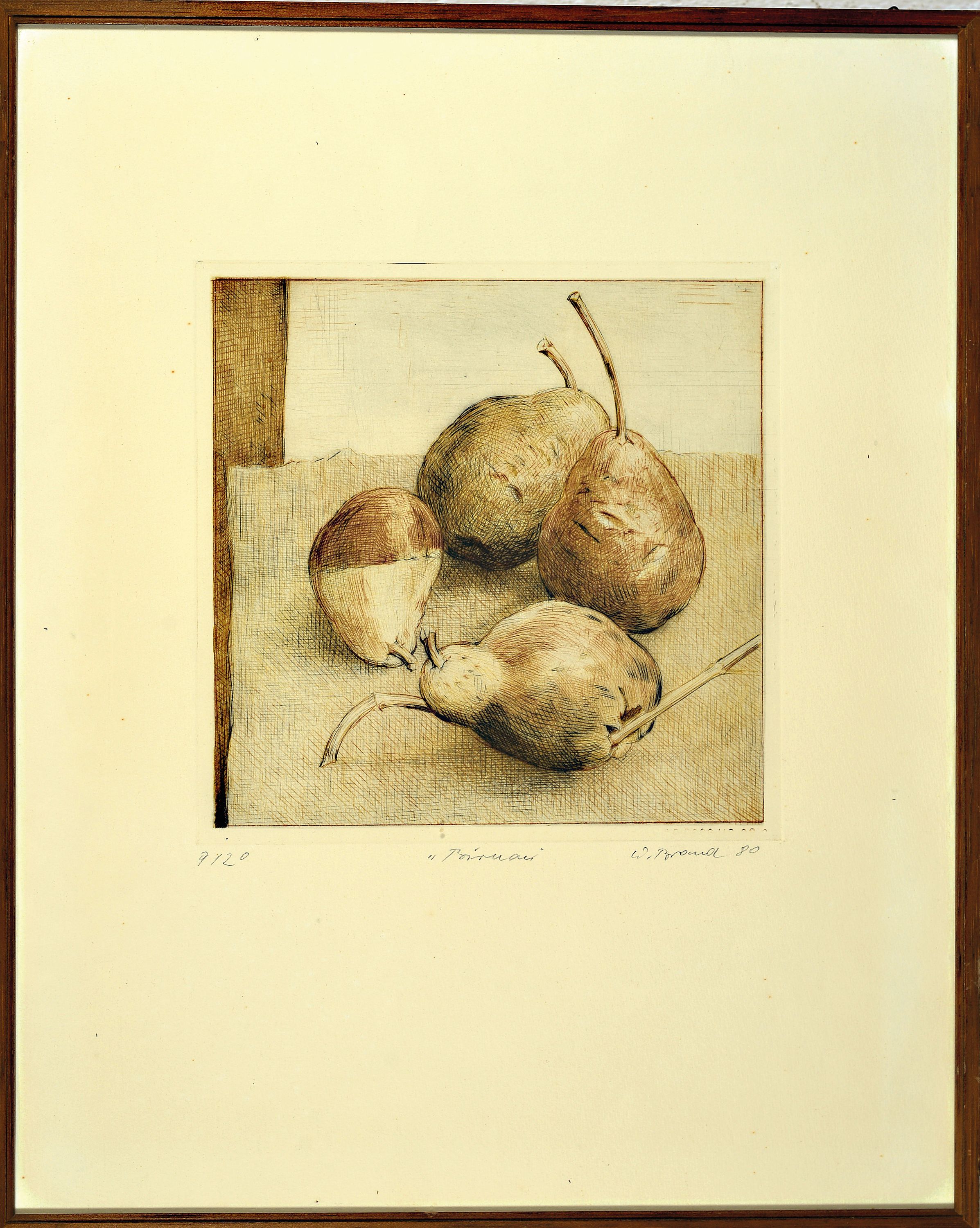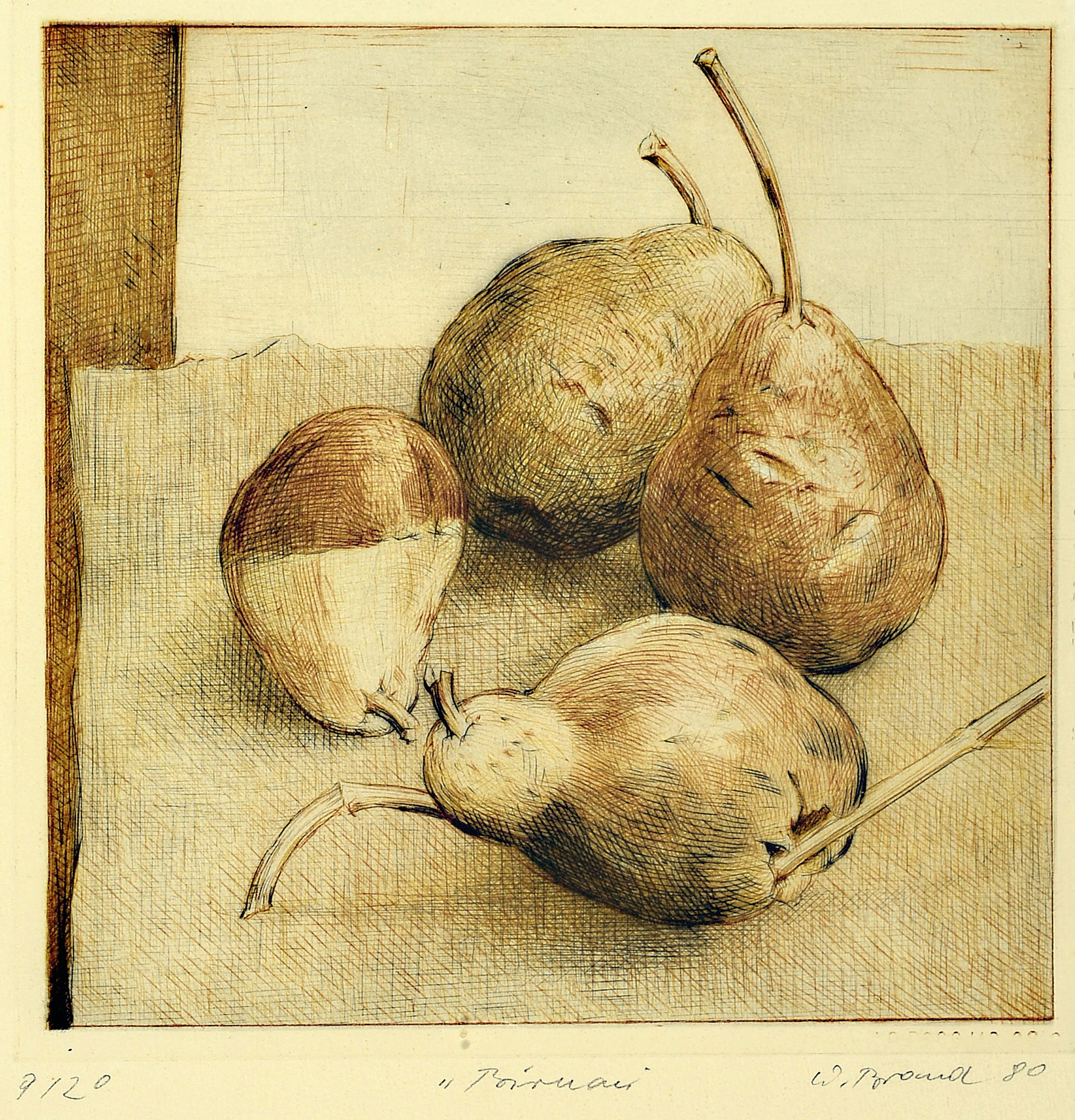 signiert und dat. 77, ca. 61 x 47 cm, drei Radierungen: "Birnen", dat. 80, 47x 37.5