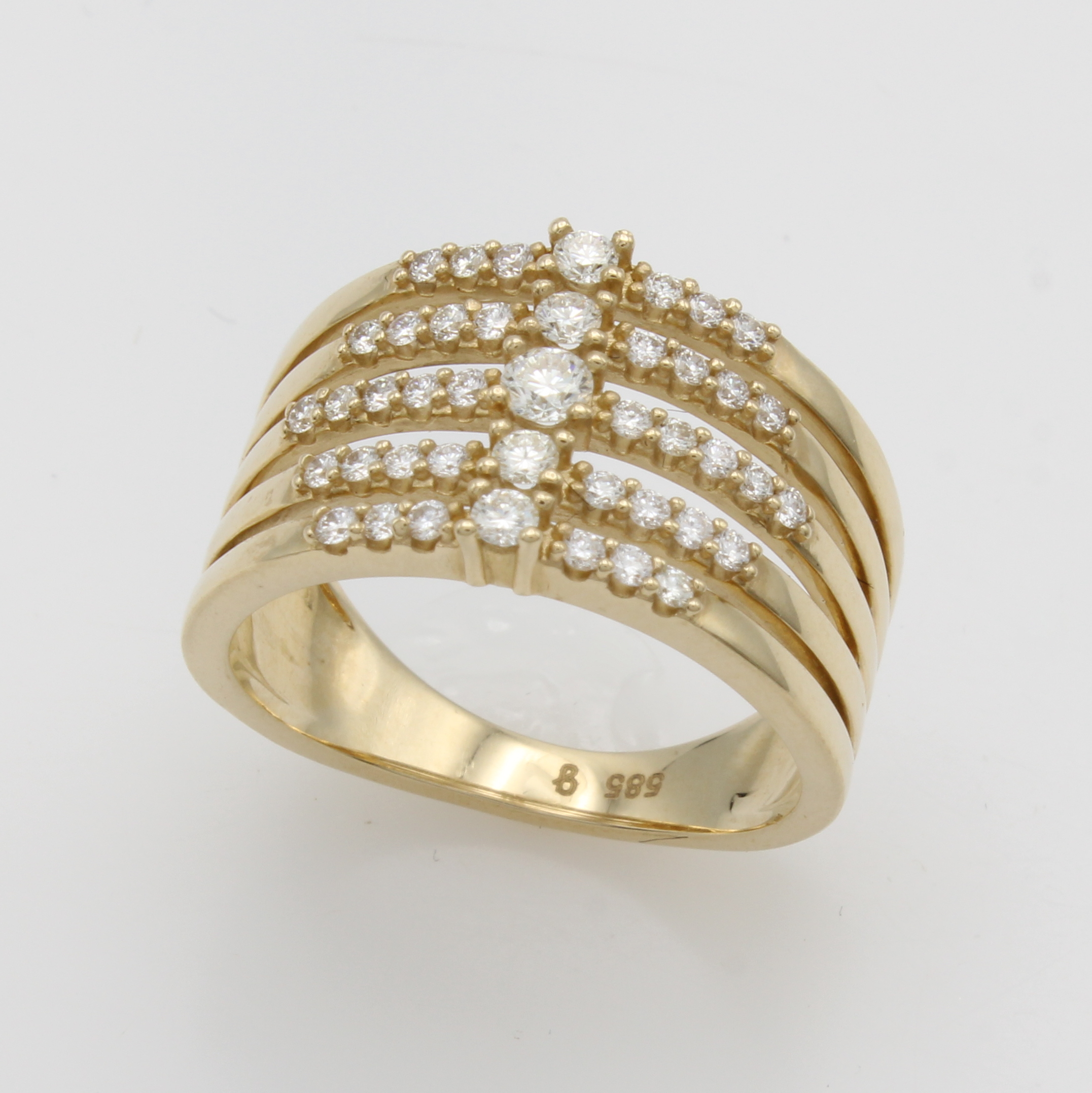 Ring mit Brillanten, GG 585/000, 5-reihige Ringschiene mit je einem Solitär und Besatz- brill. zus. ca. 0.50 ct Weiß/lupenrein, RW ca.53 Schätzpreis: 2850, - EUR