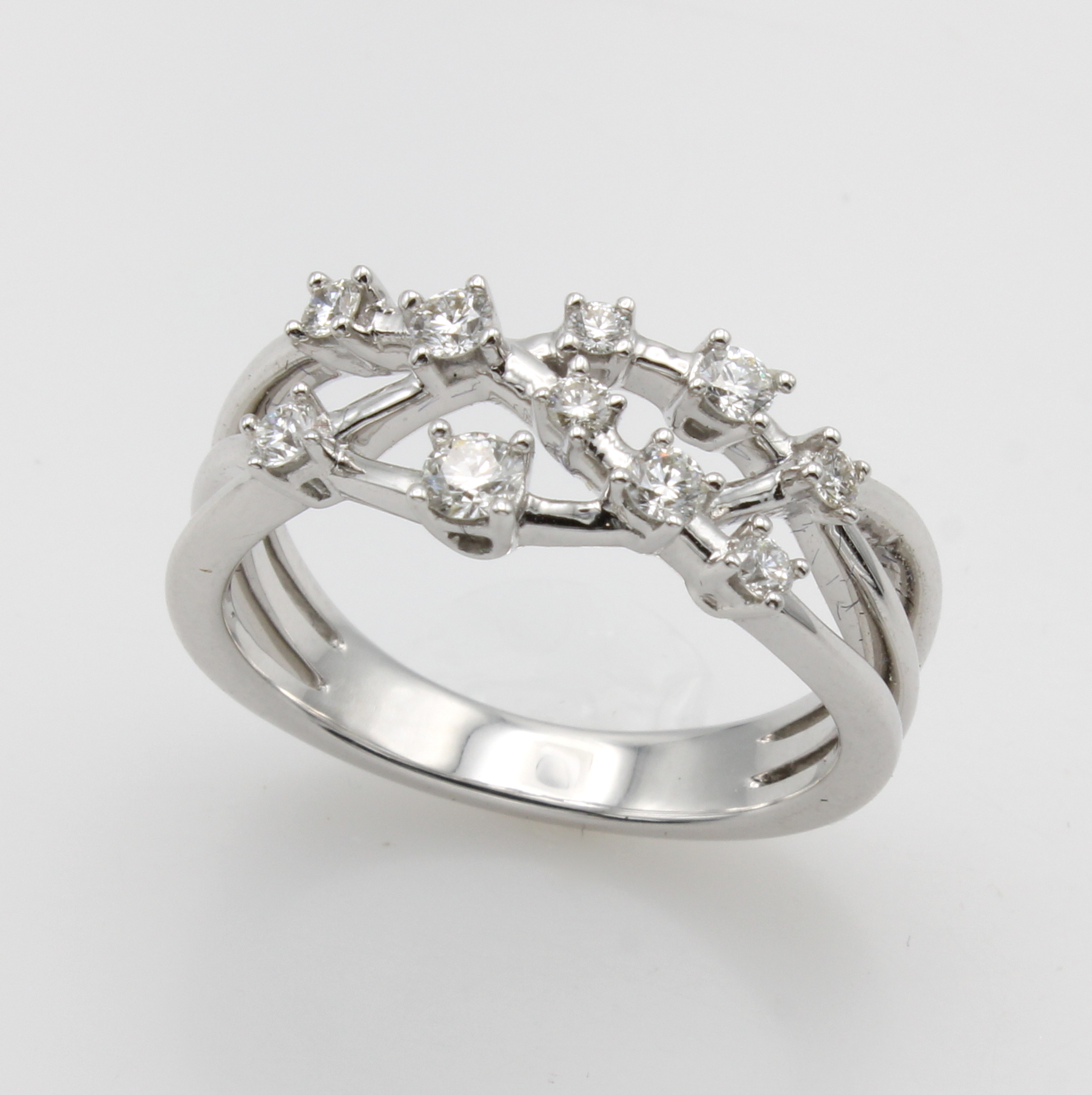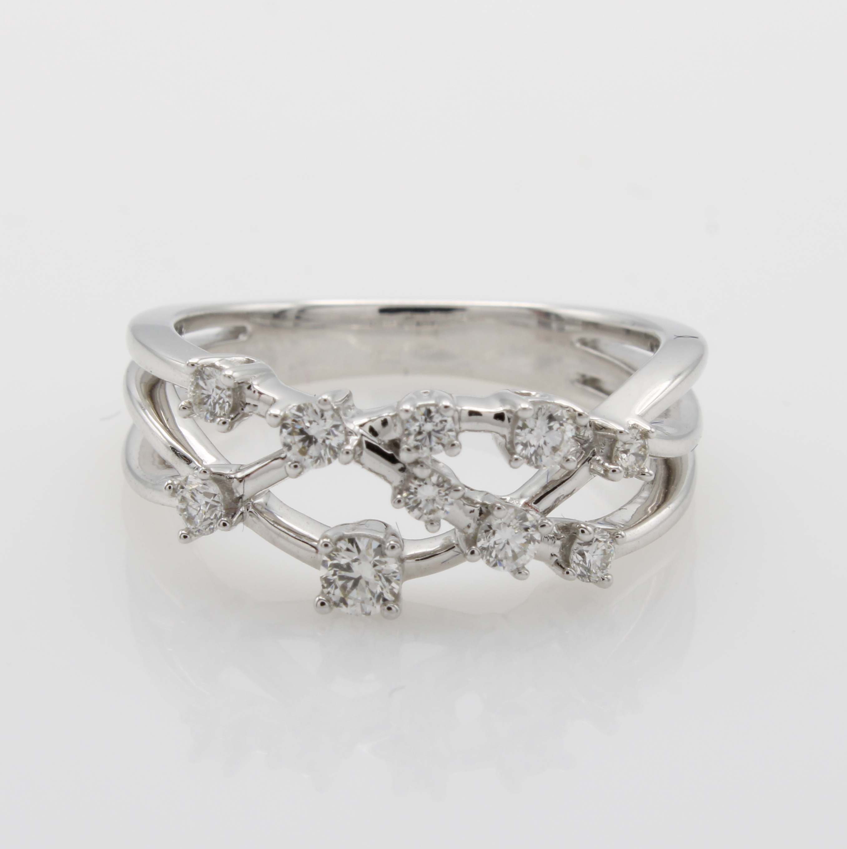 Ring mit Brillanten, WG 585/000, 3-reihig, verschlungene Schiene, 10 Brill. zus. ca. 0.30ct Weiß/si, RW ca. 52 Schätzpreis: 2150, - EUR