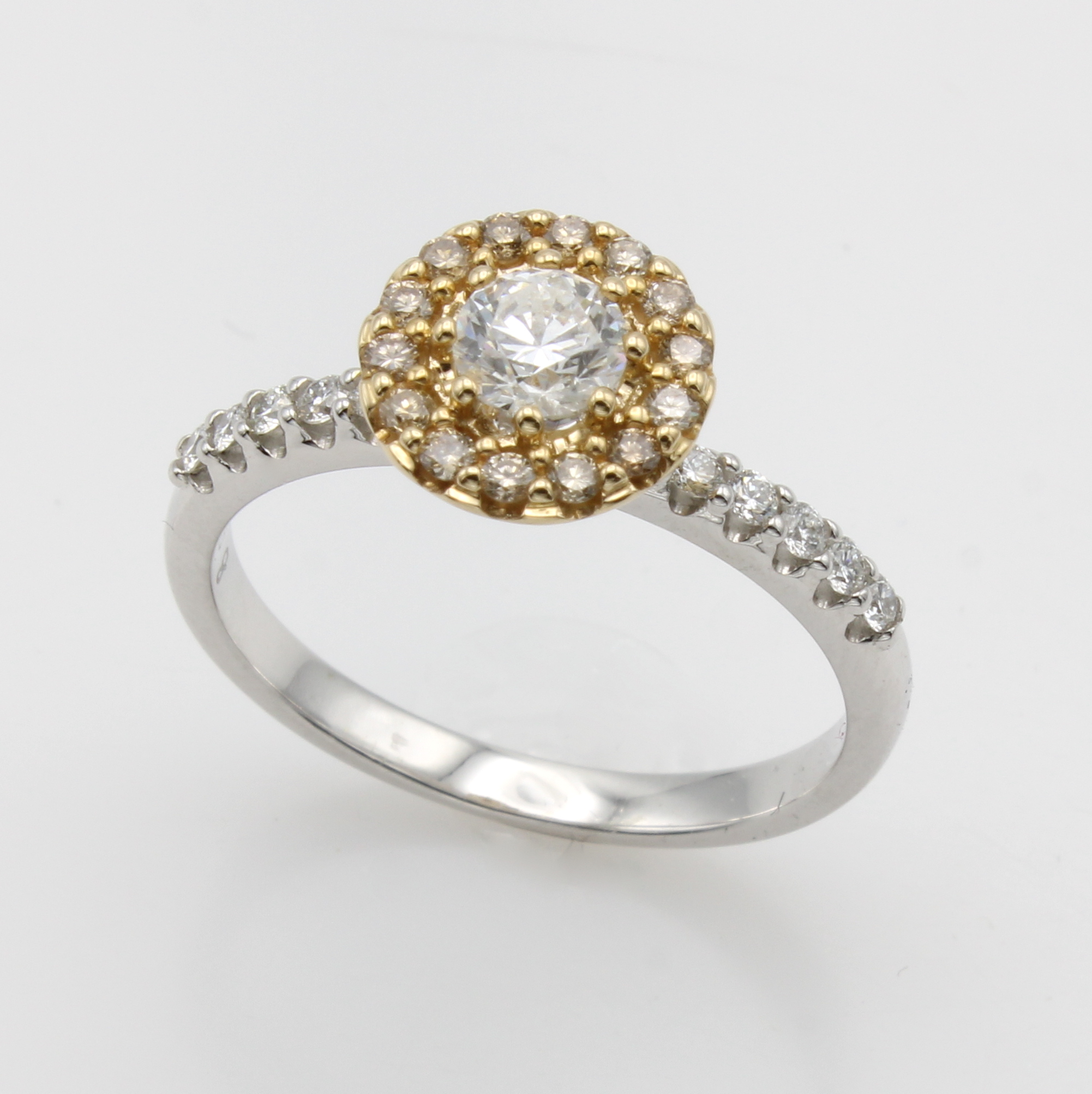 Ring mit Brillanten, WG/GG 585/000, 11 Brill. zus. ca. 0.55 ct Weiß/p, 14 Brill. zus. ca. 0.20 ct braun/p, Blütenform, RW ca. 56 Schätzpreis: 2800, - EUR