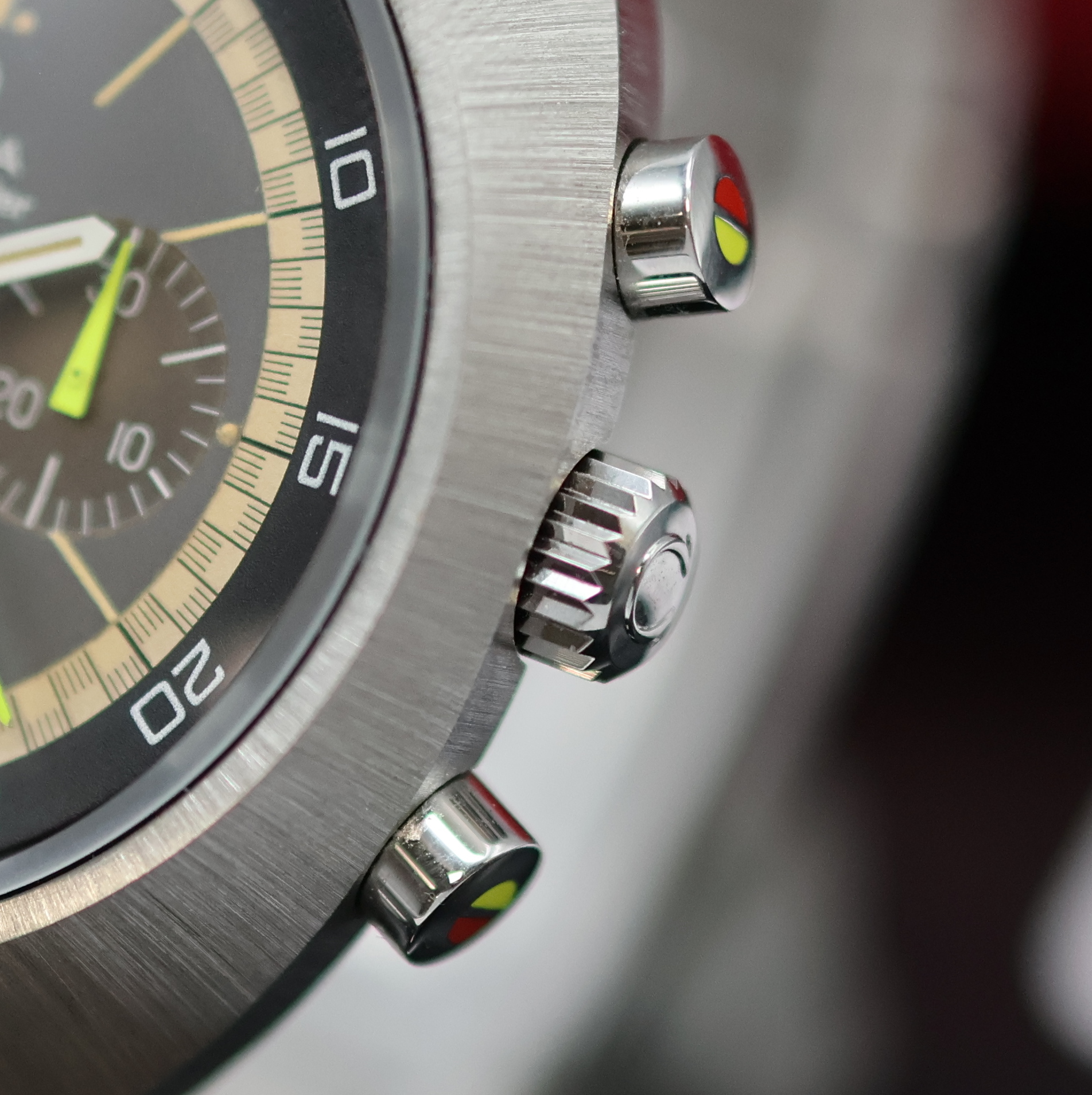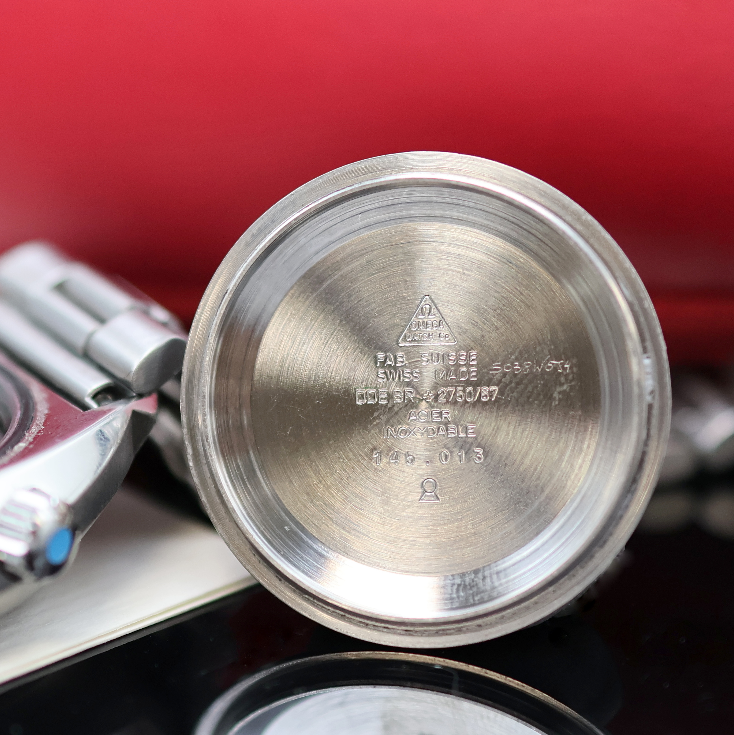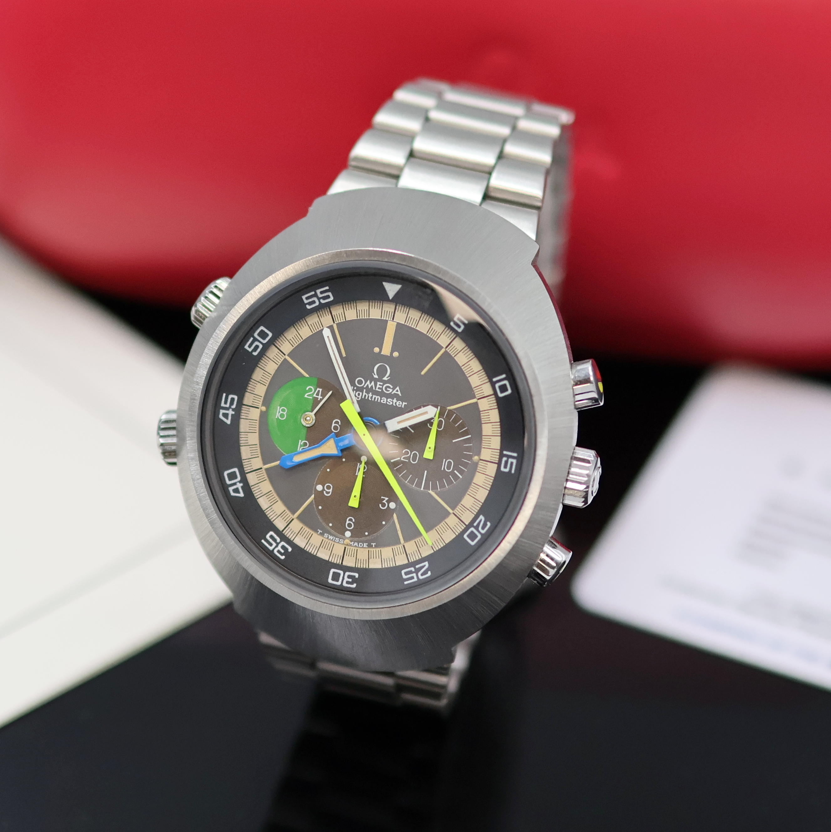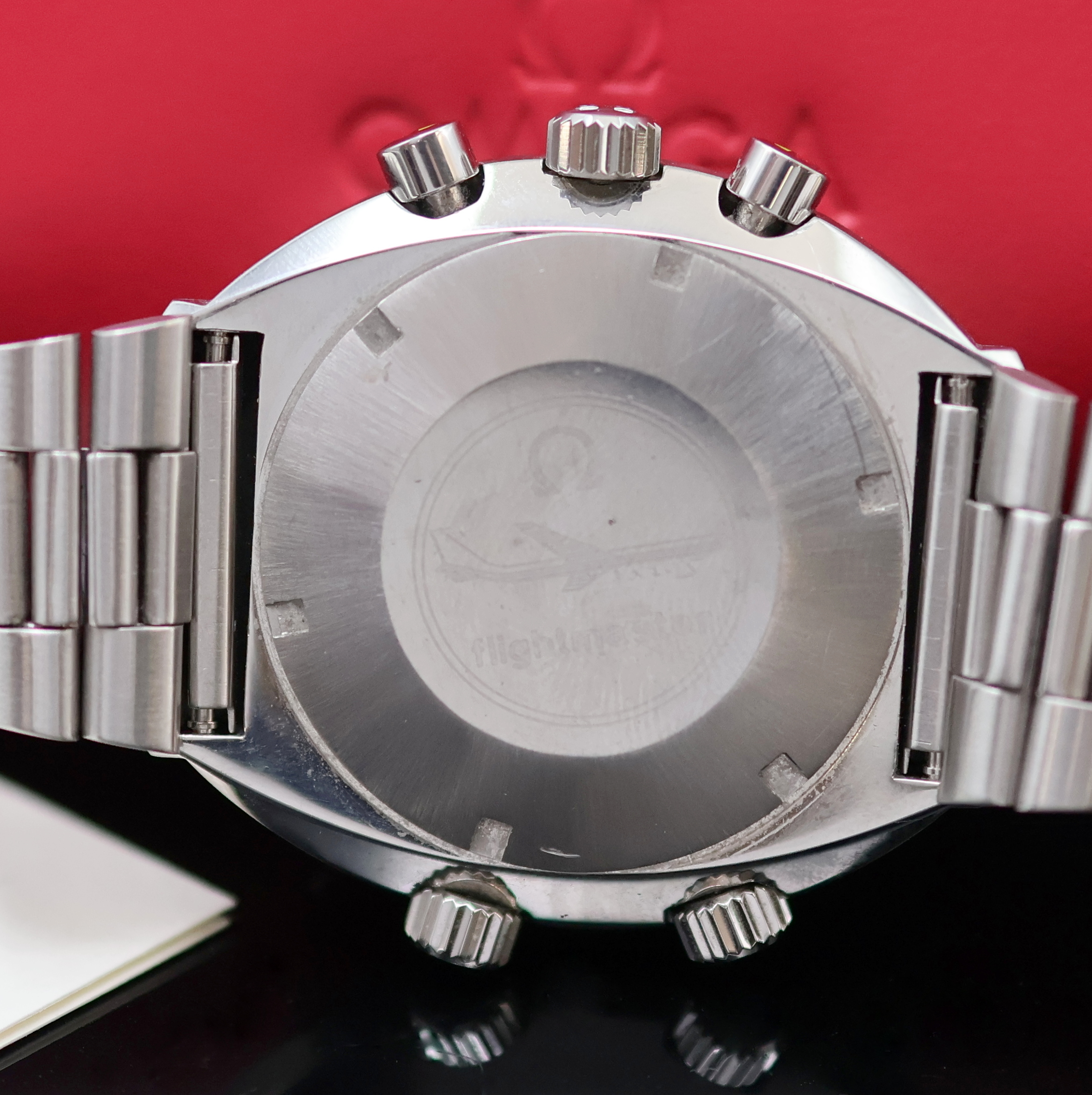 OMEGA Flightmaster gents chronograph reference 145.013, Switzerland produced according to extract of archives 1971, manual winding, solid stainless steel case including original bracelet with deployant clasp, screwed down case back with plane representation, bidirectional revolving inner bezel with 60-minutes graduation, gray dial with luminous indices and hands, coloured differentiated hands, 12 hours and 30 minutes counter, 24 hours display, Memo-time, copper coloured movement calibre 910, 17 jewels, precision adjustment, measures approx. 43 x 52 mm, length approx. 18,5 cm, Omega service box, extract of archive, Service card from 2021 and 4 additional bracelet elements enclosed, condition 2
