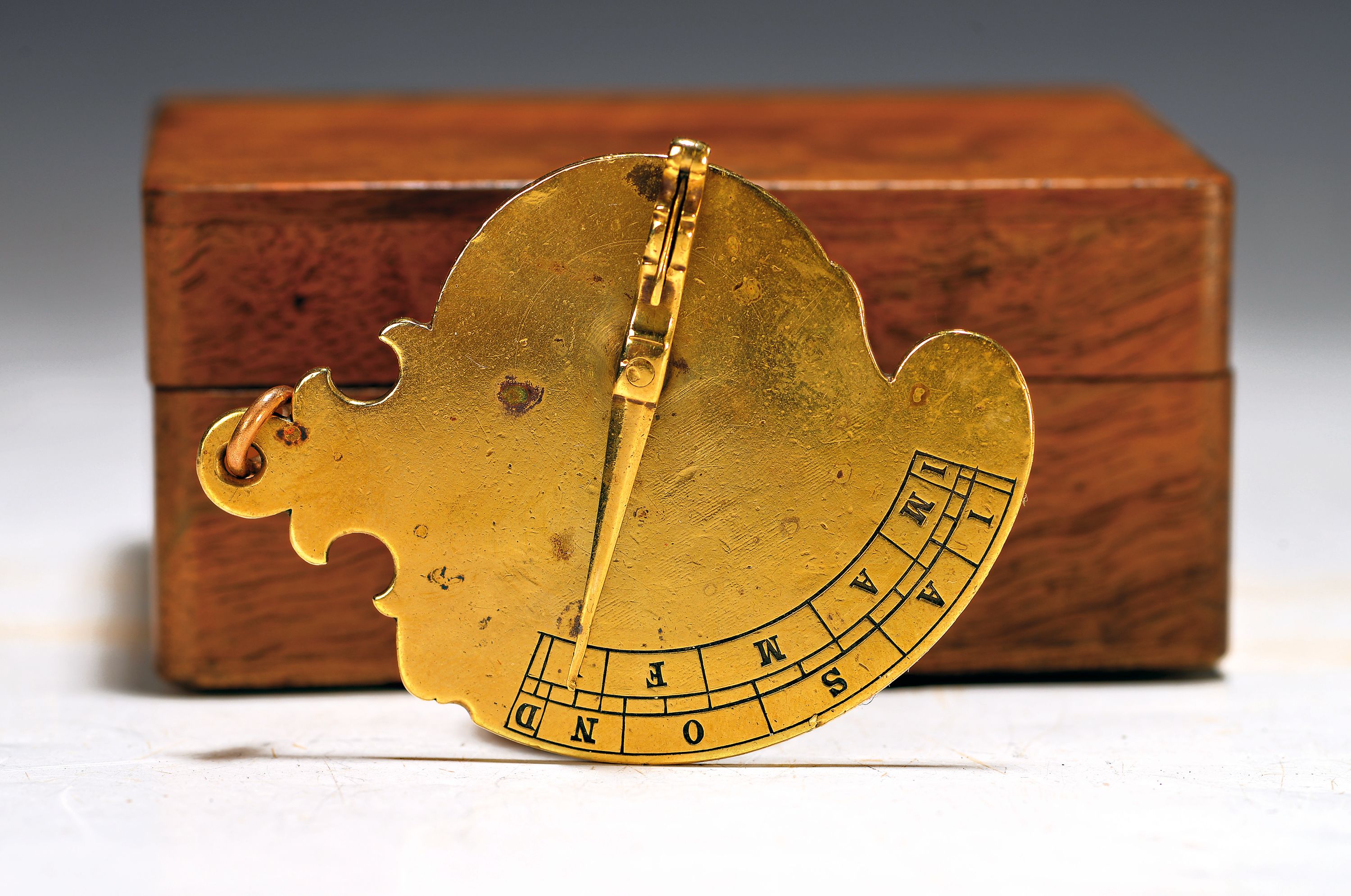 Gnomon und Monatsbänder (lat.), rückseitig mit Stundeneinteilung und Signatur: