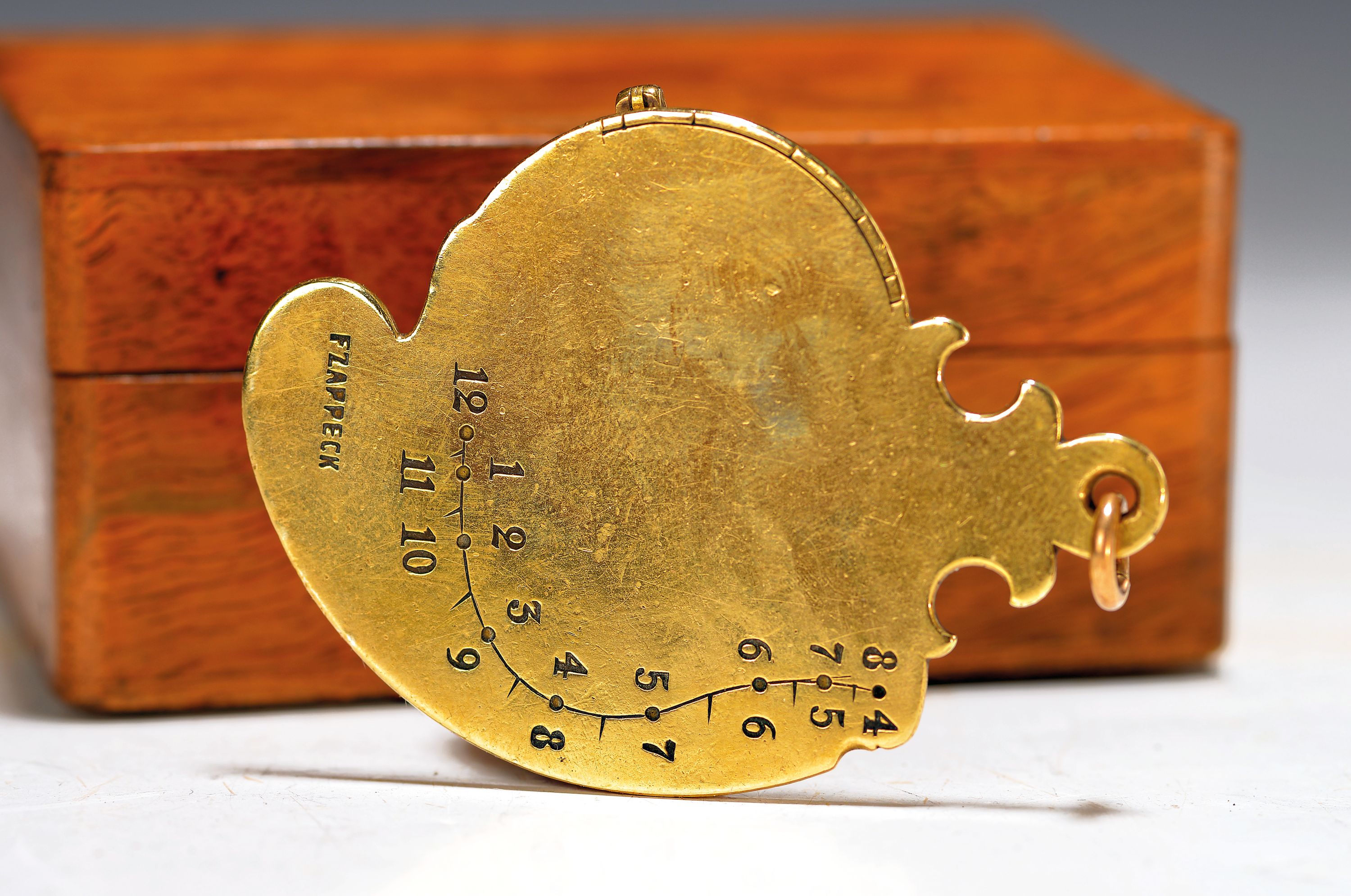 Wappenform", beidseitig graviert, vorderseitig drehbarer Monatszeiger mit aufklappbarem