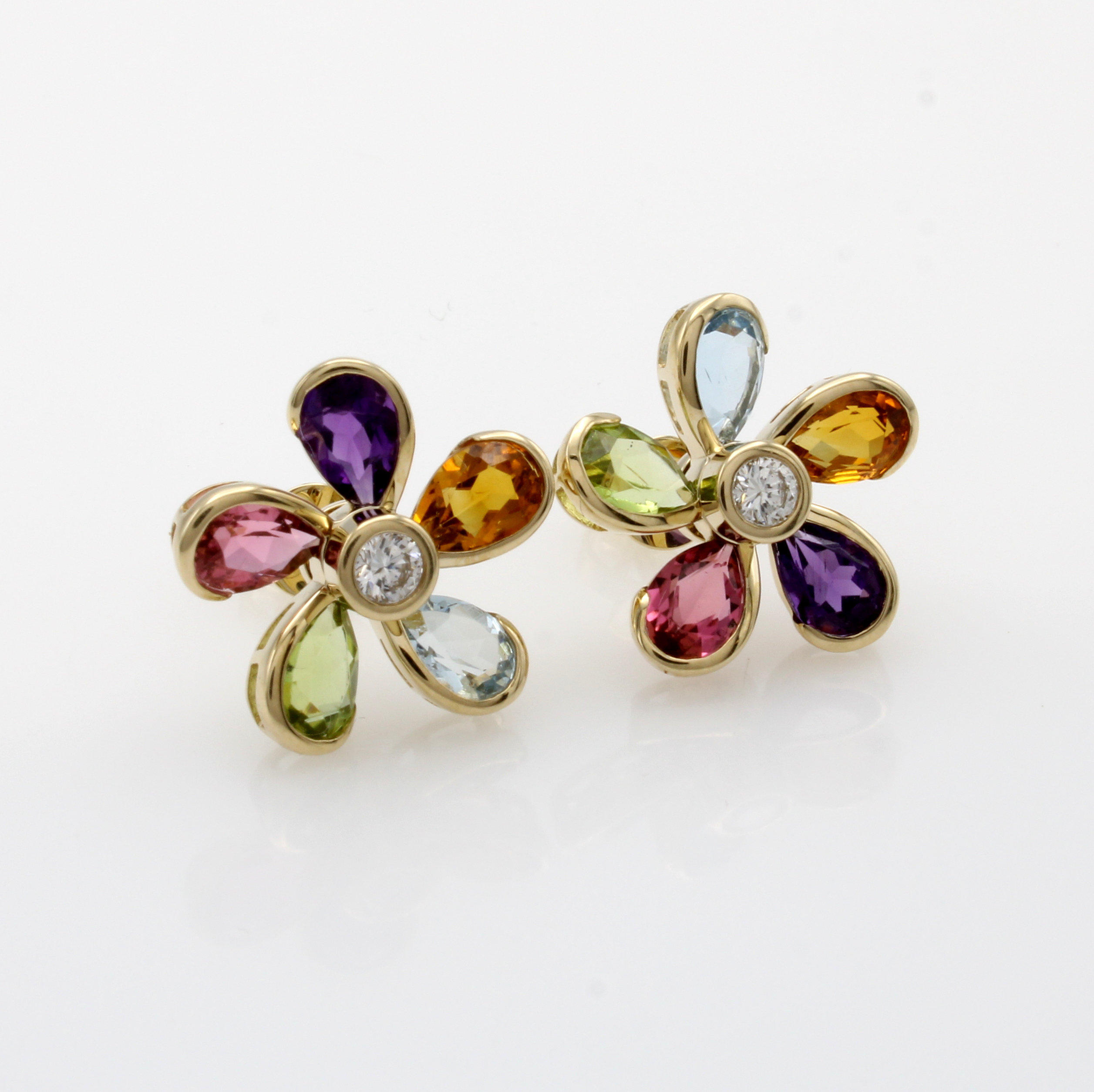 Paar Ohrstecker "Blüte" mit Farbsteinen und Brillanten, GG 585/000, 2 Brill. zus. ca. 0.21 ct feines Weiß+/vs, drehbar, diverse Farbsteine zus. ca. 3.92 ct Schätzpreis: 2600, - EUR