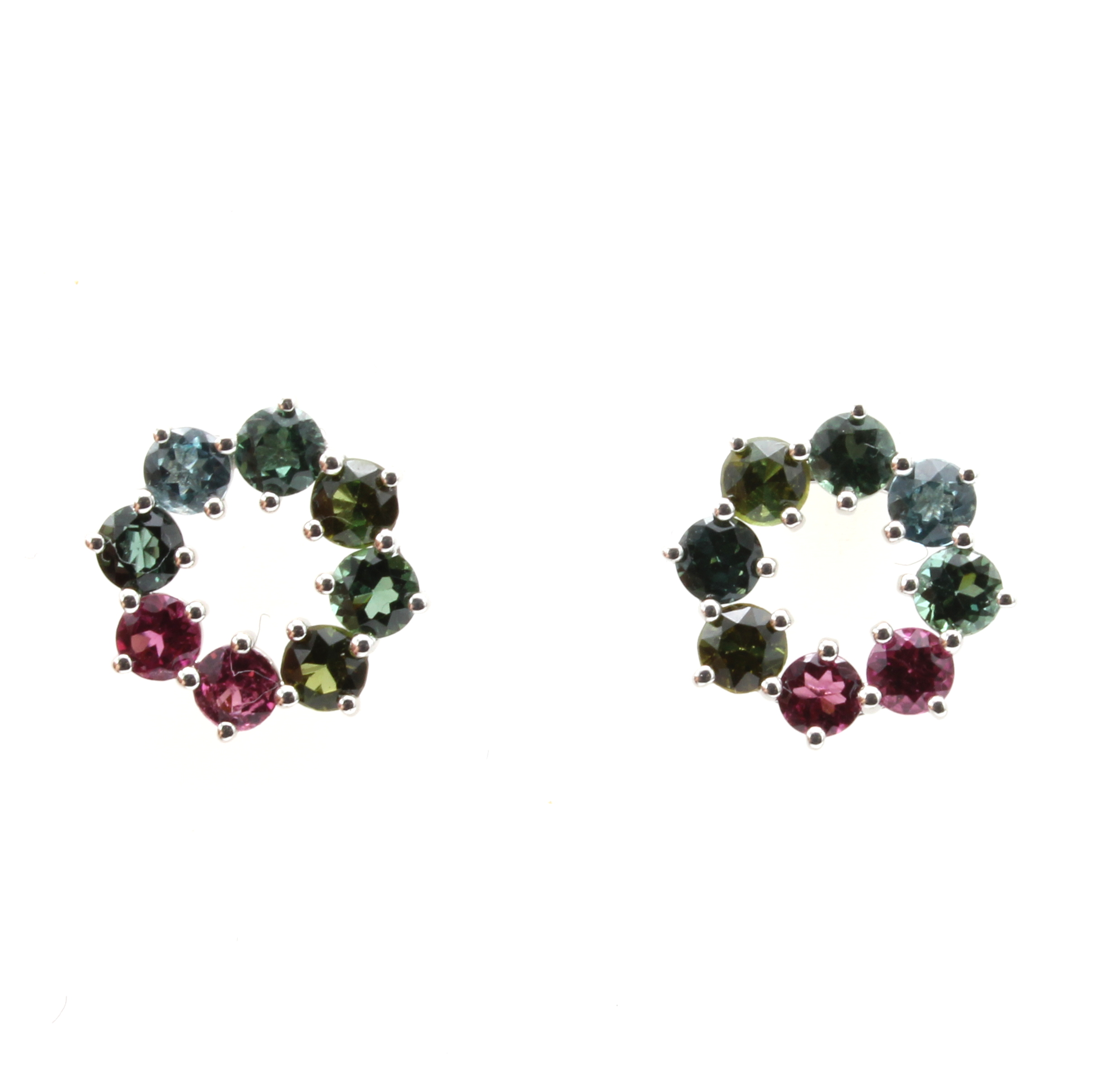 Paar Ohrstecker mit Turmalinen, WG 585/000, 16 bunte Turmaline im Kreis gef. zus. ca. 1.86ct