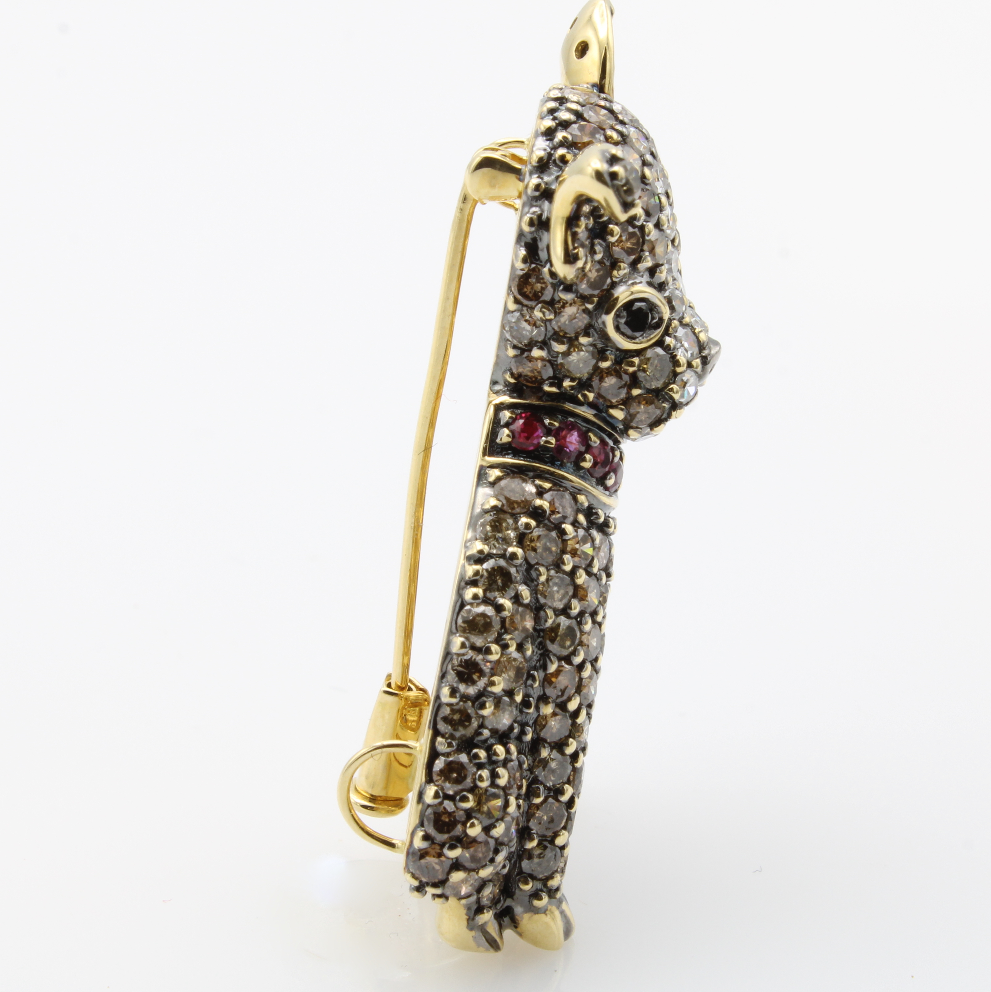 Brosche "Chihuahua" mit Diamanten, Brillanten und Rubinen, GG 750/000, 123 Diam. zus. ca. 3.51 ct braun/si, 2 Diam. zus. ca. 0.05 ct schwarz (beh.), 33 Brill. zus. ca. 0.63 ct feines Weiß/si-p Schätzpreis: 6700, - EUR