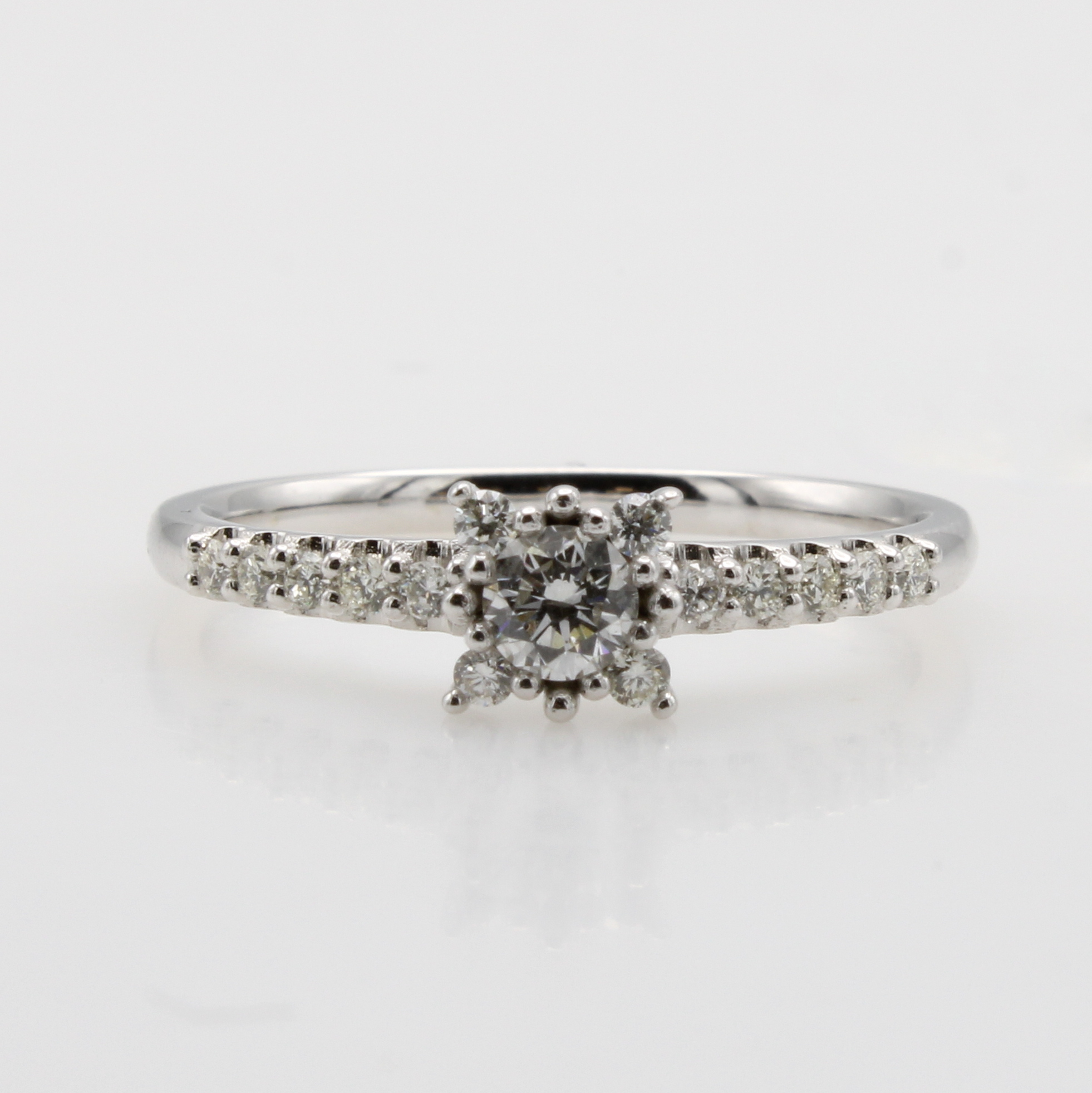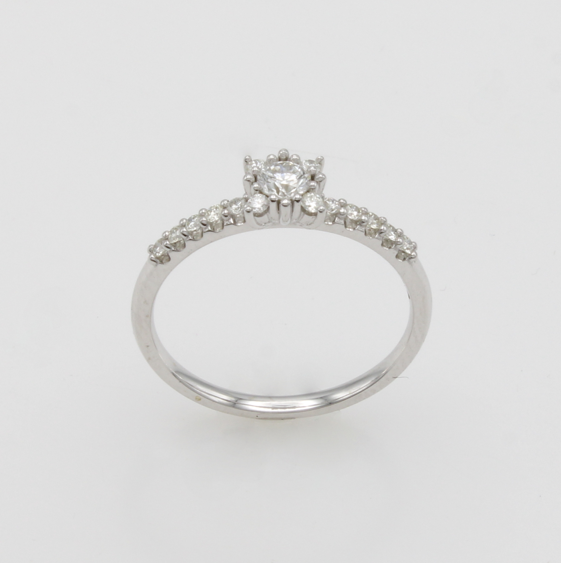 Ring mit Brillanten, WG 585/000, Mittel- stein in Krappenf. ca. 0.20 ct Weiß/si, 14 Besatzbrill. in Ringschulter gef. zus. ca. 0.20 ct Weiß/si, RW ca. 56 Schätzpreis: 1800, - EUR