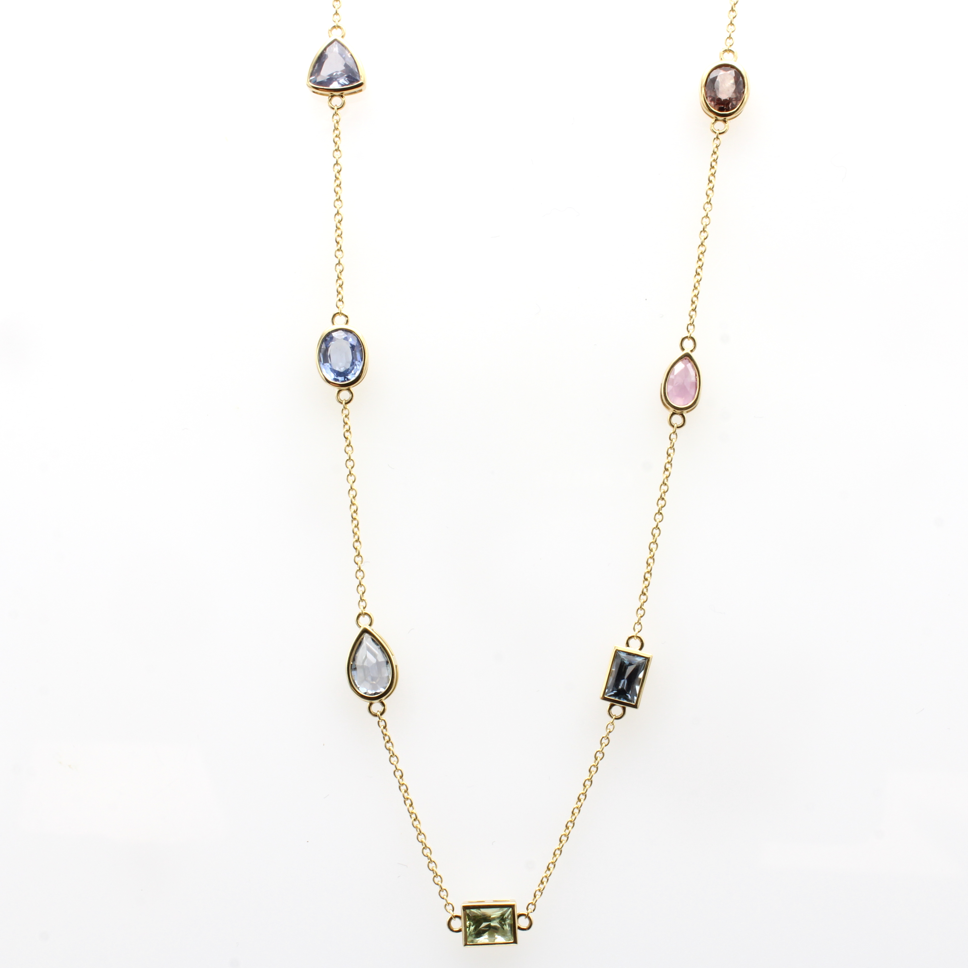 Collier mit Saphiren GG 750/000, 10 Saphire zus. ca. 7.28 ct in versch. Farben u. Formen, in L. ca. 42 u. 45 cm tragbar Schätzpreis: 4300, - EUR