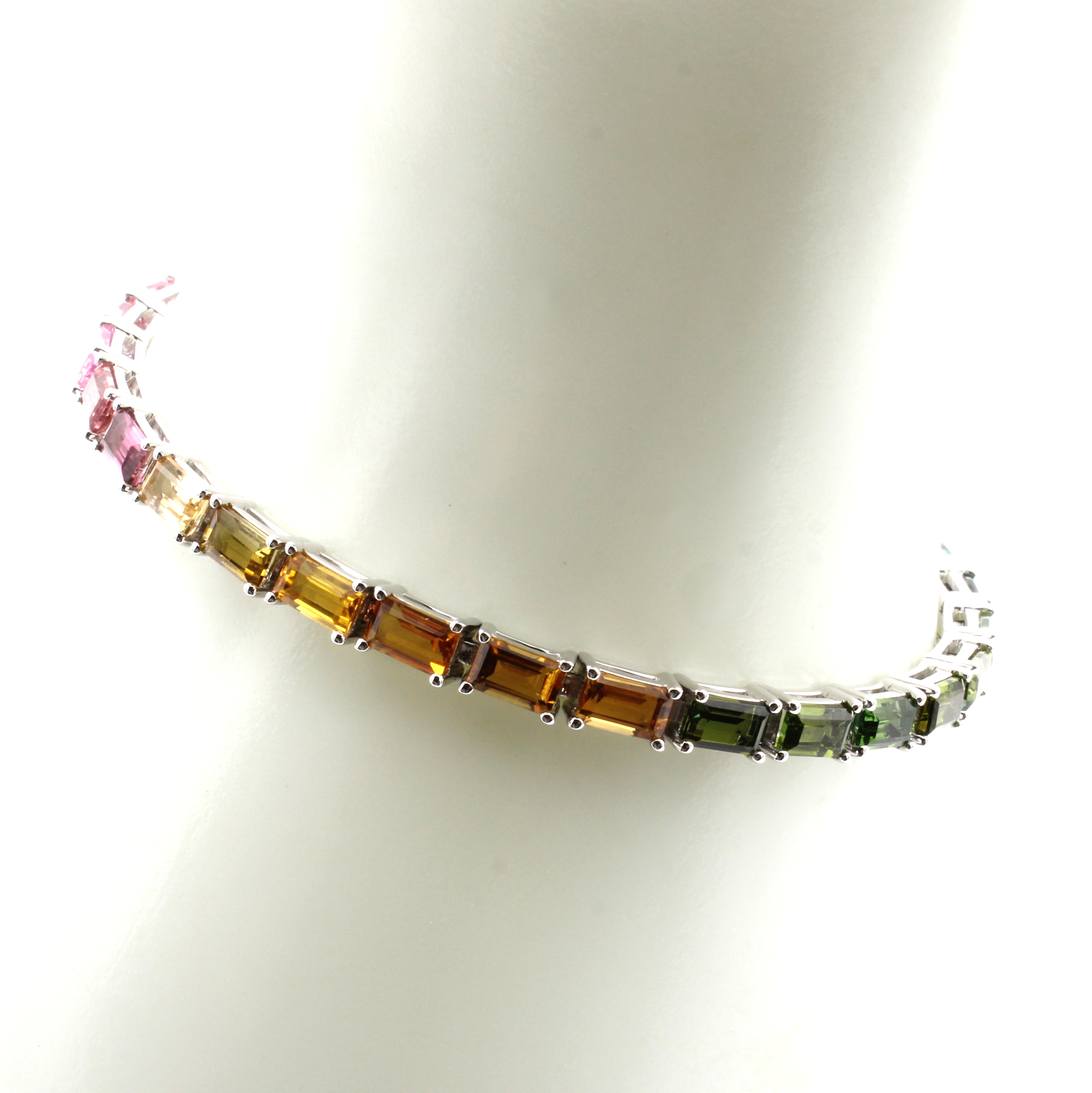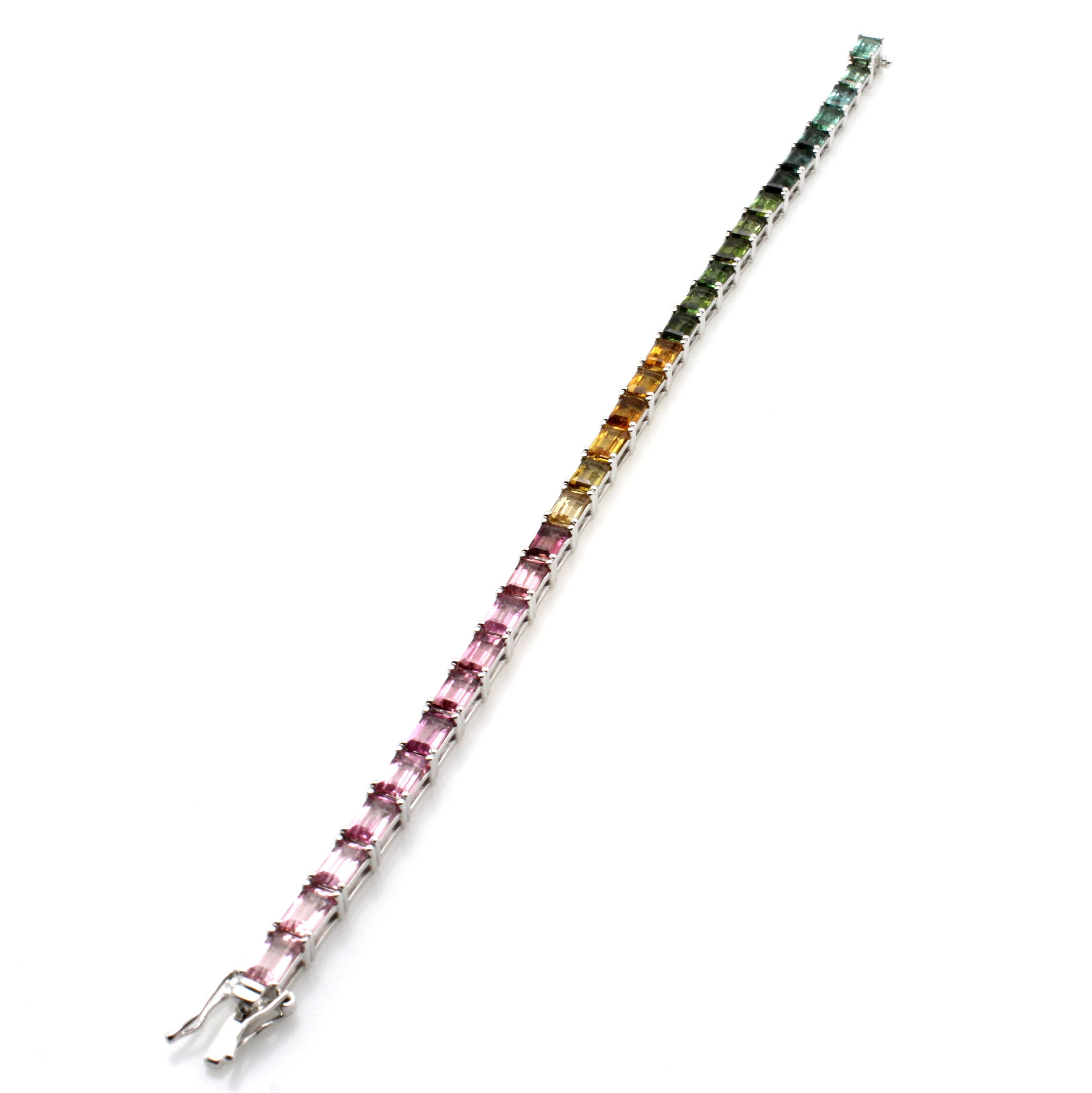 Armband mit Farbsteinen, WG 750/000, 30 bunte Turmaline in versch. Farbnuancen zus. ca. 9.79 ct, Kastenschl. m. Sicherheitsacht, L. ca. 18 cm Schätzpreis: 5400, - EUR