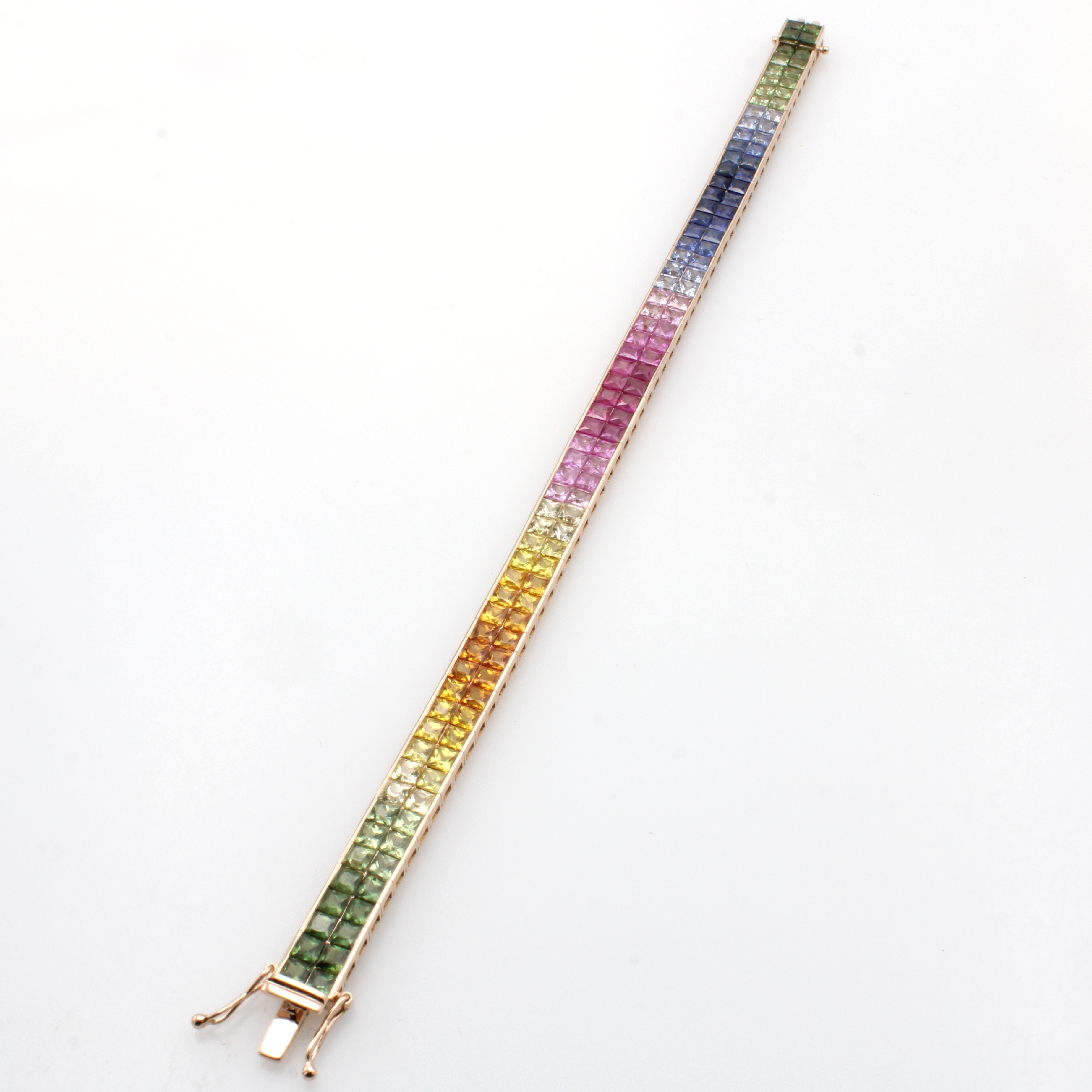 Armband "Rainbow" mit Saphiren, RoséG 585/ 000, 122 Saphirecarrées zus. ca. 18.31 ct in versch. Farben u. Farbnuancen, Kastenschl. m. Sicherheitsacht, L. ca. 18.5 cm Schätzpreis: 8800, - EUR