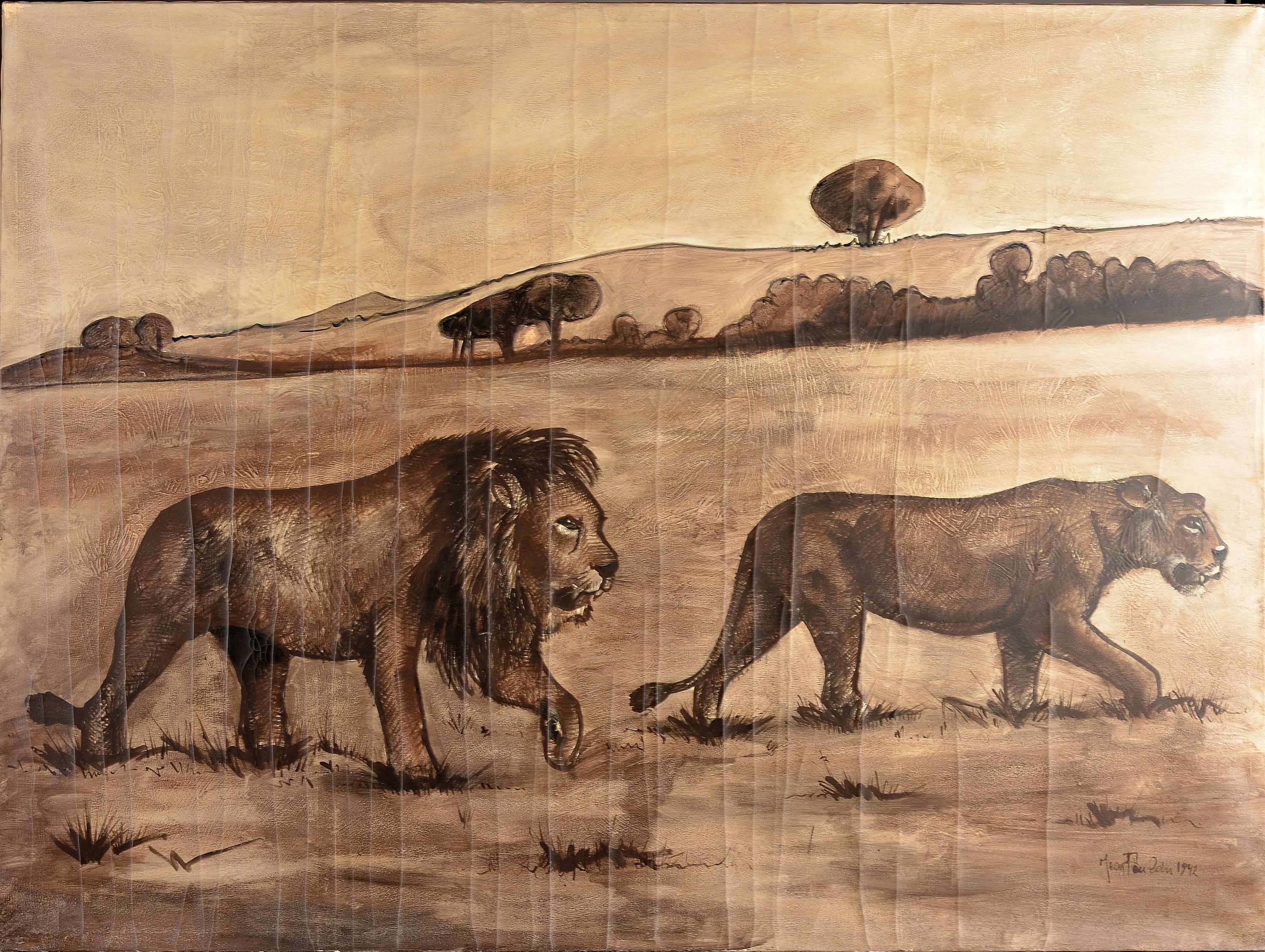 Jean Poulin, Künstler des 20.Jh., Löwenpaar in der Wildnis, rechts unten signiert und datiert 1942, Öl/Lwd, ungerahmt, Krakelee, 175x235 cm