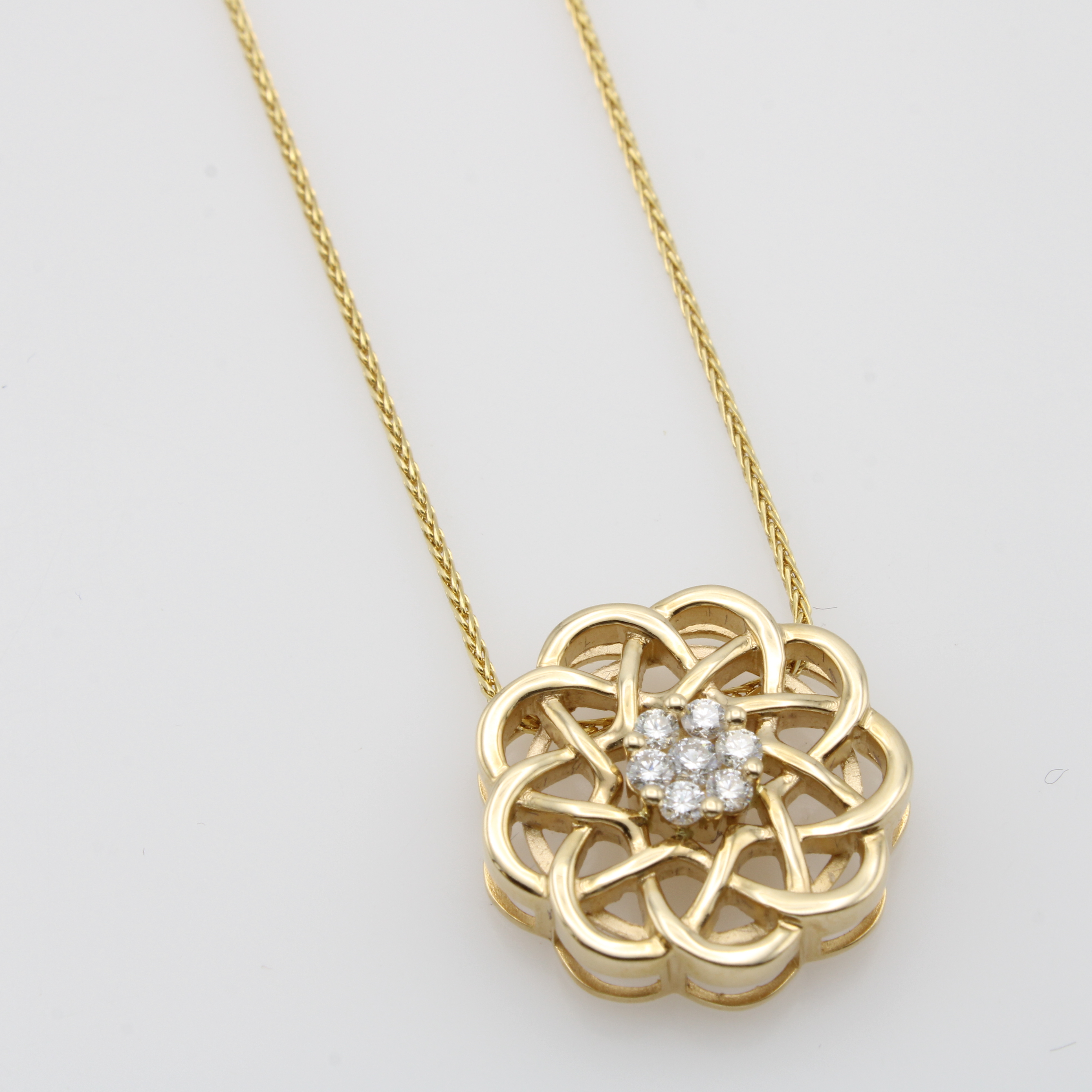 Anhänger "Blüte" mit Brillanten an Kette, GG 585/000, durchbrochene Form, 7 Brill. zus. ca. 0.25 ct Weiß/si, L. ca. 45 cm Schätzpreis: 2800, - EUR