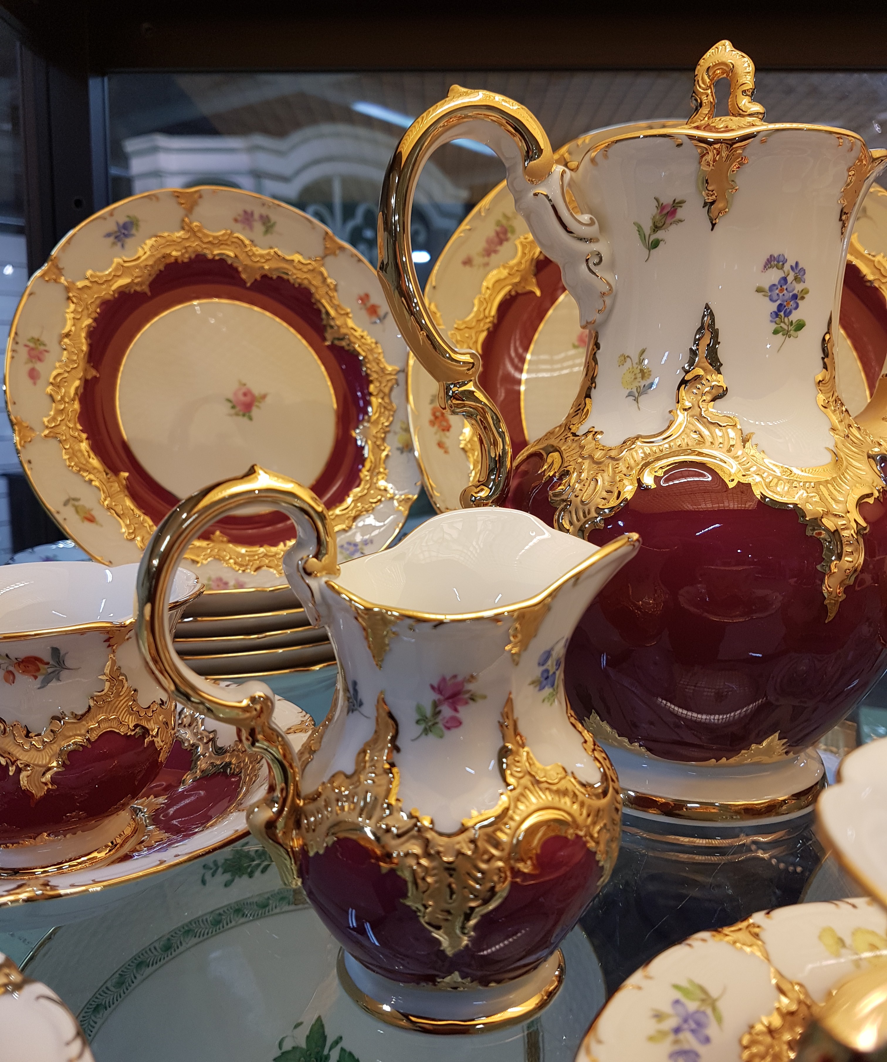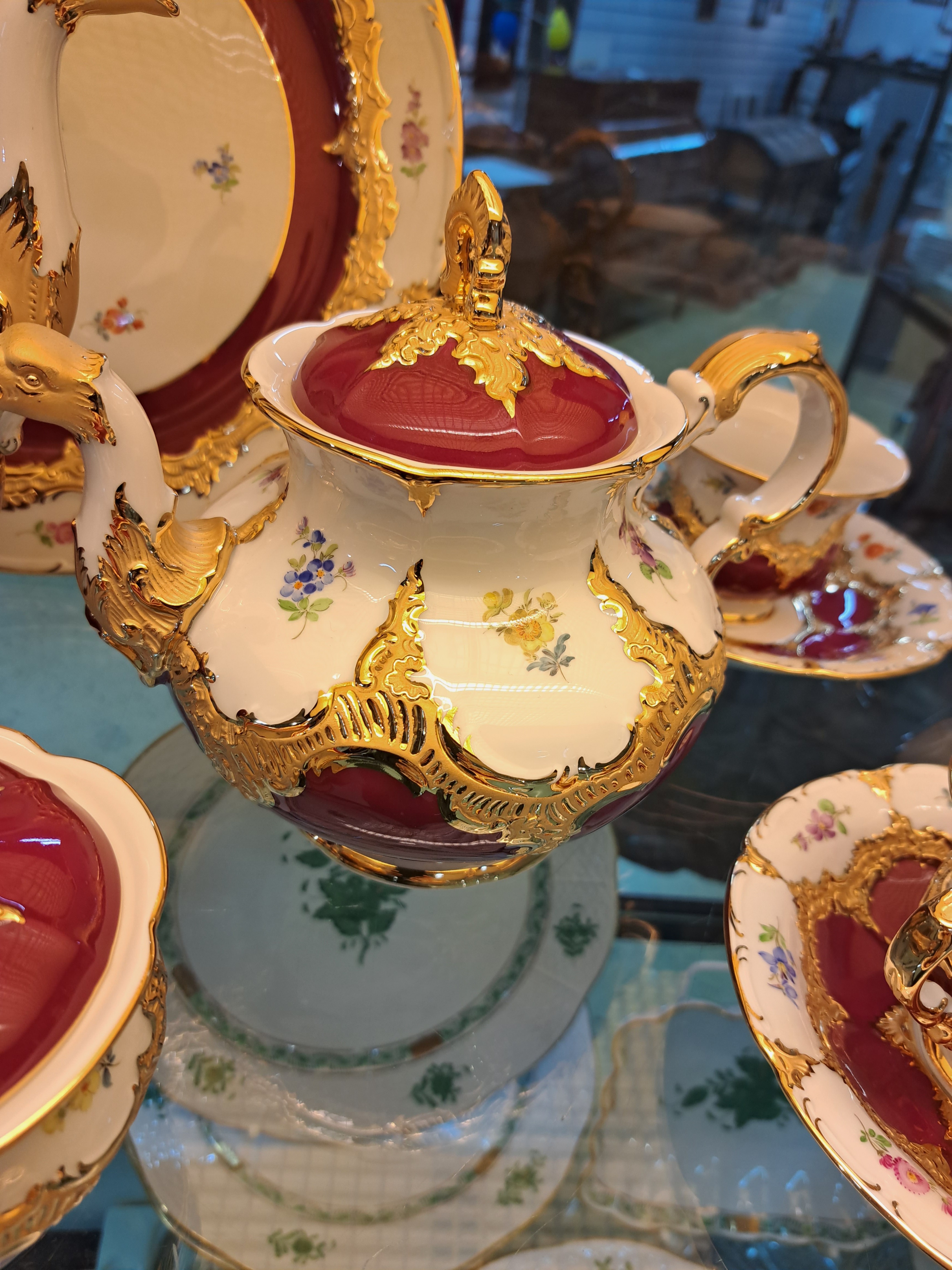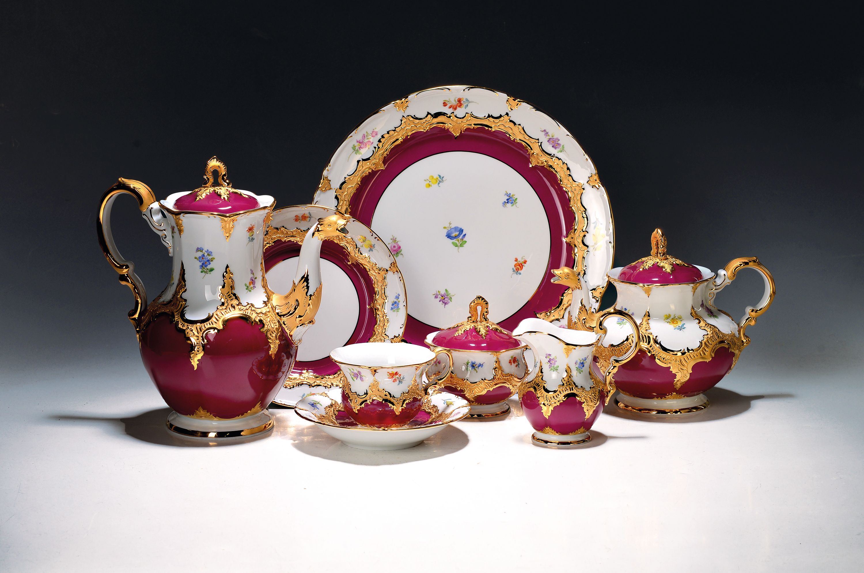 Kaffeeservice, Meissen, B-Form, für 6 Personen, 2.H.20. Jh., roter Fond, Streublümchendekor, matt- und glanzvergoldet: große Kaffeekanne, Teekanne, Zuckerdose und Sahnegiesser, 6 Kaffeetassen mit Untertassen, 6 Kuchenteller, runde Tortenplatte, 1 Tasse min. am Standring best.
