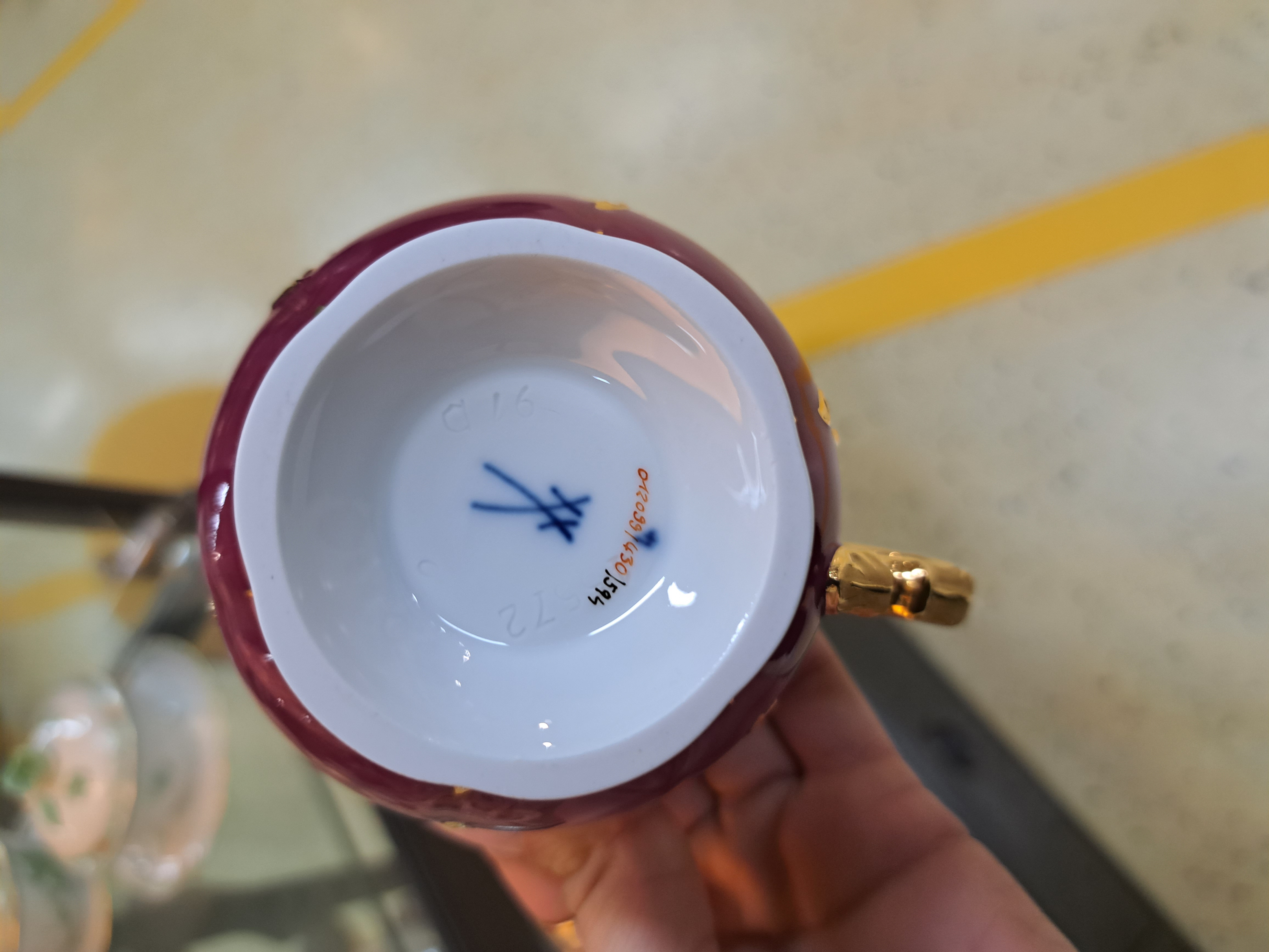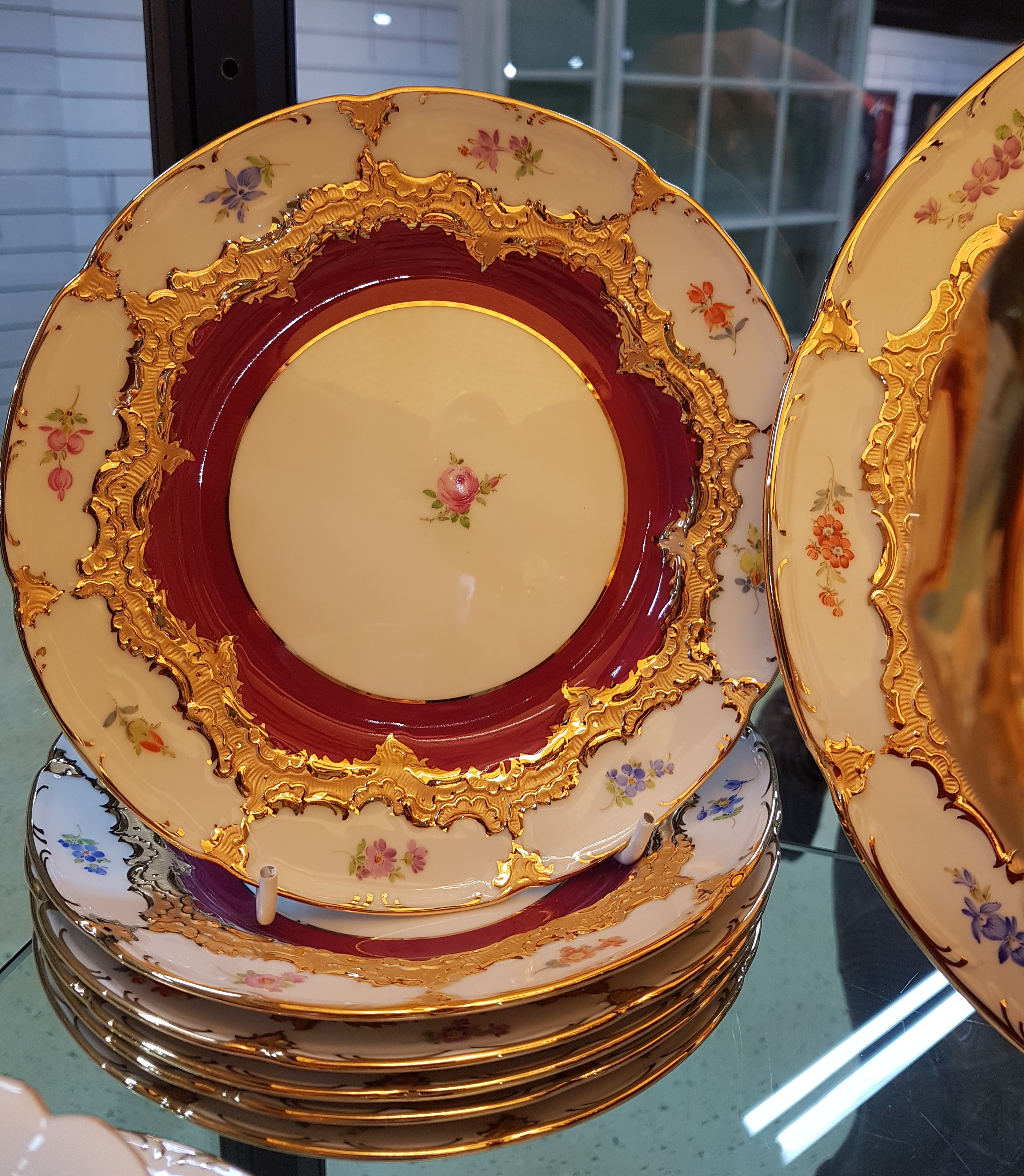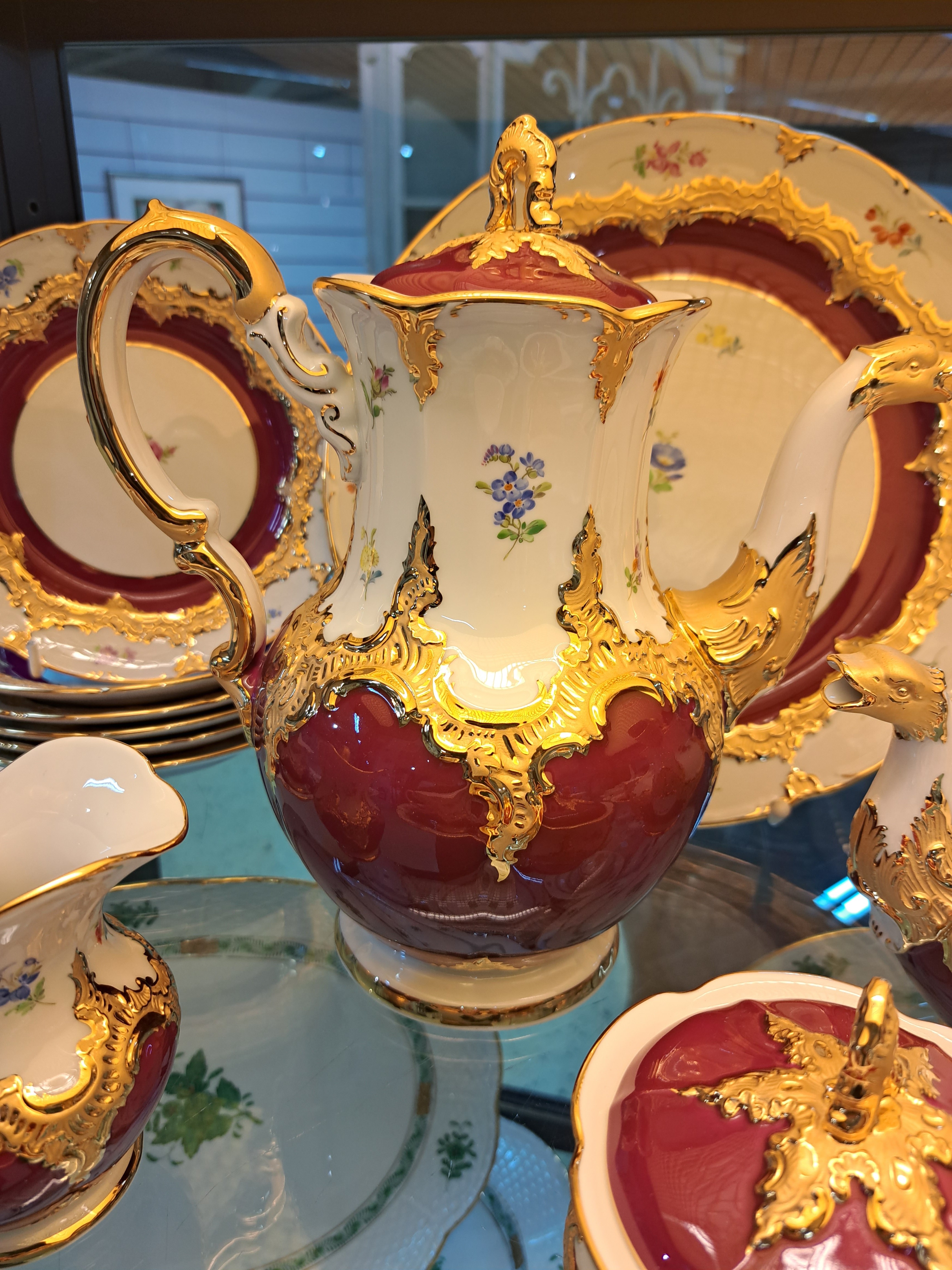 Kaffeeservice, Meissen, B-Form, für 6 Personen, 2.H.20. Jh., roter Fond, Streublümchendekor, matt- und glanzvergoldet: große Kaffeekanne, Teekanne, Zuckerdose und Sahnegiesser, 6 Kaffeetassen mit Untertassen, 6 Kuchenteller, runde Tortenplatte, 1 Tasse min. am Standring best.