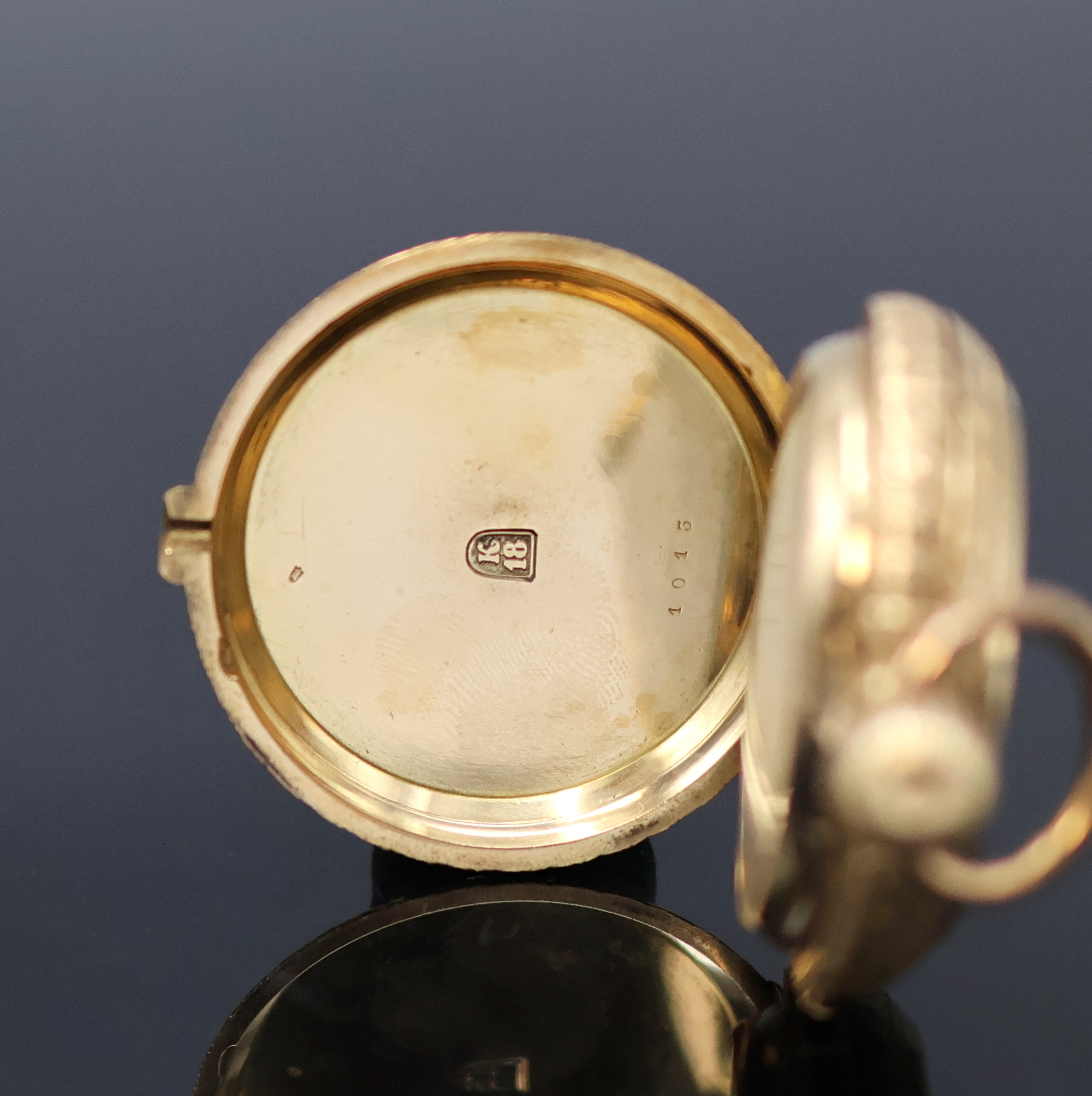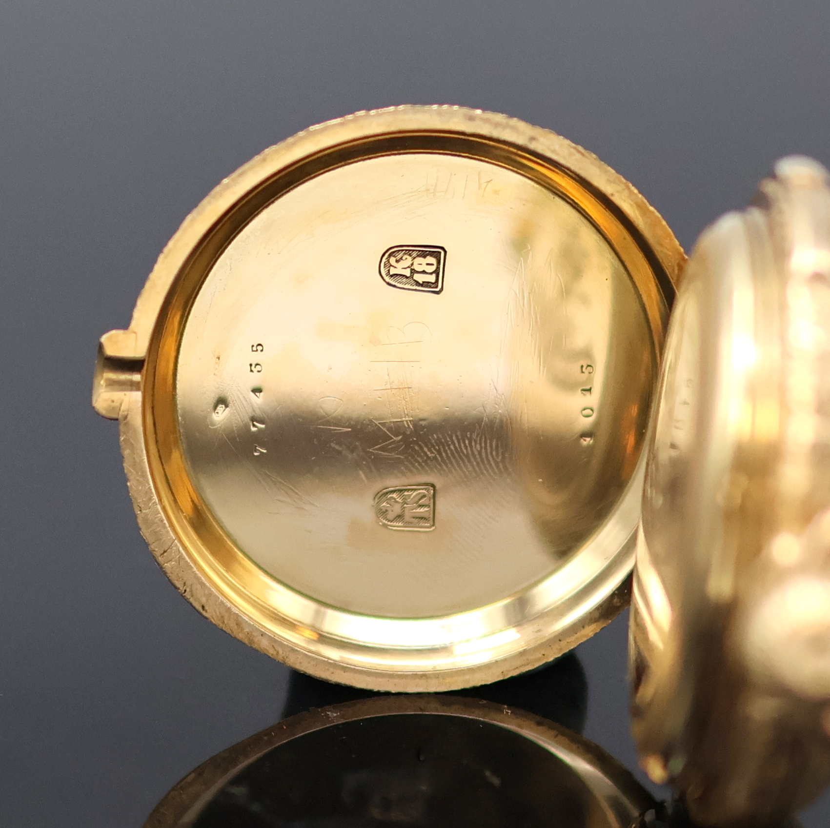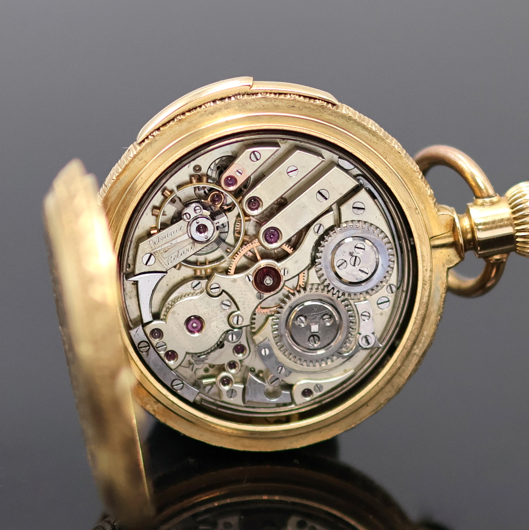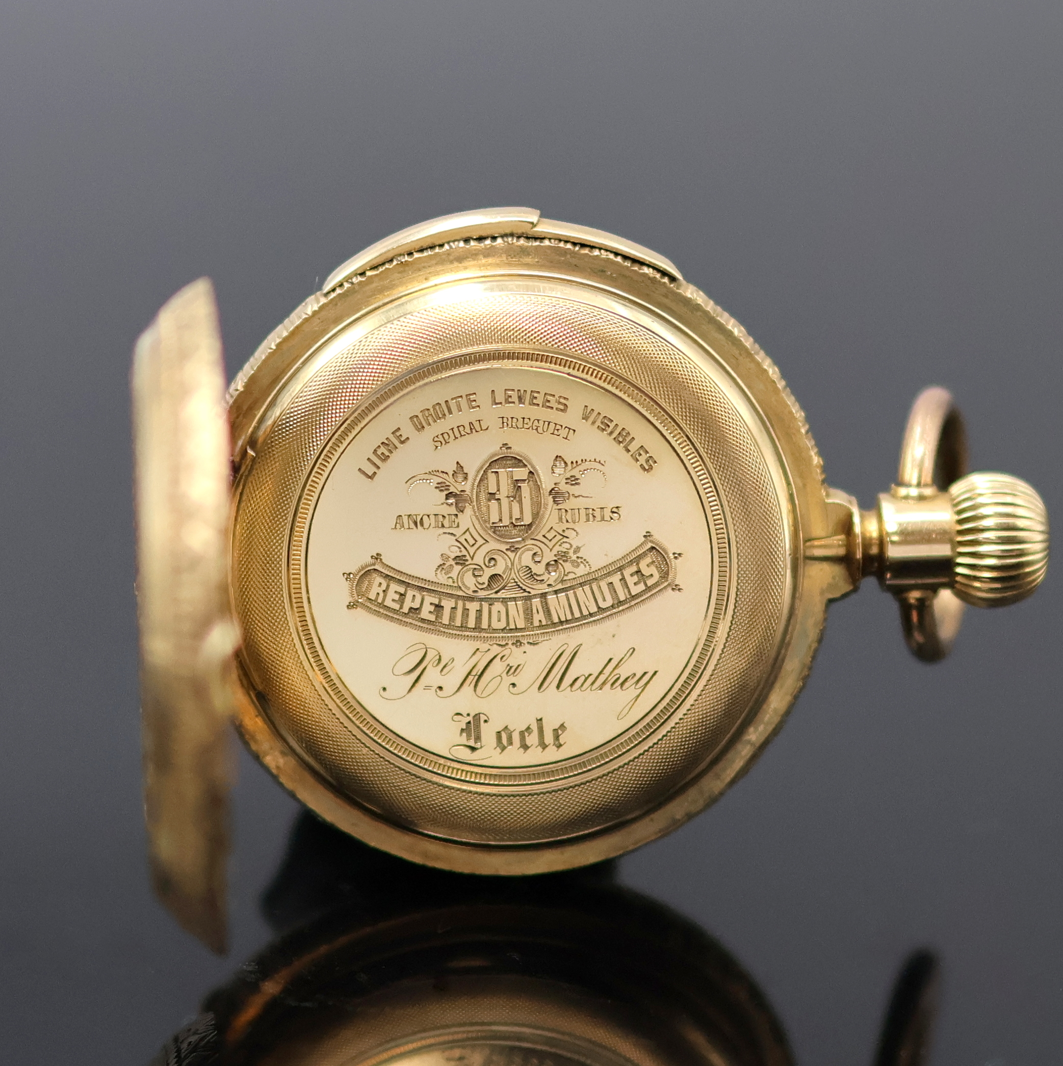 P.H. MATHEY schwere Herrensavonette mit Minutenrepetition in RoseG 750/000, Schweiz um 1880, vollständig tief-grav. 3-Deckel Goldgeh. m. à-Goutte Schlüssen, sign. Cuvette, seitl. Schieber f. Repetition, silb. Zifferbl. m. gold. floralem Dekor, kl. Sek. b. 6, Zeiger später, Neusilberwerk m. Genfer Streifen, Schlag auf 2 Tonfedern, Komp.-Unruh m. Breg.- Spir., Deckst. auf Anker- u. Gangrad, D. ca. 48 mm, Gew. ca. 122g, Schlagwerk zu rep., Überh. unerl., EZG 2-3, EZW 3-4, aus Sammlungsauflösung