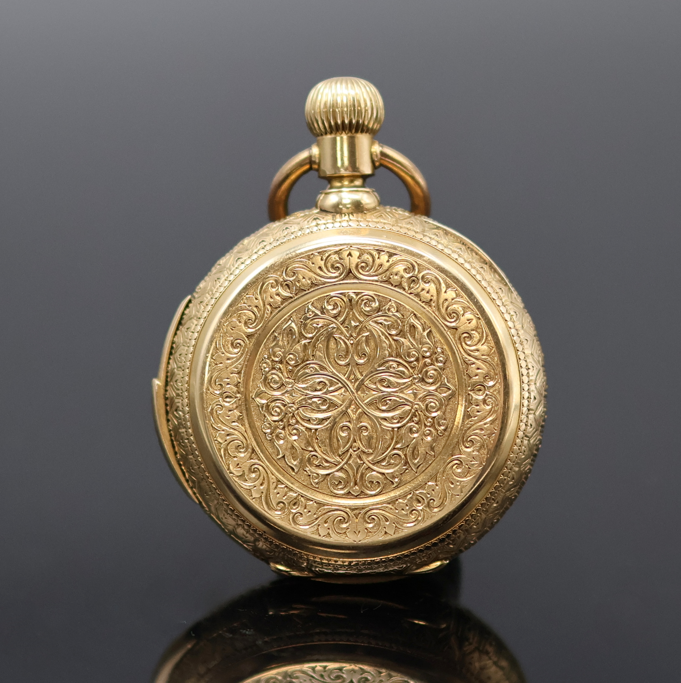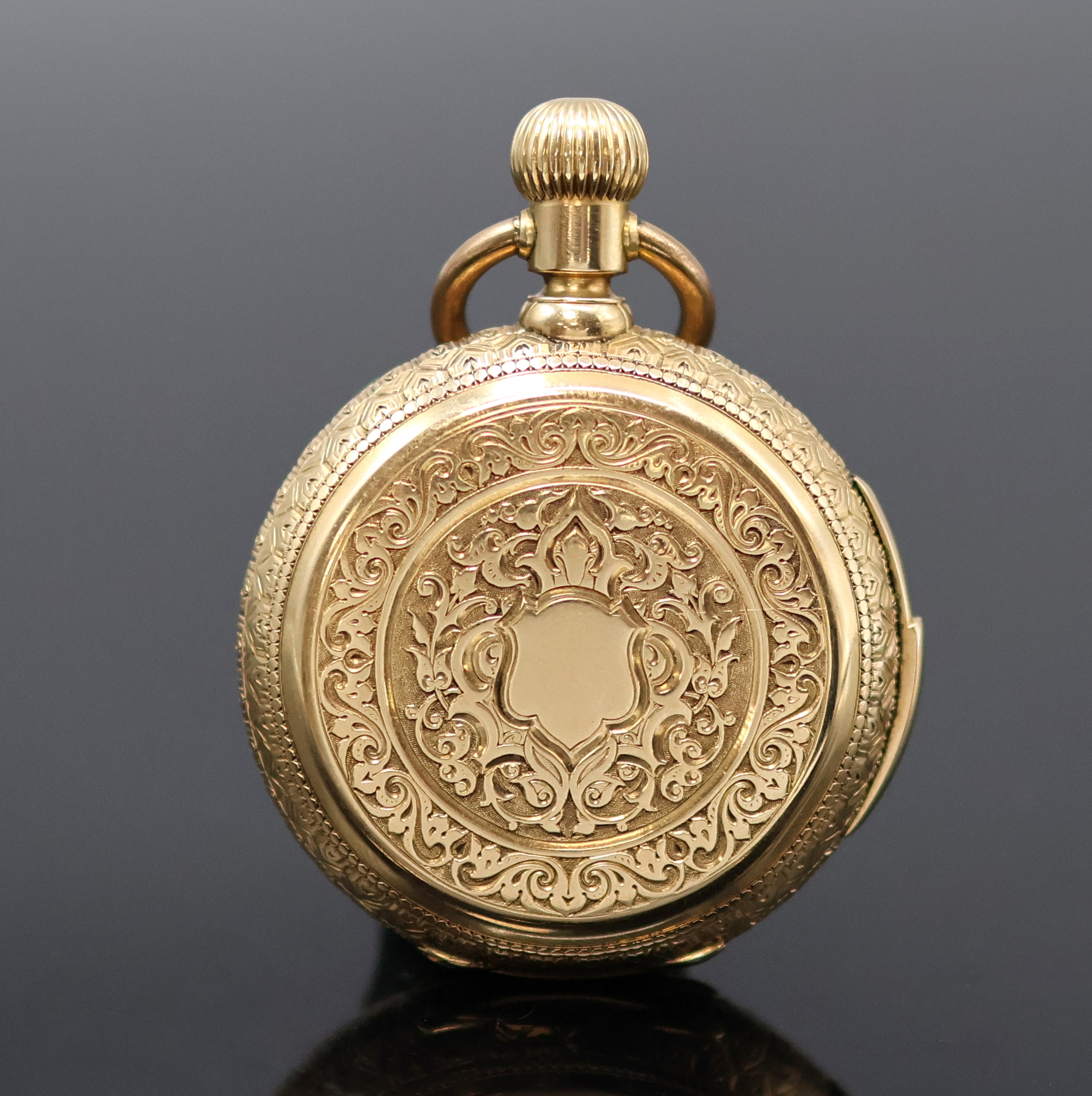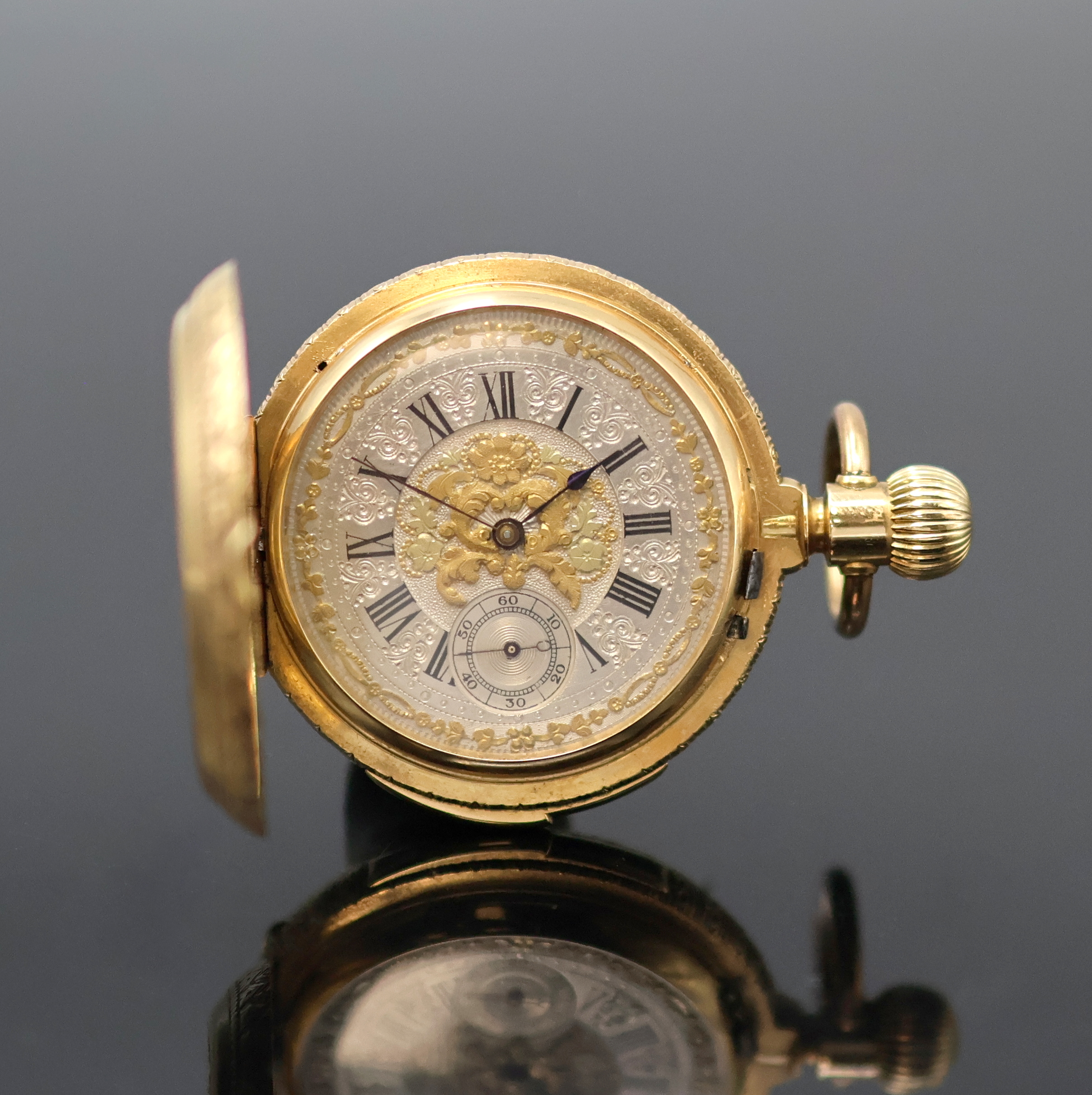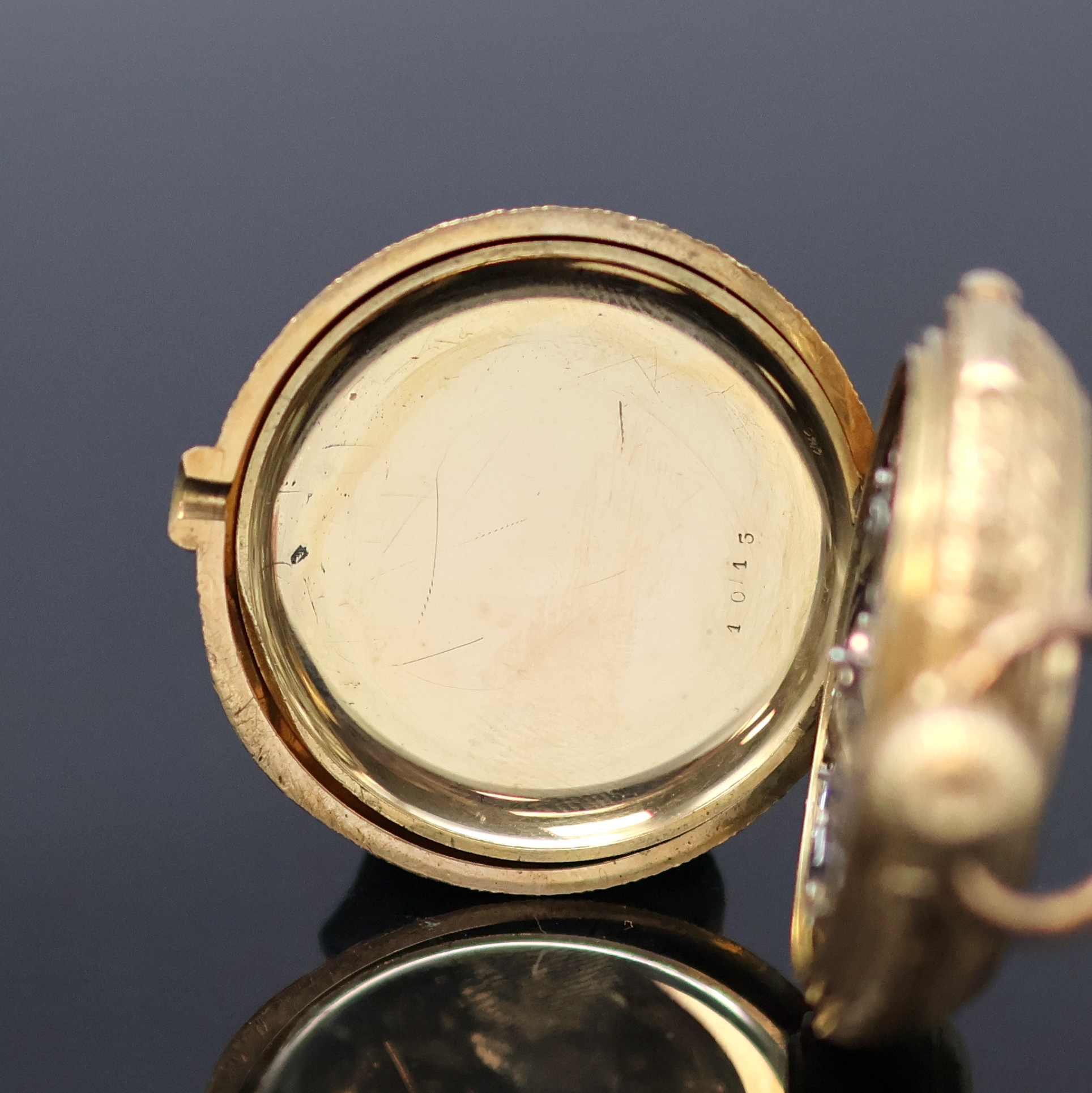 P.H. MATHEY schwere Herrensavonette mit Minutenrepetition in RoseG 750/000, Schweiz um 1880, vollständig tief-grav. 3-Deckel Goldgeh. m. à-Goutte Schlüssen, sign. Cuvette, seitl. Schieber f. Repetition, silb. Zifferbl. m. gold. floralem Dekor, kl. Sek. b. 6, Zeiger später, Neusilberwerk m. Genfer Streifen, Schlag auf 2 Tonfedern, Komp.-Unruh m. Breg.- Spir., Deckst. auf Anker- u. Gangrad, D. ca. 48 mm, Gew. ca. 122g, Schlagwerk zu rep., Überh. unerl., EZG 2-3, EZW 3-4, aus Sammlungsauflösung