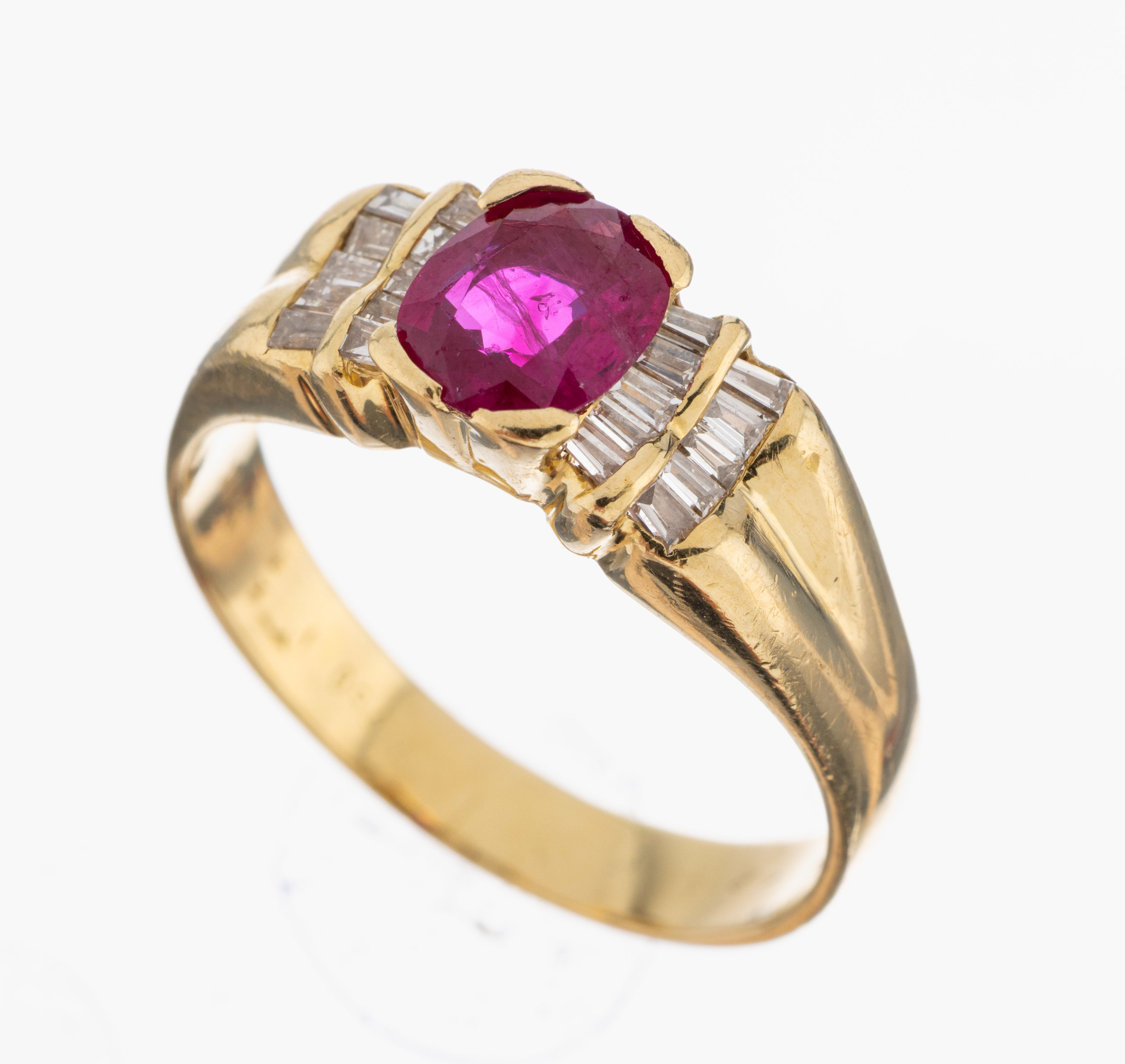 18 kt Gold Rubin-Diamant-Ring, GG 750/000, mittig erhaben gefasster ovalfacett. Rubin
