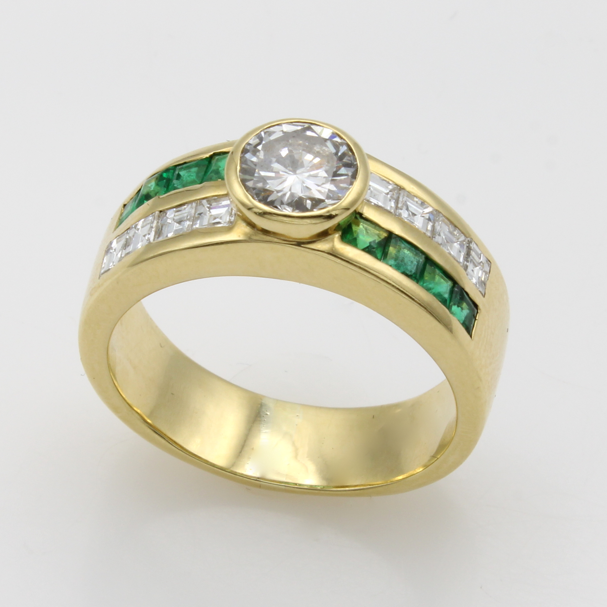 Ring mit Brillant, Diamanten und Smaragden, GG 750/000, Brill. ca. 0.80 ct Weiß/vs, Diam. im Carréeschl. zus. ca. 0.16 ct feines Weiß/vvs-vs, Smaragdcarrées ca. 0.16 ct, RW ca. 58 Schätzpreis: 14800, - EUR