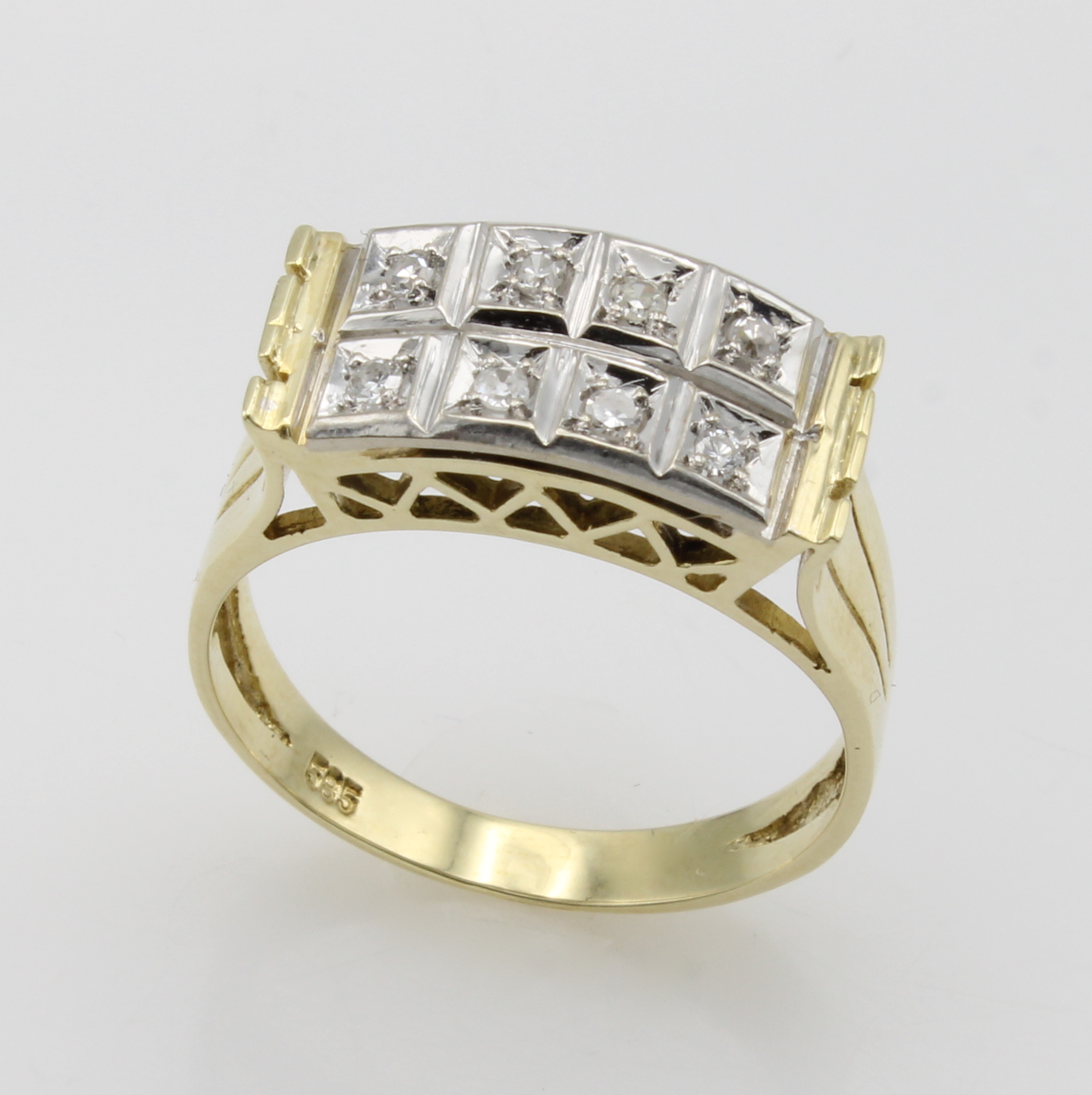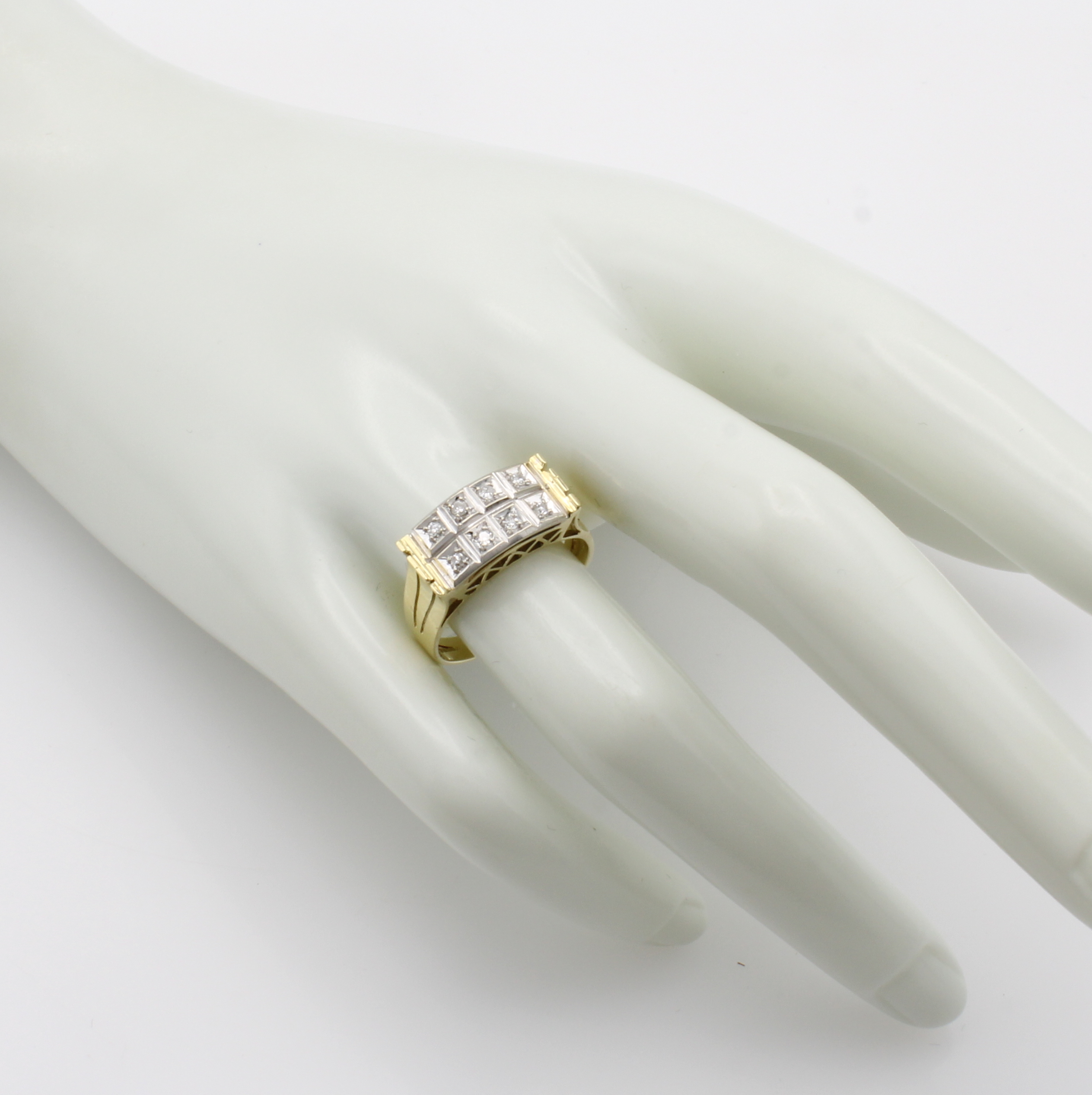Ring mit Diamanten, GG/WG 585/000, 8 Diam. in carréef. Fassungen zus. ca. 0.16 ct feines Weiß/vvs-vs, RW ca. 56 Schätzpreis: 1200, - EUR