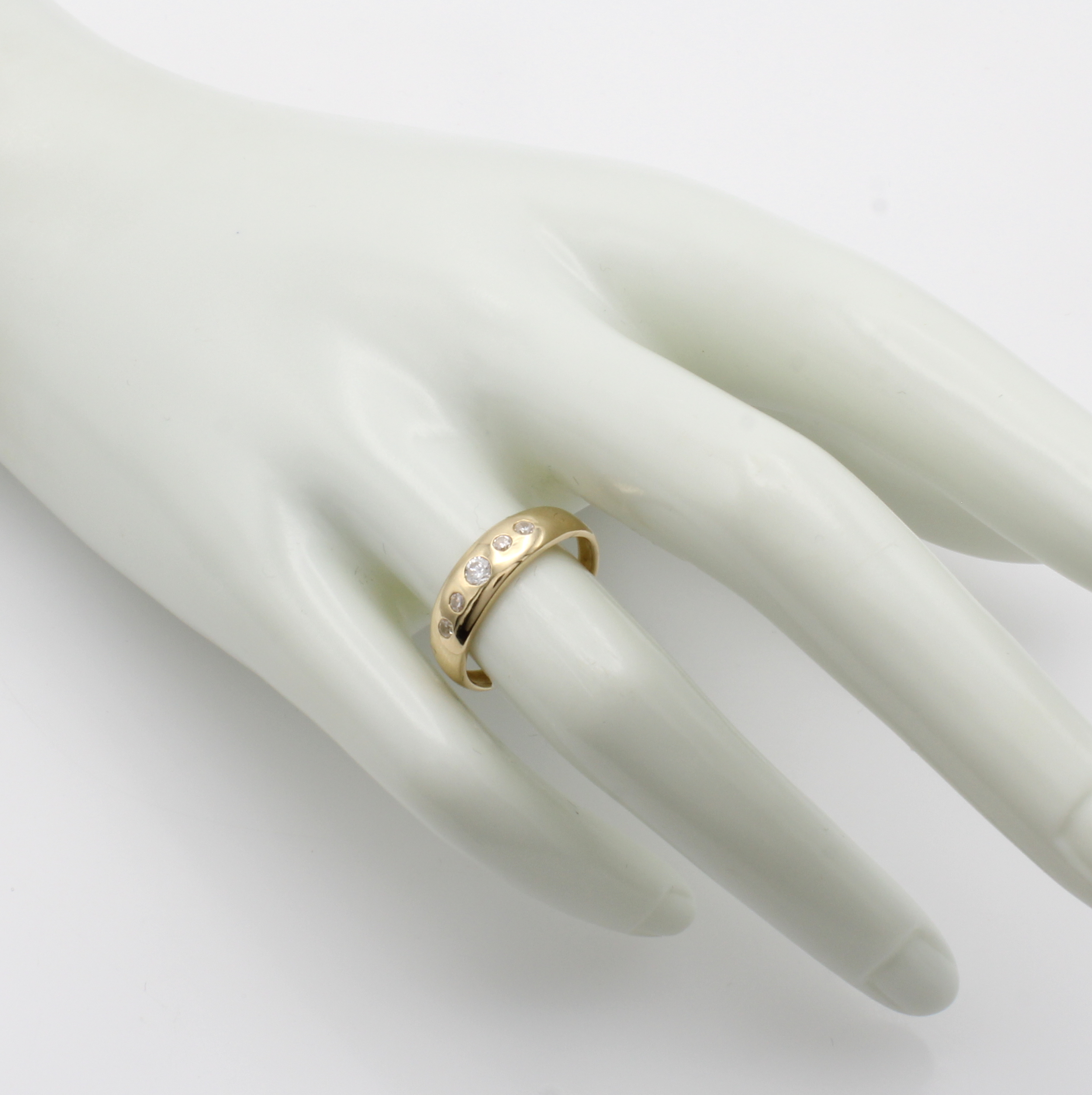 Ring mit Zirkonias, GG 585/000, 5 Zirkonias in Schiene eingelassen, RW ca. 53 Schätzpreis: 490, - EUR