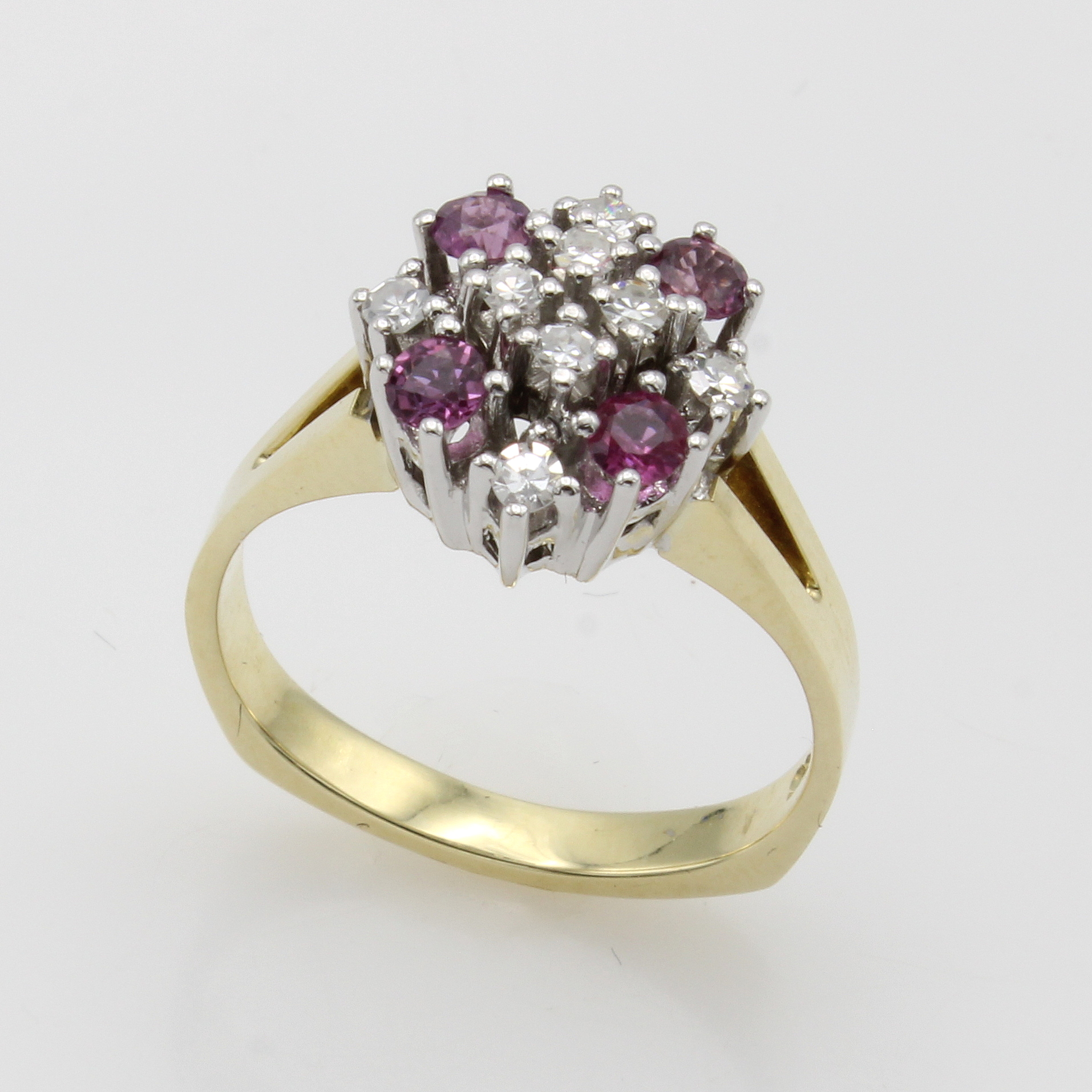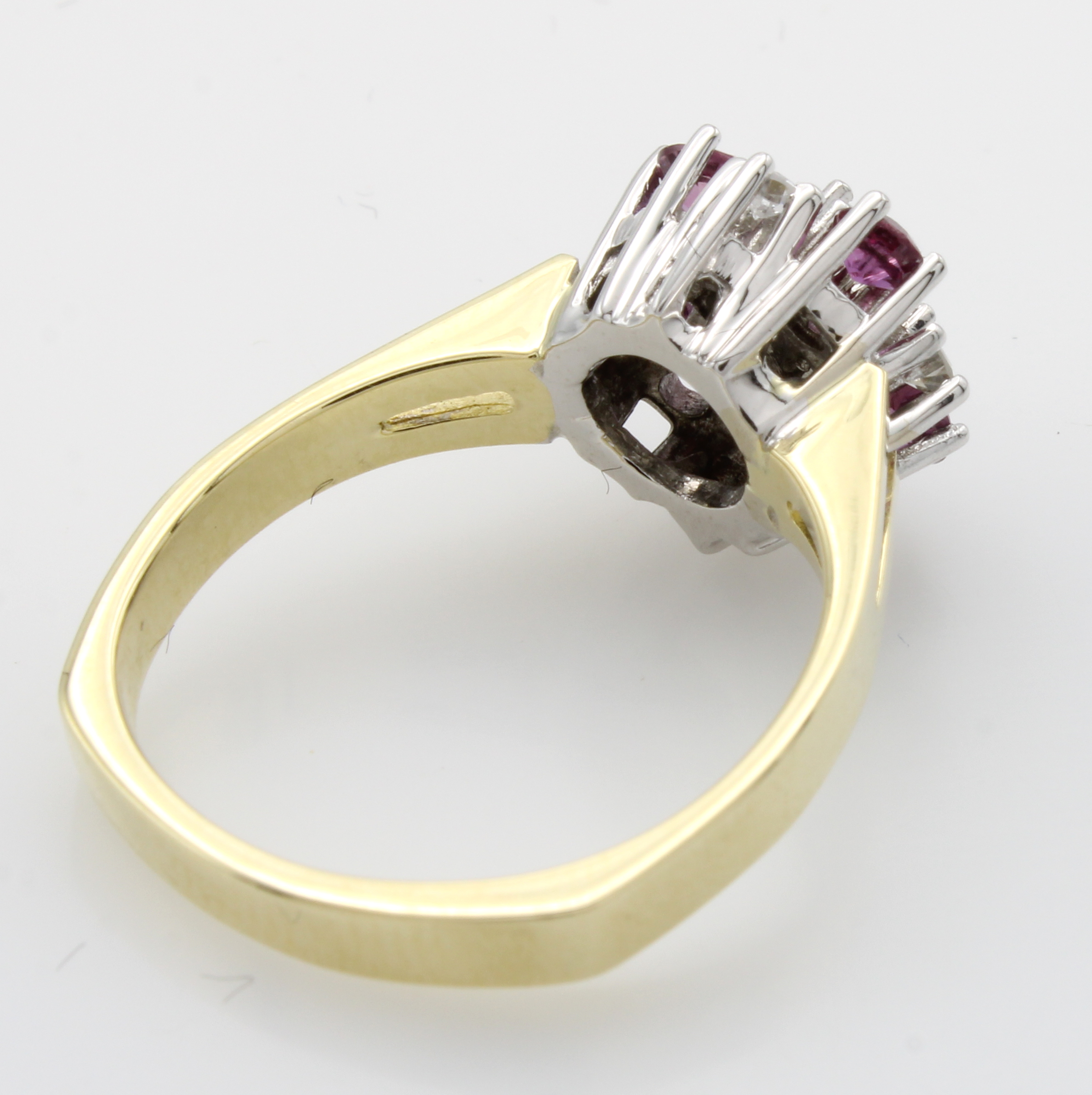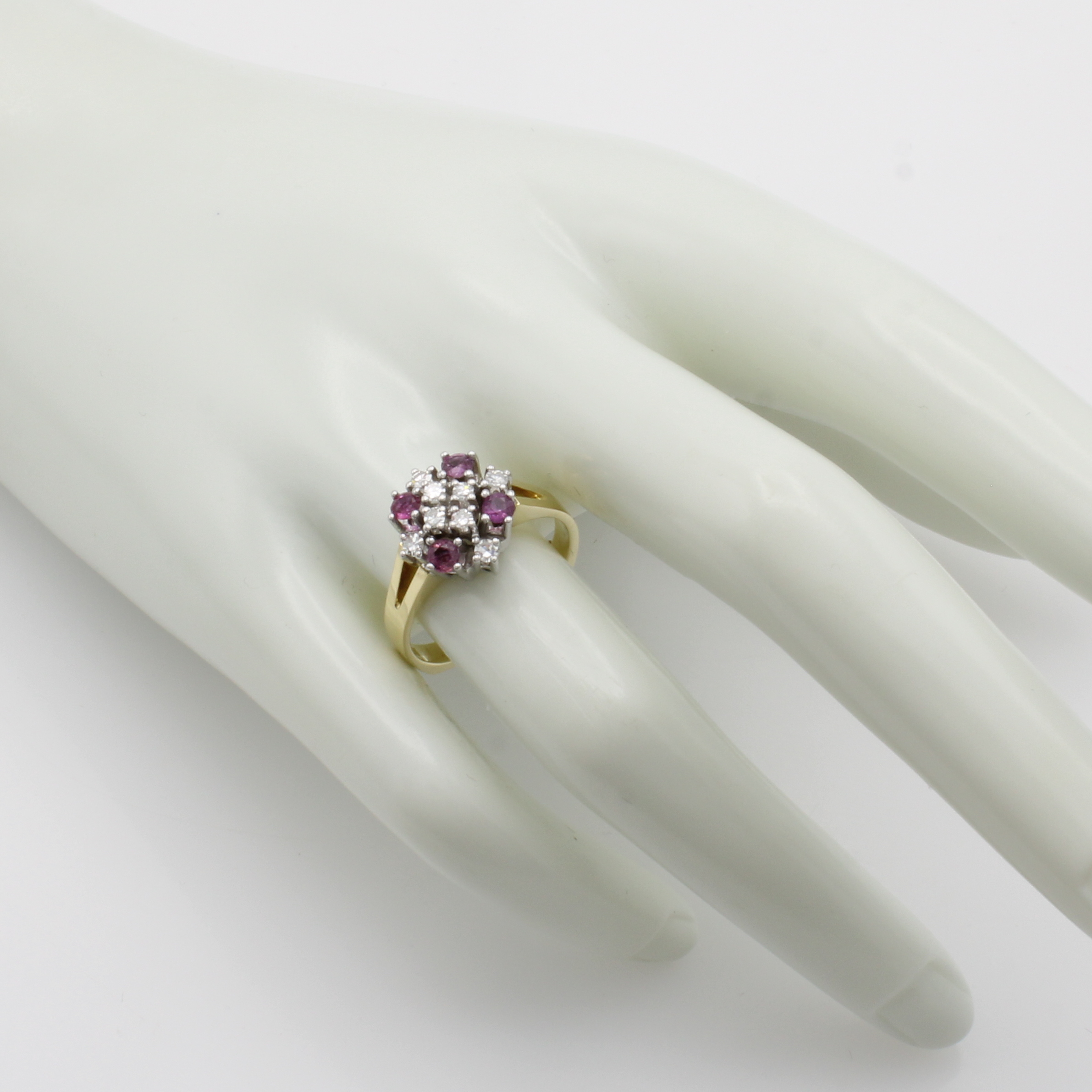 Ring mit Rubinen und Brillanten, GG/WG 585/ 000, 4 Rubine zus. ca. 0.60 ct, 8 Brill. zus. ca. 0.40 ct feines Weiß/vs-si, RW ca. 56 Schätzpreis: 1980, - EUR