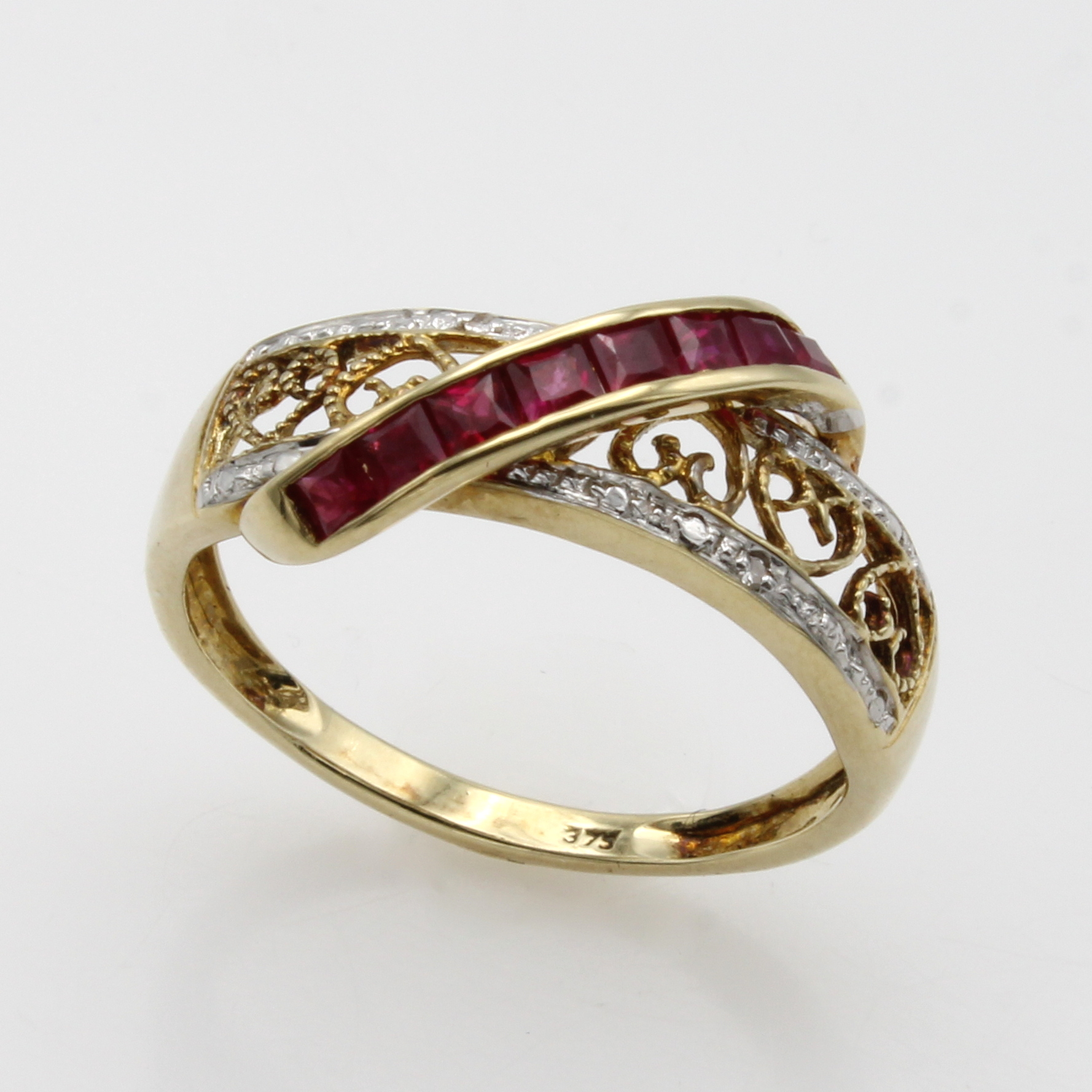Ring mit Rubinen und Diamanten, GG 375/000, Rubincarrées zus. ca, 0.30 ct, Diam. zus. ca. 0.01 ct Braun/si, RW ca. 56 Schätzpreis: 480, - EUR