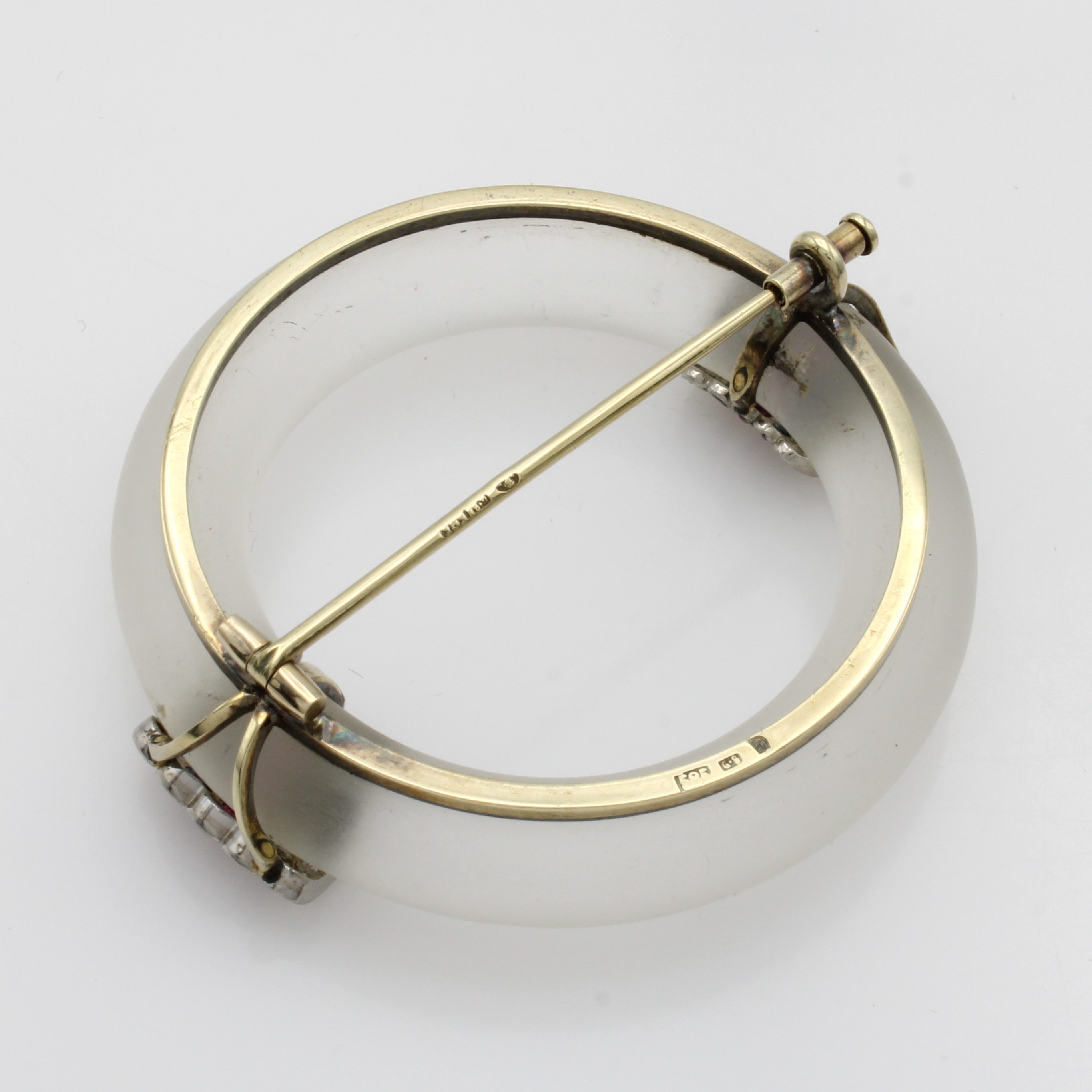 Brosche mit Diamanten und Farbsteinen, GG/WG 750/000, matt. Glasring, Rubin- u. Saphir- carrées zus. ca. 0.54 ct, Diam. zus. ca. 0.42 ct feines Weiß/si Schätzpreis: 4800, - EUR