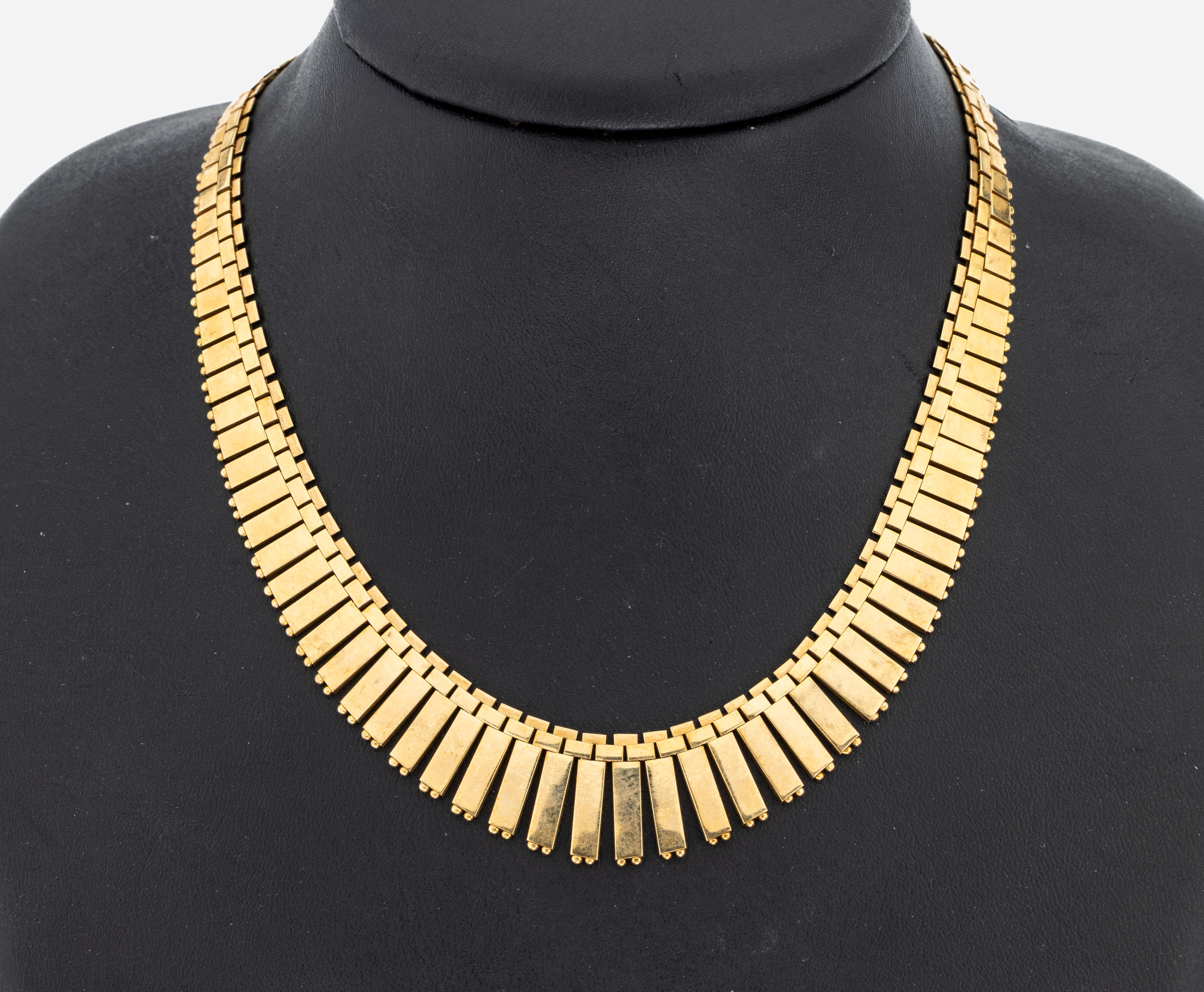 14 kt Gold Collier, GG 585/000 bewegl. Stäbchen im Verlauf, L. ca. 43 cm, Kastenschloss mit 2 Sicherheitsachten, ca. 36.4 g