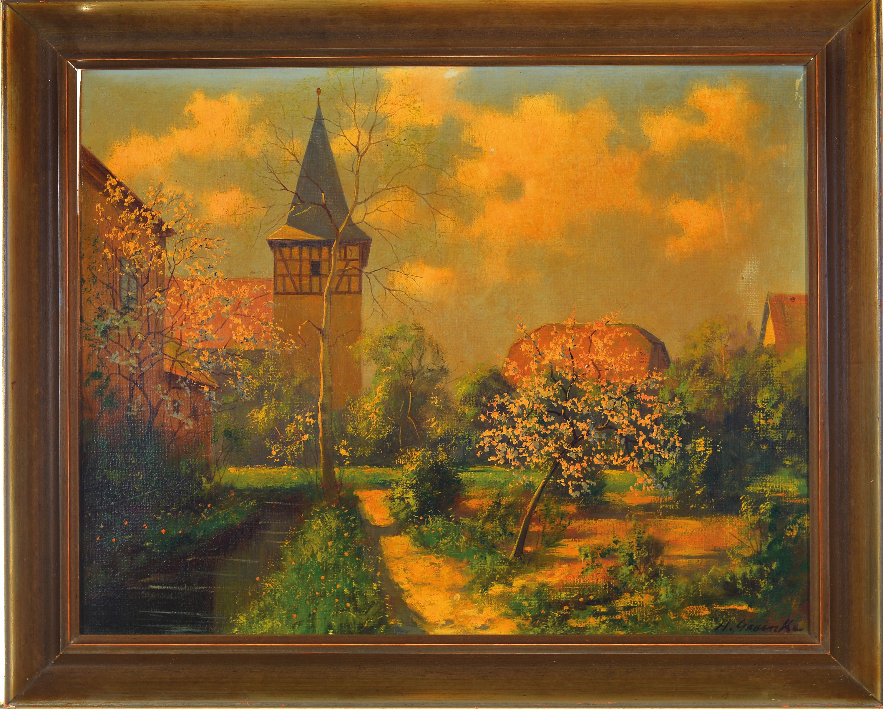 Hans Greinke, 1891 Berlin-1960 Weimar, Blick auf einen Kirchturm und einen blühenden