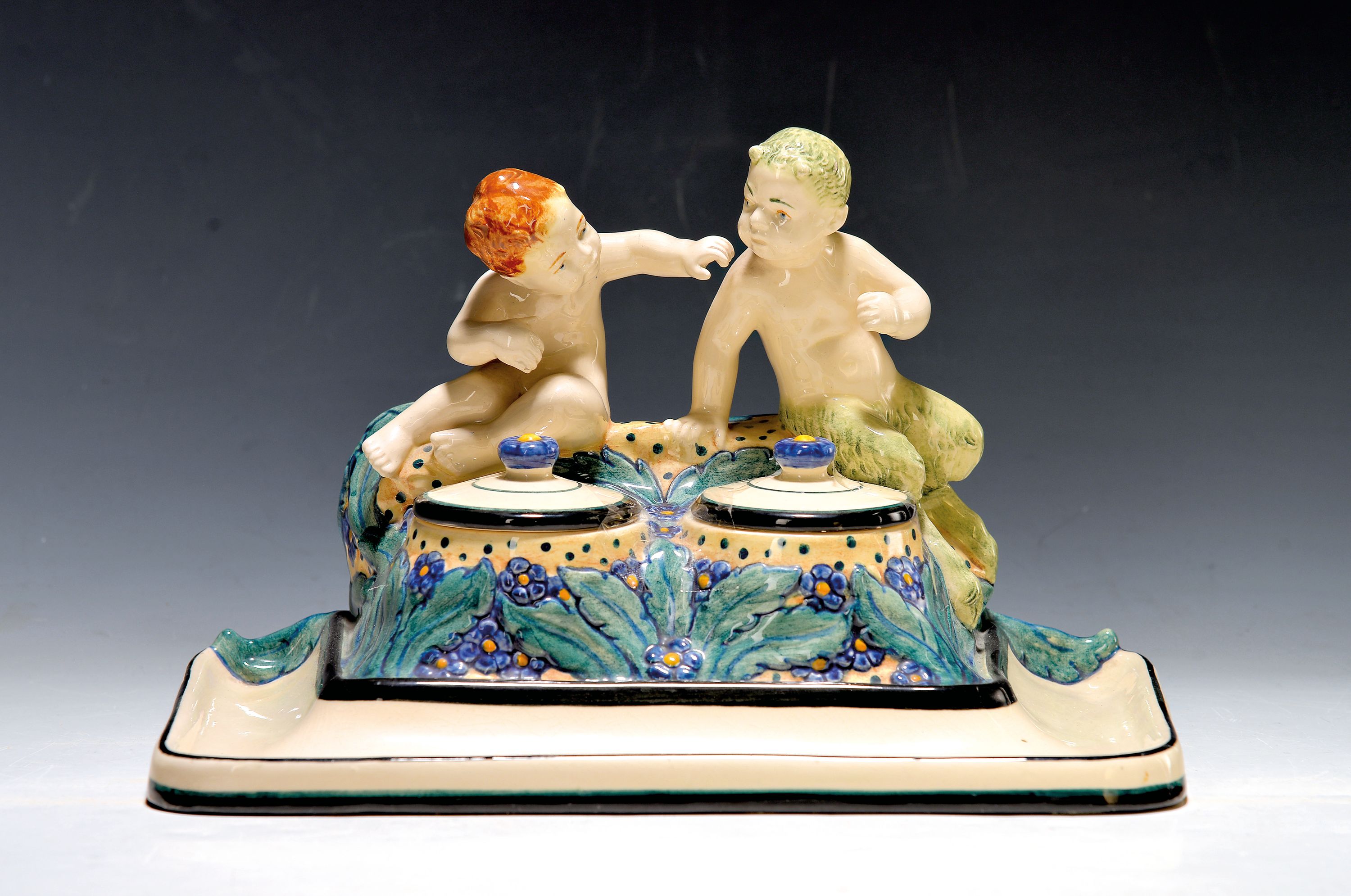 Tintenzeug, Karlsruher Majolika, Nr. 1157, Entwurf Wilhelm Süs, mit zwei vollplastischen