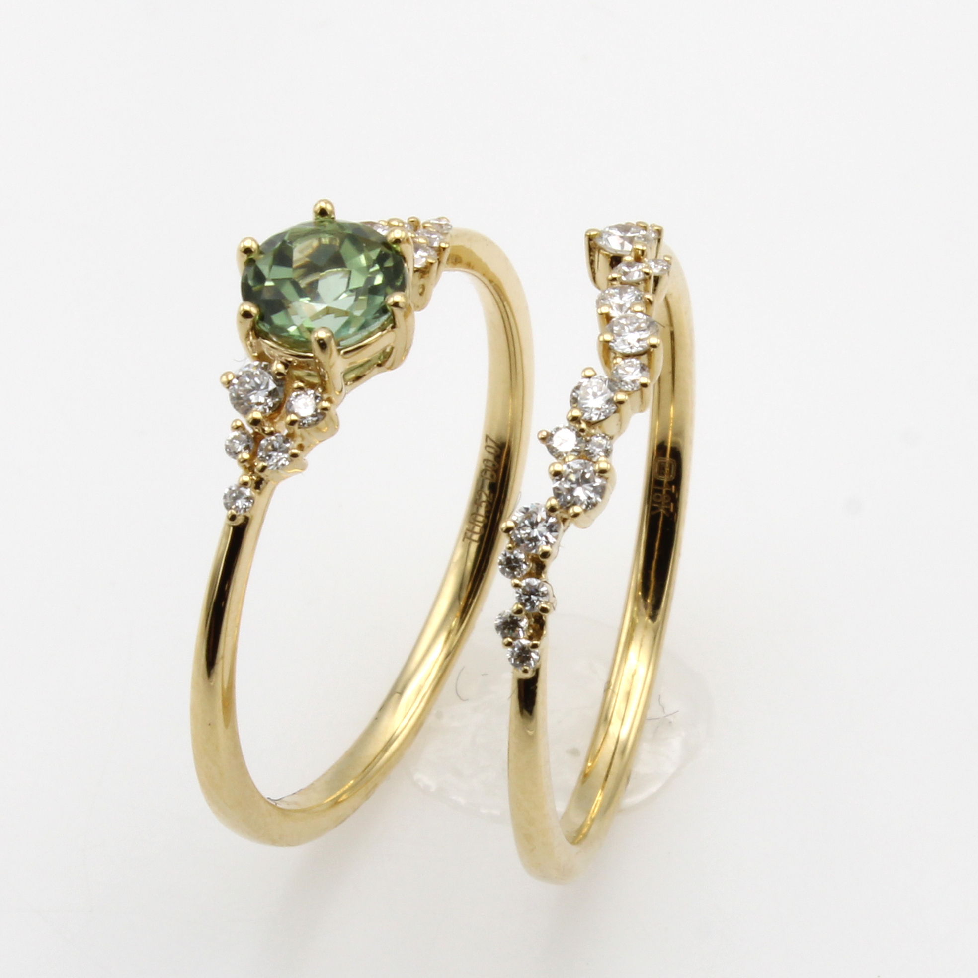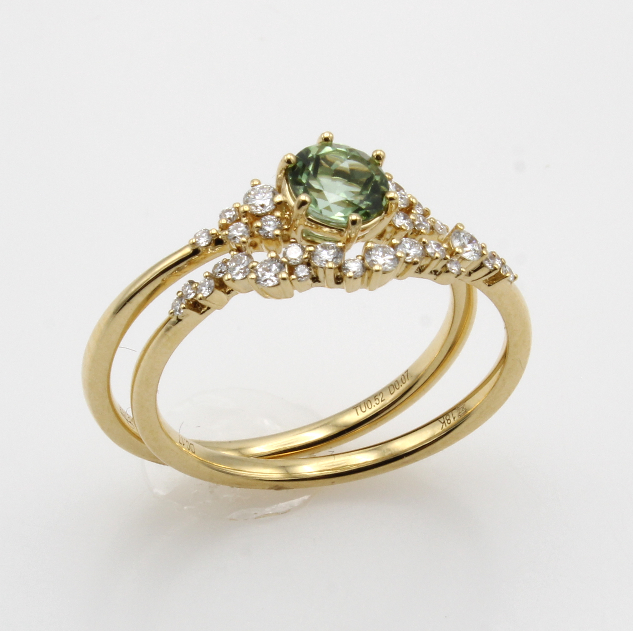 Ringset mit Turmalin und Brillanten, GG 750/000, Turmalin ca. 0.52 ct u. Brill. zus. ca. 0.24 ct feines Weiß/vs, RW ca. 54, Ringe auch einzeln zu tragen Schätzpreis: 3100, - EUR
