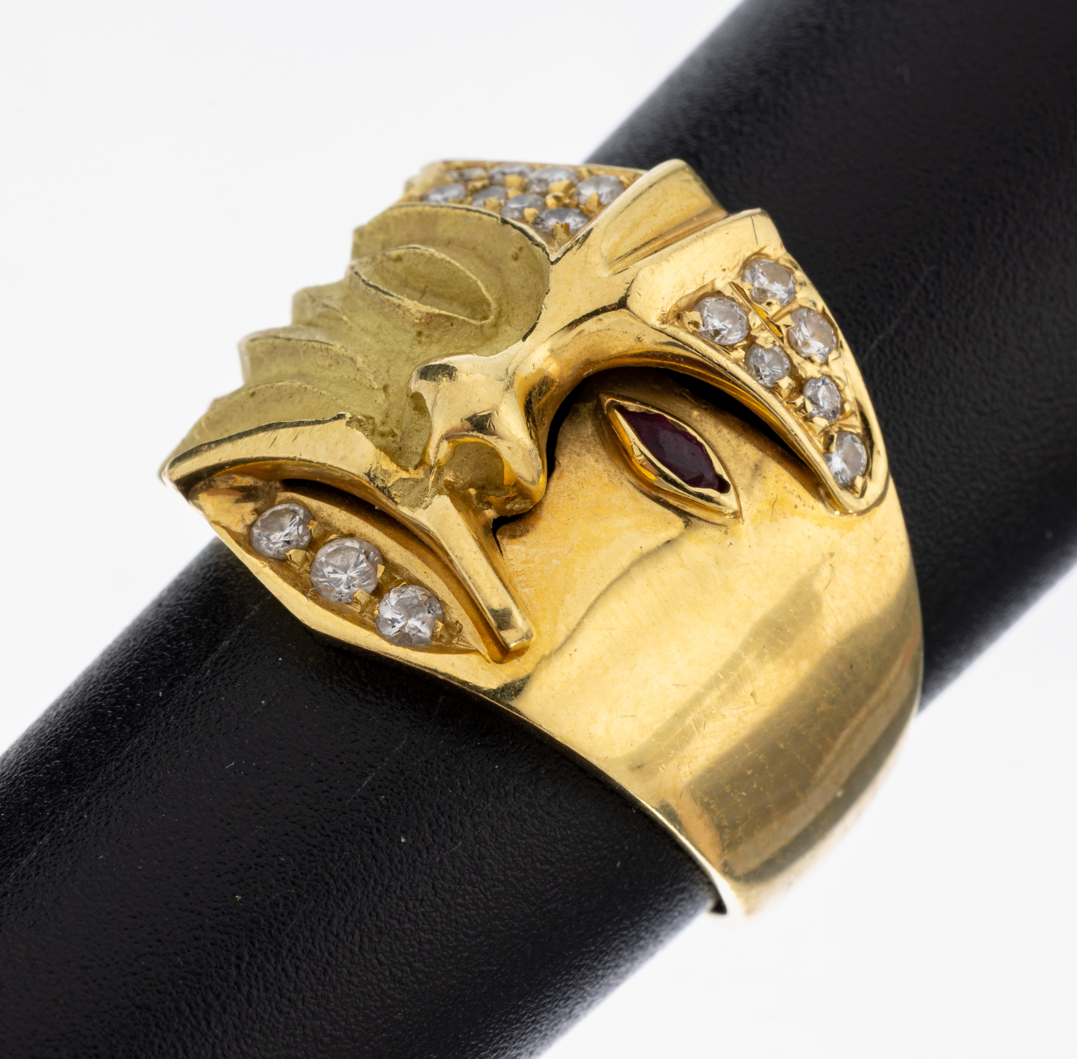 einer Maske, z.T. matt. und pol., 17 Brillanten zus. ca. 0.20 ct Weiß/p, 1 Rubinnavette