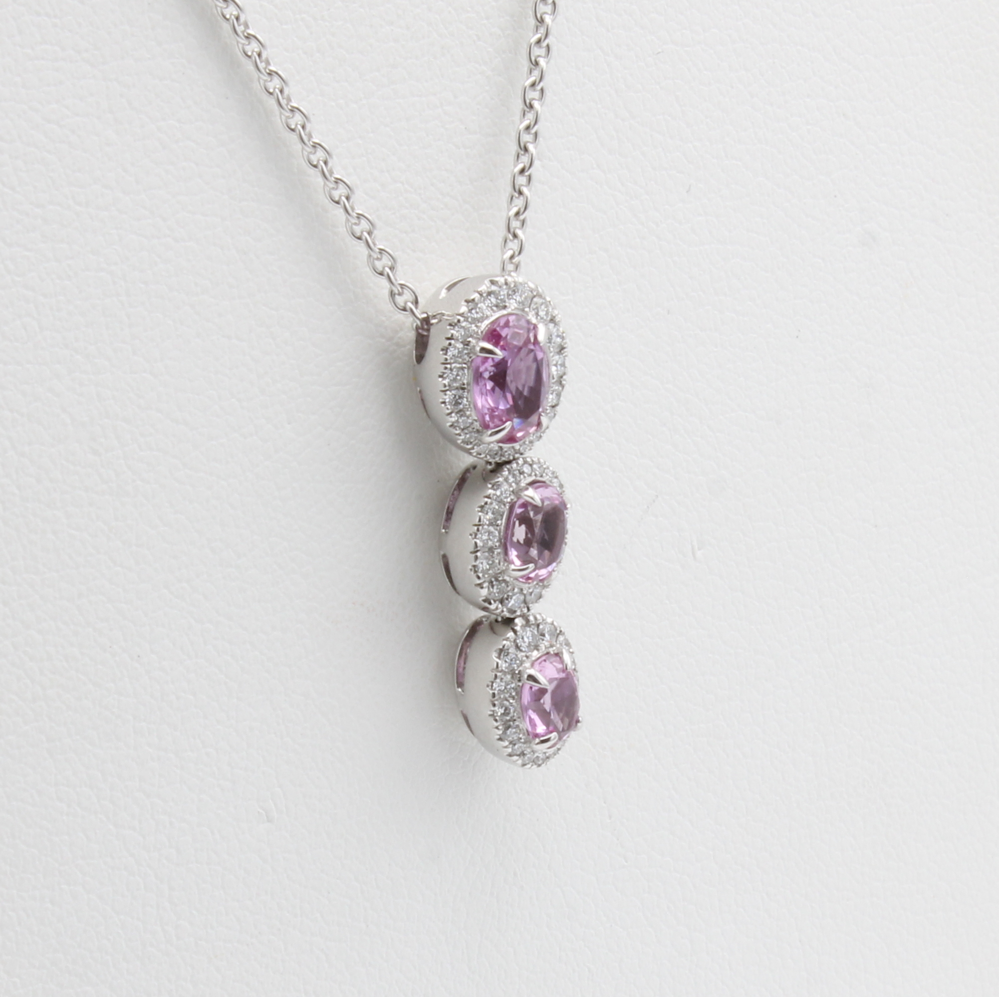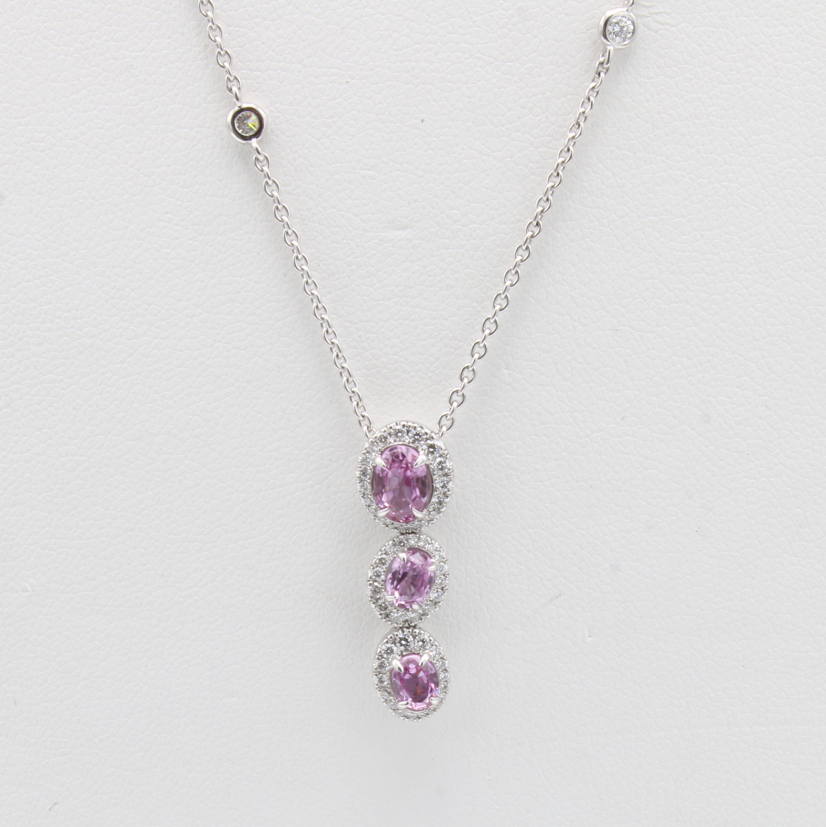 Anhänger mit Saphiren und Brillanten, WG 750/000, 52 Brill. z.T. in Kette integriert zus. ca. 0.21 ct feines Weiß/vs, 3 pinkfarb. Saphire zus. ca. 1.27 ct, L. ca. 42 cm Schätzpreis: 7720, - EUR