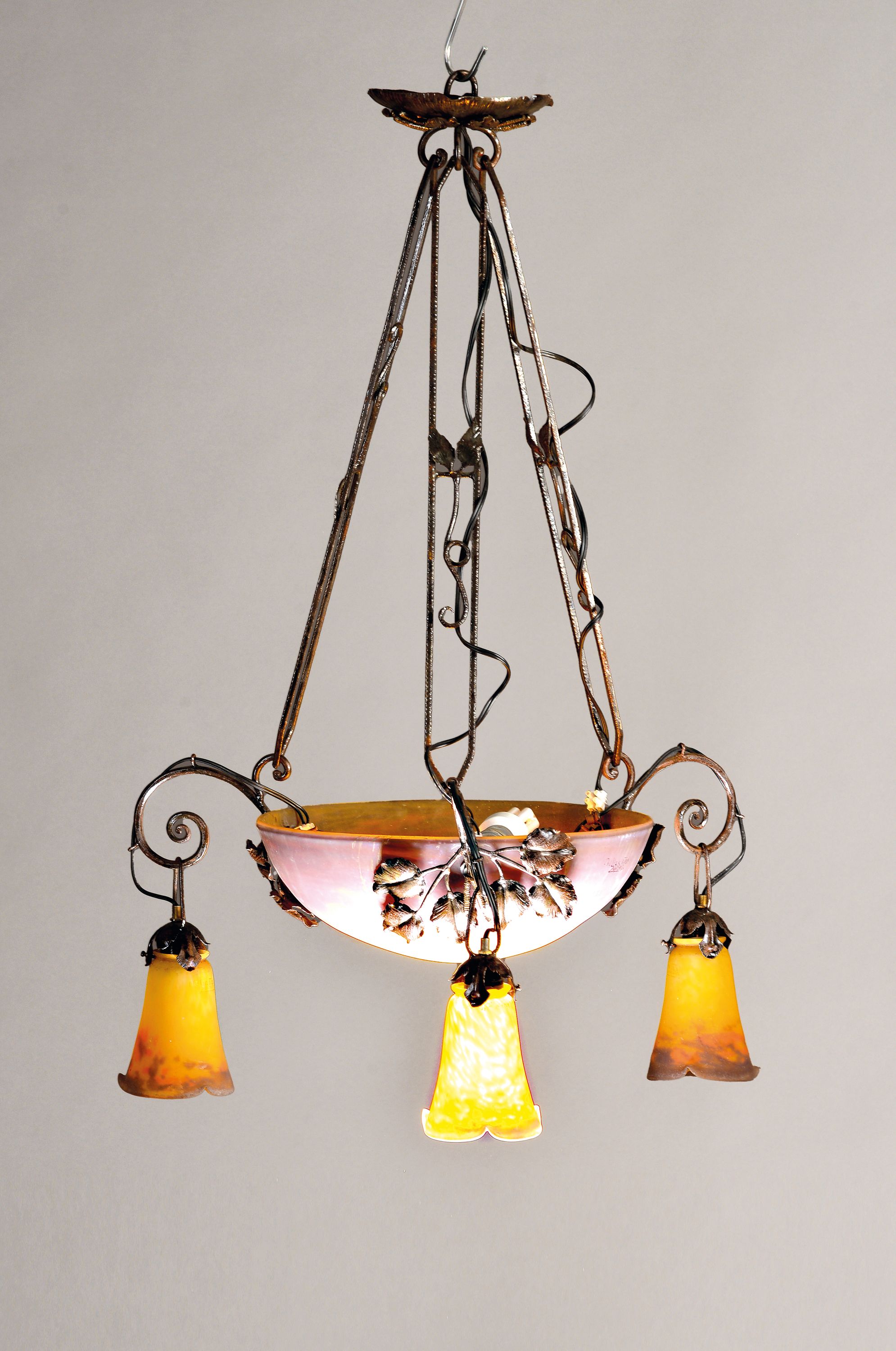 Deckenleuchte, Muller Freres Lunéville, 1920er Jahre, Eisenmontur mit Blätterdekor,