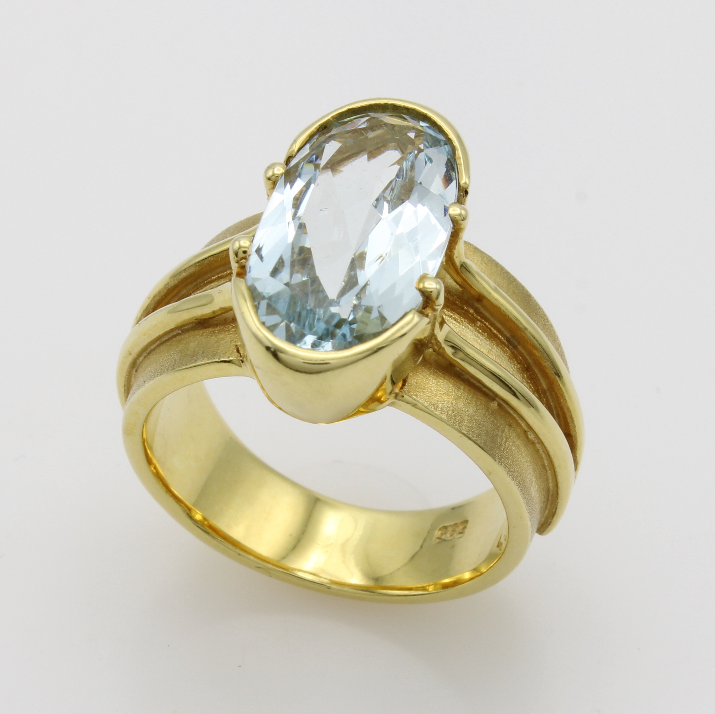 Ring mit Aquamarin, GG 585/000, ovaler Aquam. ca. 4.5 ct, Ringschultern matt. m. aufgel. Goldstreifen, RW ca. 57 Schätzpreis: 5400, - EUR
