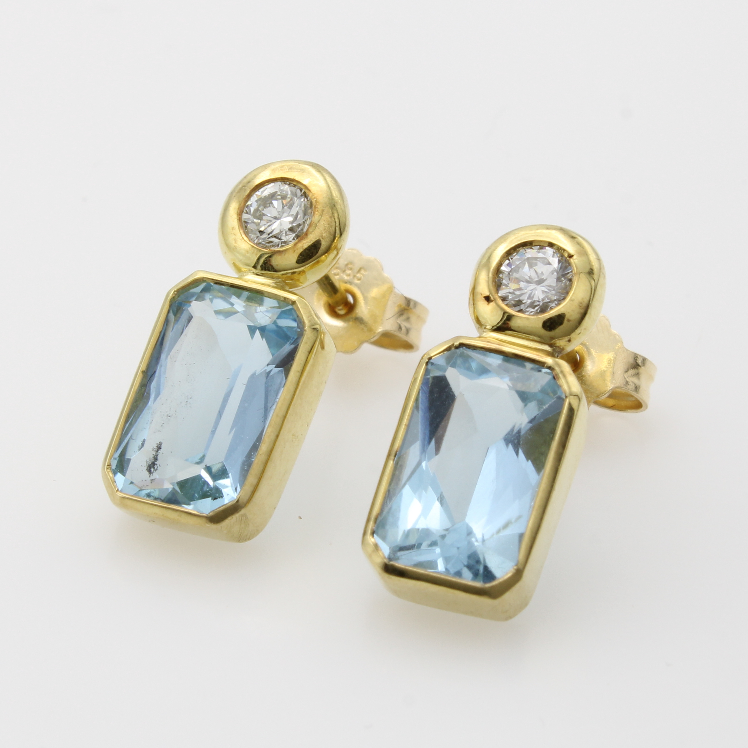 Paar Ohrstecker mit Aquamarinen und Brillanten, GG 585/000, 2 achteckige Aquam. zus. ca. 4.55 ct, 2 Brill. zus. ca. 0.34 ct Weiß/si Schätzpreis: 3750, - EUR