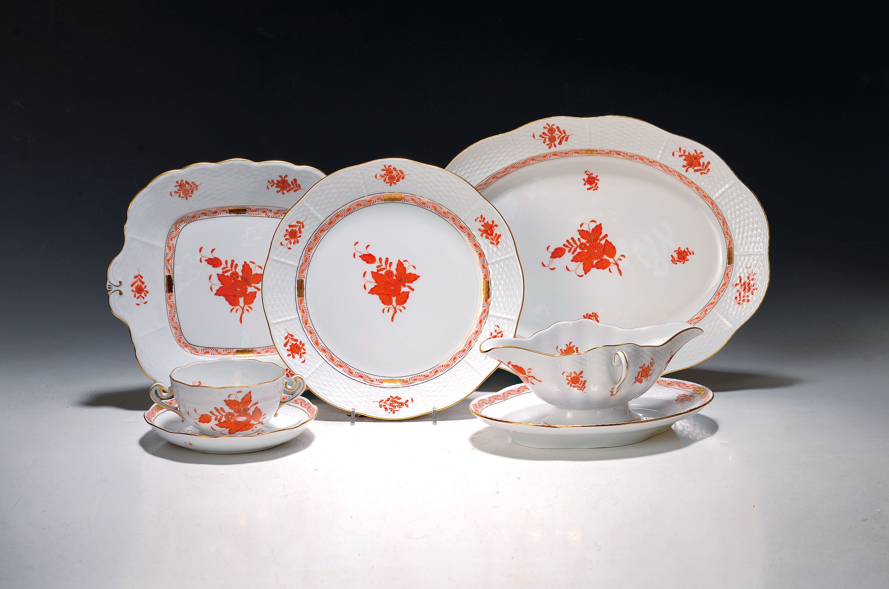 Speiseservice für 12 Personen, Herend Ungarn, Dekor Apponiy eisenrot, 12 flache