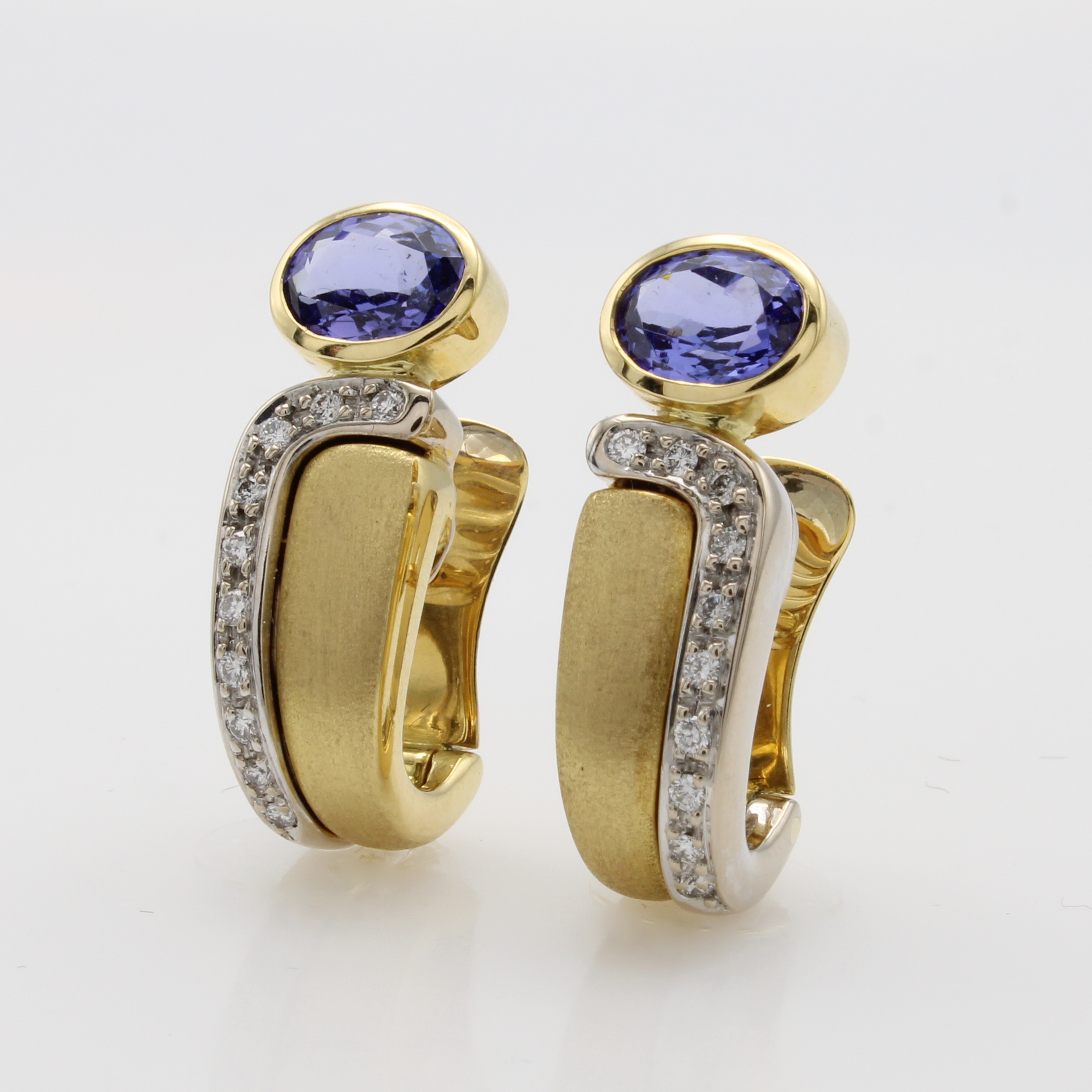 Paar Steckcreolen mit Tansaniten und Brillanten, GG 585/000, z.T. matt., 2 ovale Tansanite zus. ca. 2.57 ct, Brill. zus. ca. 0.25 ct Weiß/si Schätzpreis: 6980, - EUR