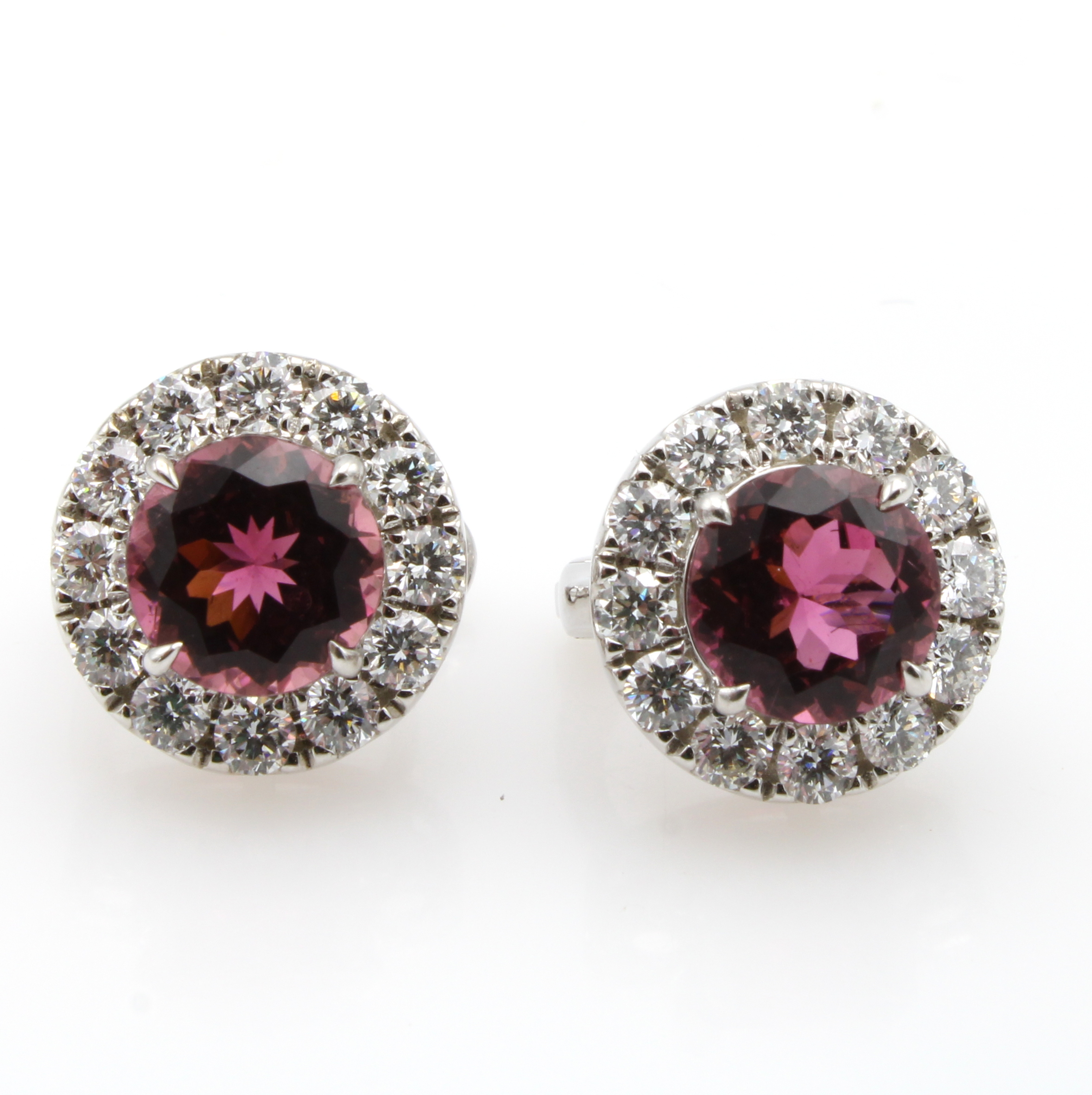 Paar Ohrstecker mit Rubelliten und Brillanten, WG 750/000, 2 Rubellite zus. ca. 4.18 ct, 24 Brill. zus. ca. 1.55 ct feines Weiß/vs