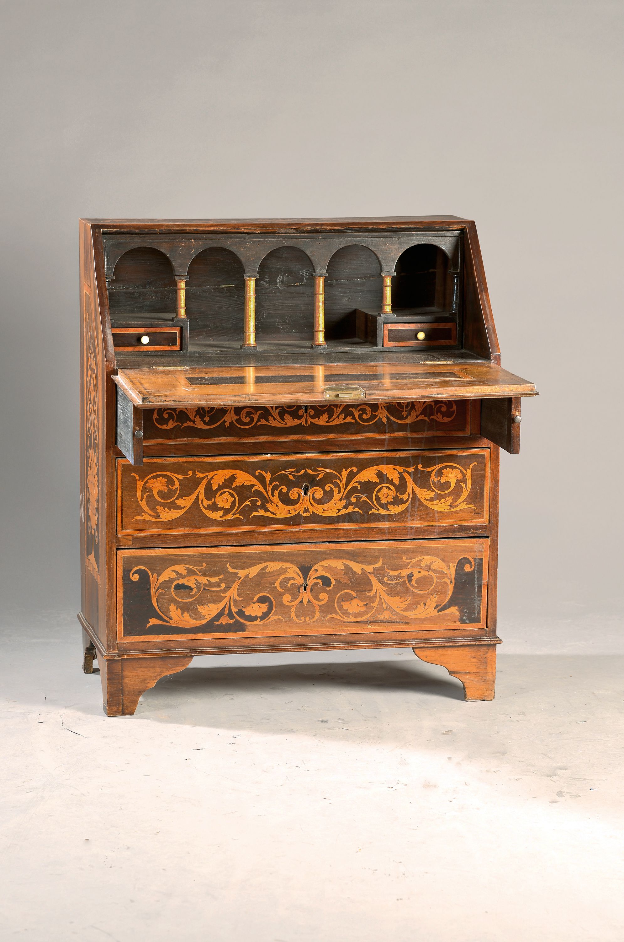 Schreibsekretär, Niederlande, 19.Jh., reiche Marketterie in verschiedenen Hölzern,