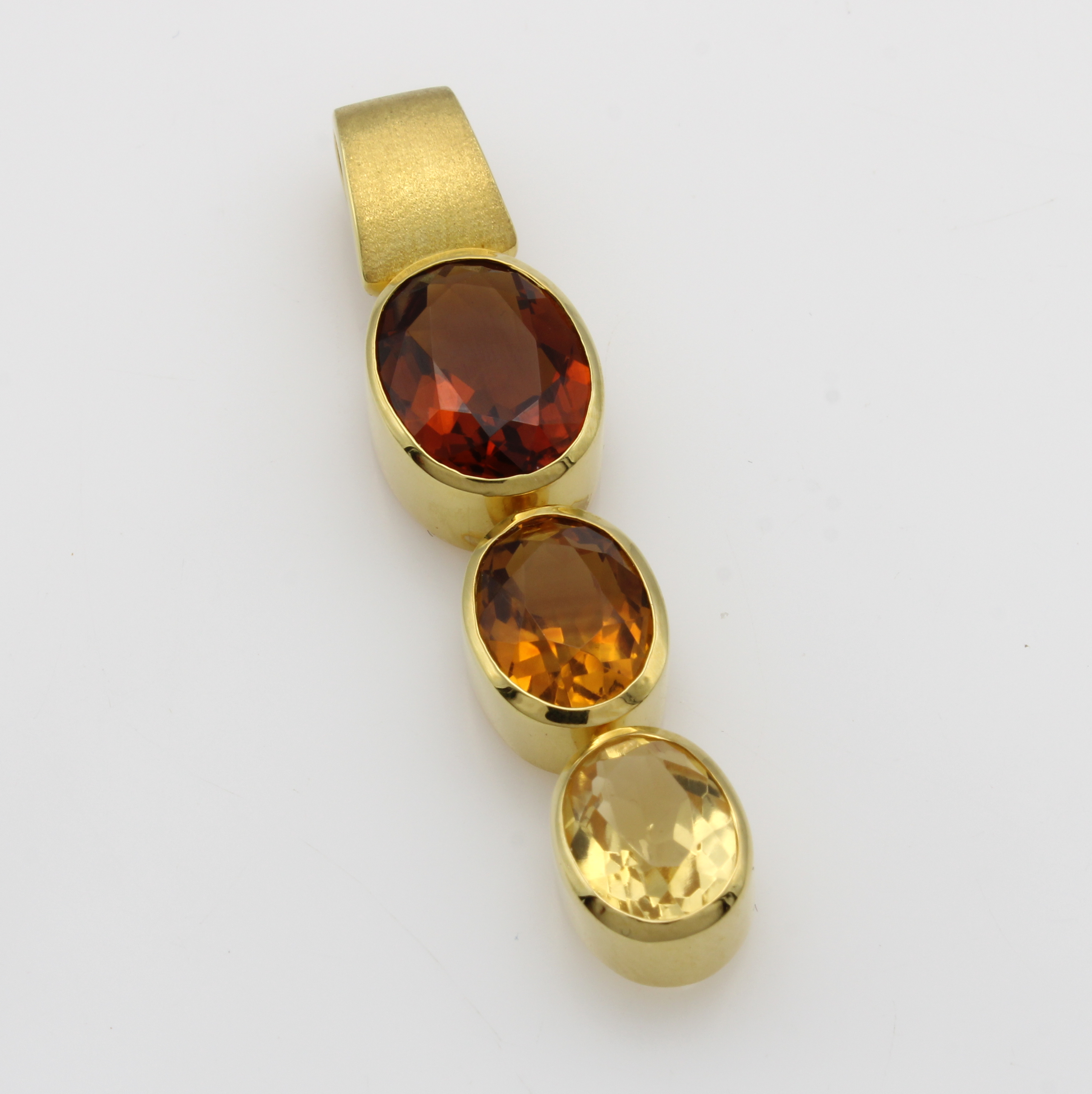 Anhänger mit Citrinen, GG 585/000, z.T. matt., 3 ovale Citrine in versch. Farbtönen zus. ca. 8 ct Schätzpreis: 3280, - EUR