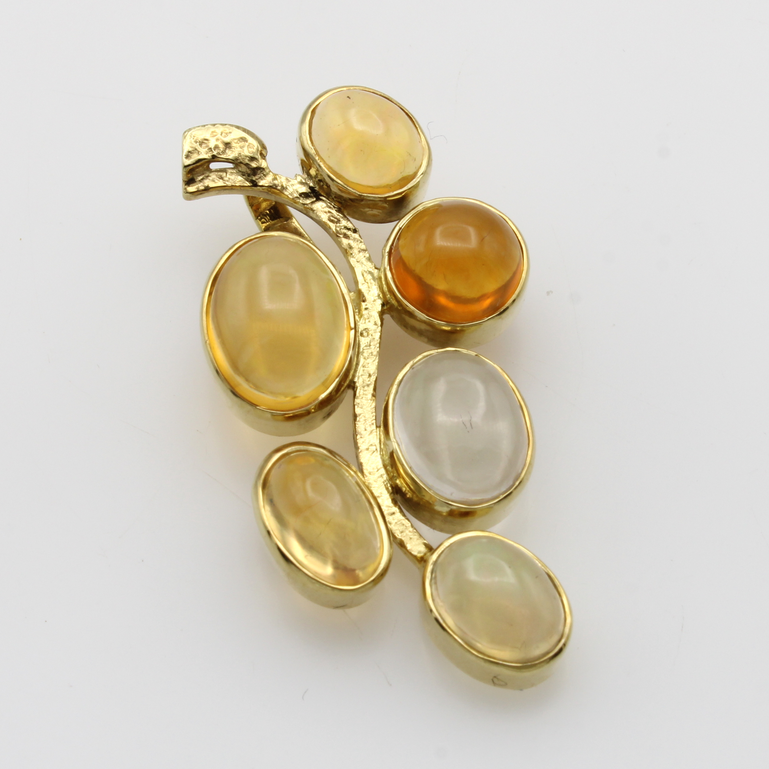 Anhänger mit Feueropalen, GG 585/000, 6 Feueropalcabochons in versch. Farbtönen zus. 6.8 ct Schätzpreis: 2750, - EUR