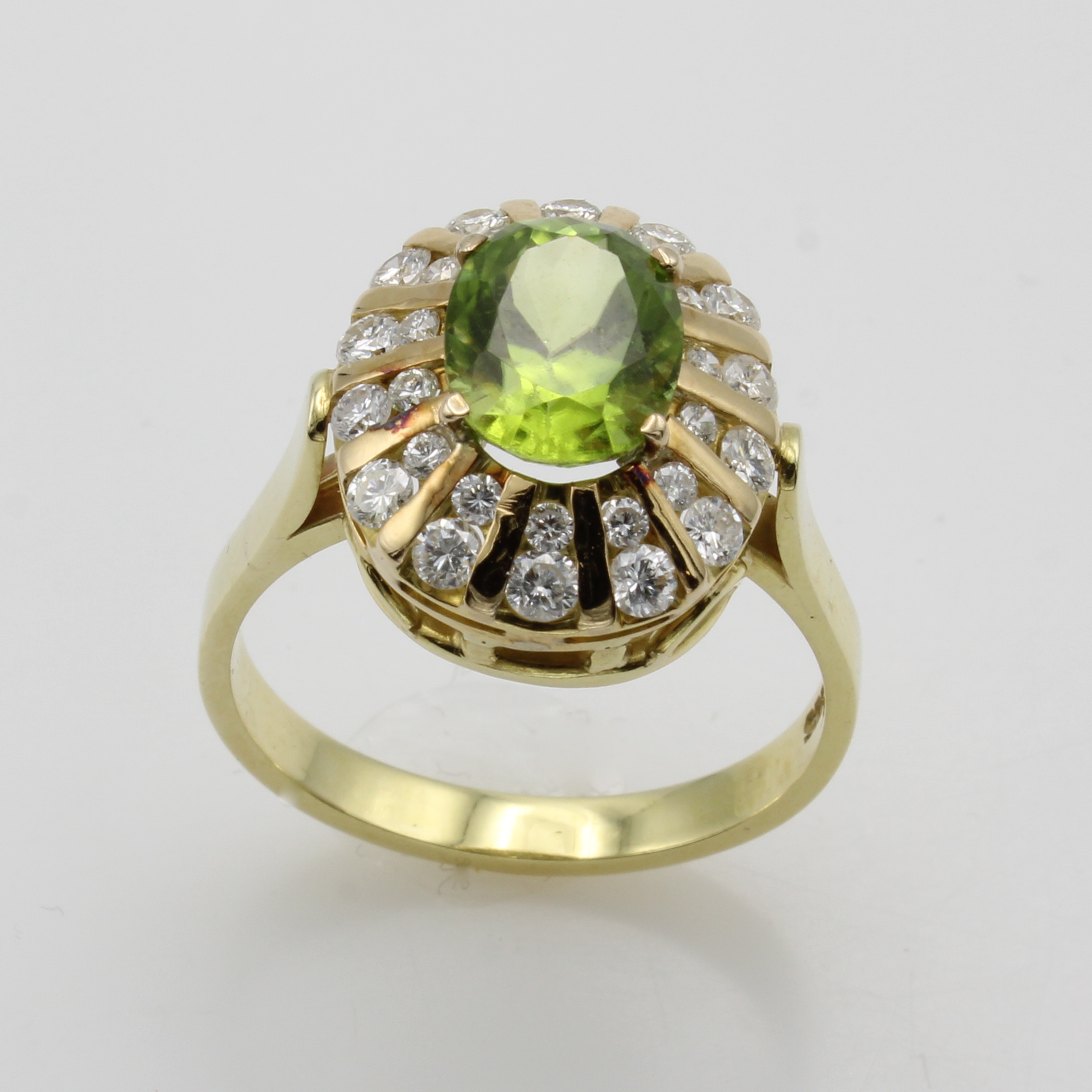 Ring mit Peridot und Brillanten, GG 585/000, ovaler Peridot ca. 2.45 ct, Brill. in 2 Reihen gef. zus. ca. 0.60 ct Weiß/si, RW ca. 59 Schätzpreis: 3750, - EUR